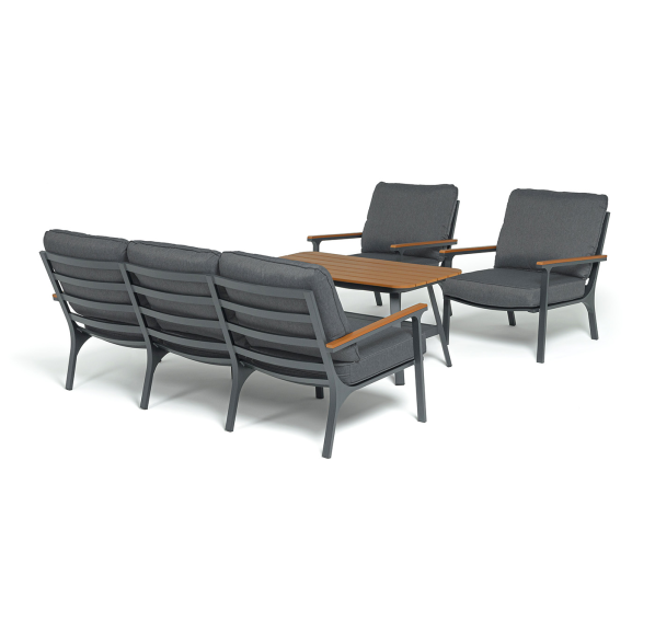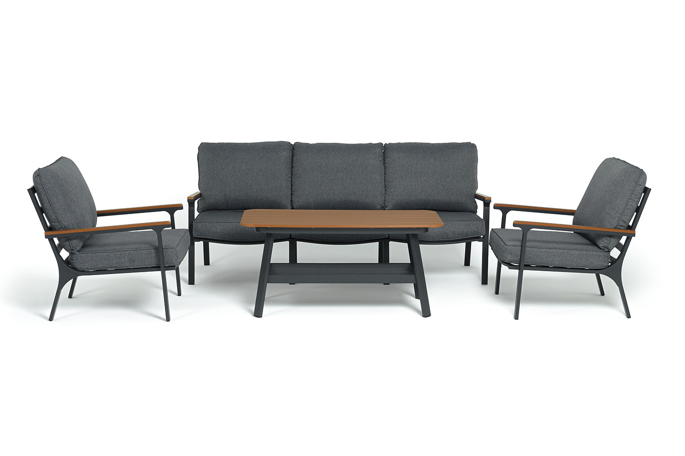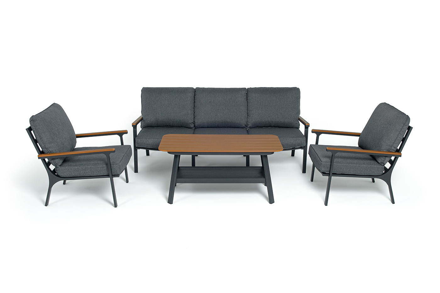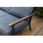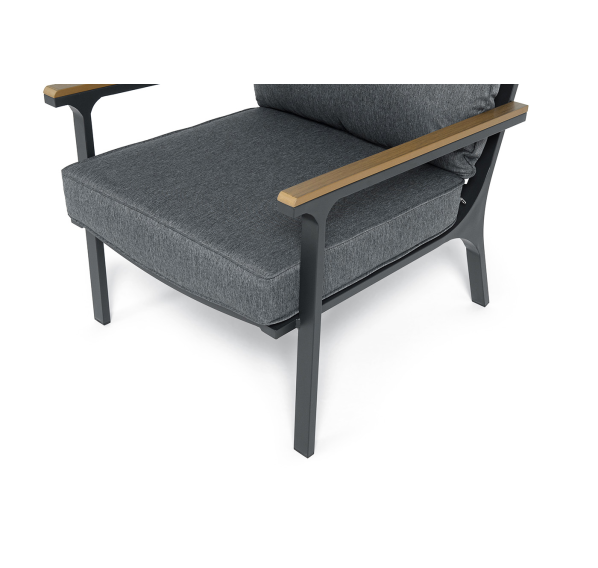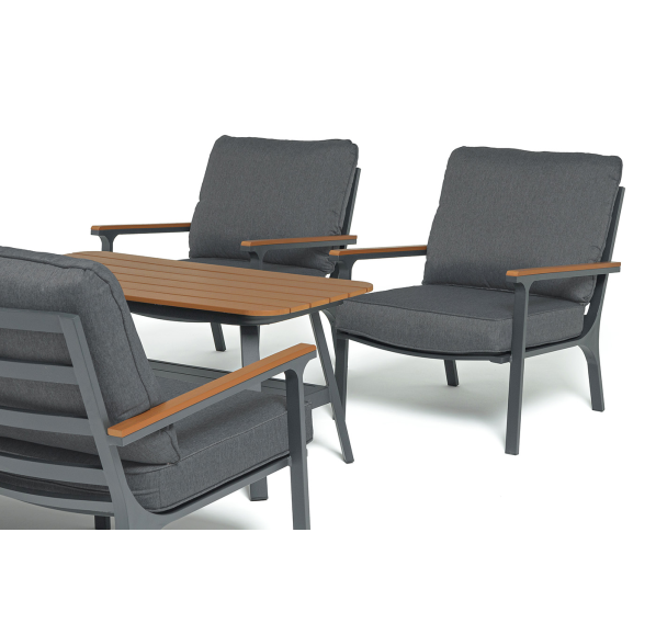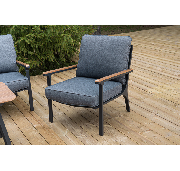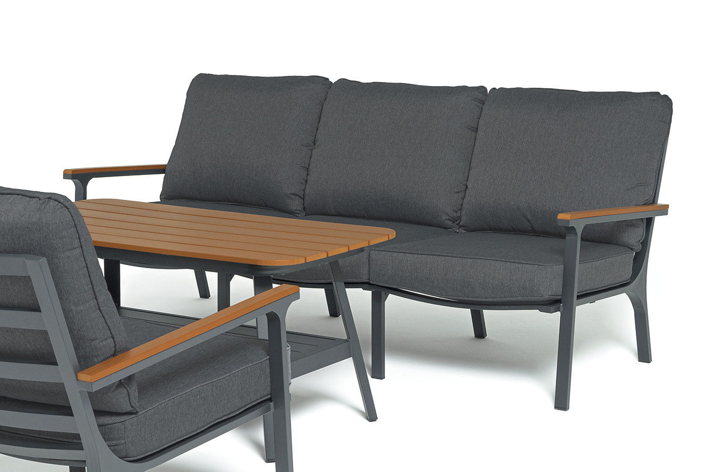 Каркас мебели выполнен из прочного алюминия темно-серого цвета. На подлокотниках дивана и двух кресел установлен облицовочный материал из древесно полимерного композита (ДПК) цвет «дерево». Крепление к каркасу осуществляется на болтах с пластиковыми заглушками темно-серого цвета, которые не ржавеют. Комплект дополняют подушки со съёмными чехлами. Материал чехлов - 100% полиэстер плотностью 190гр/м2.