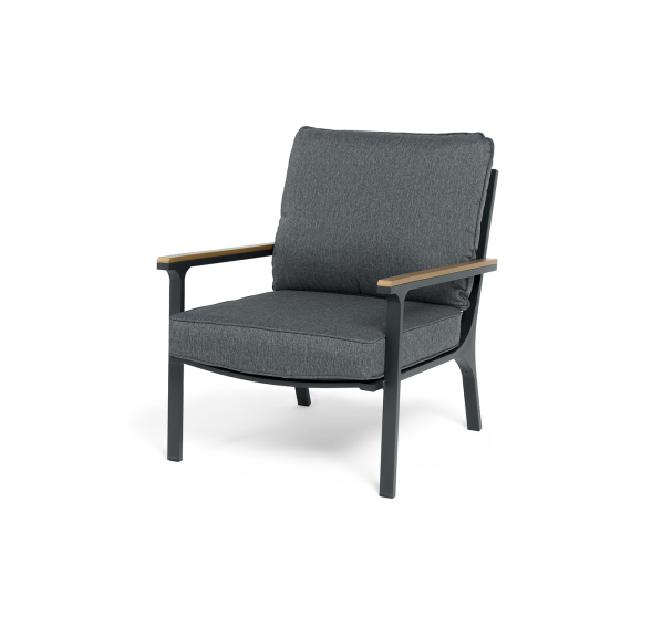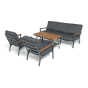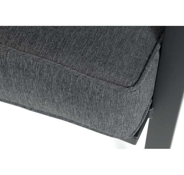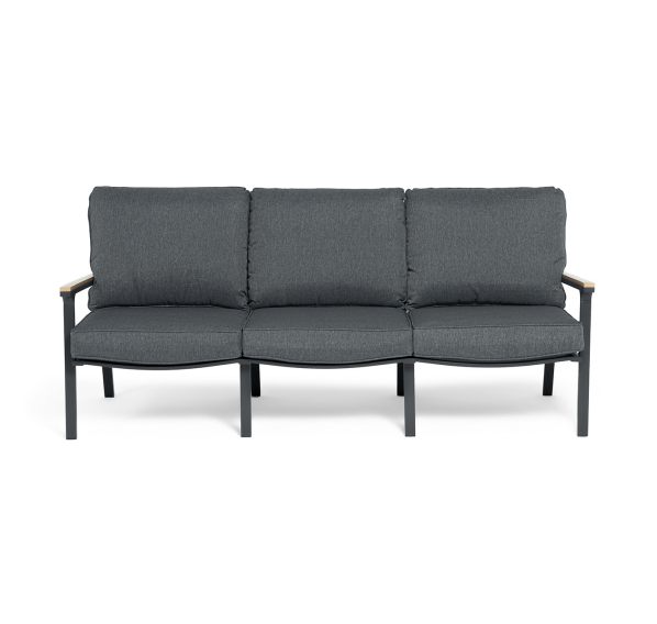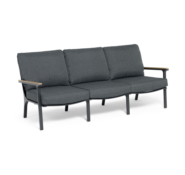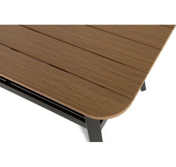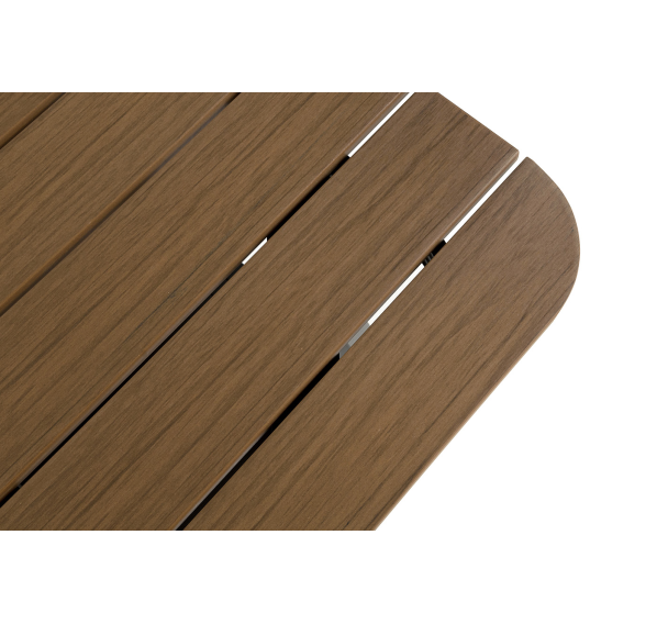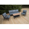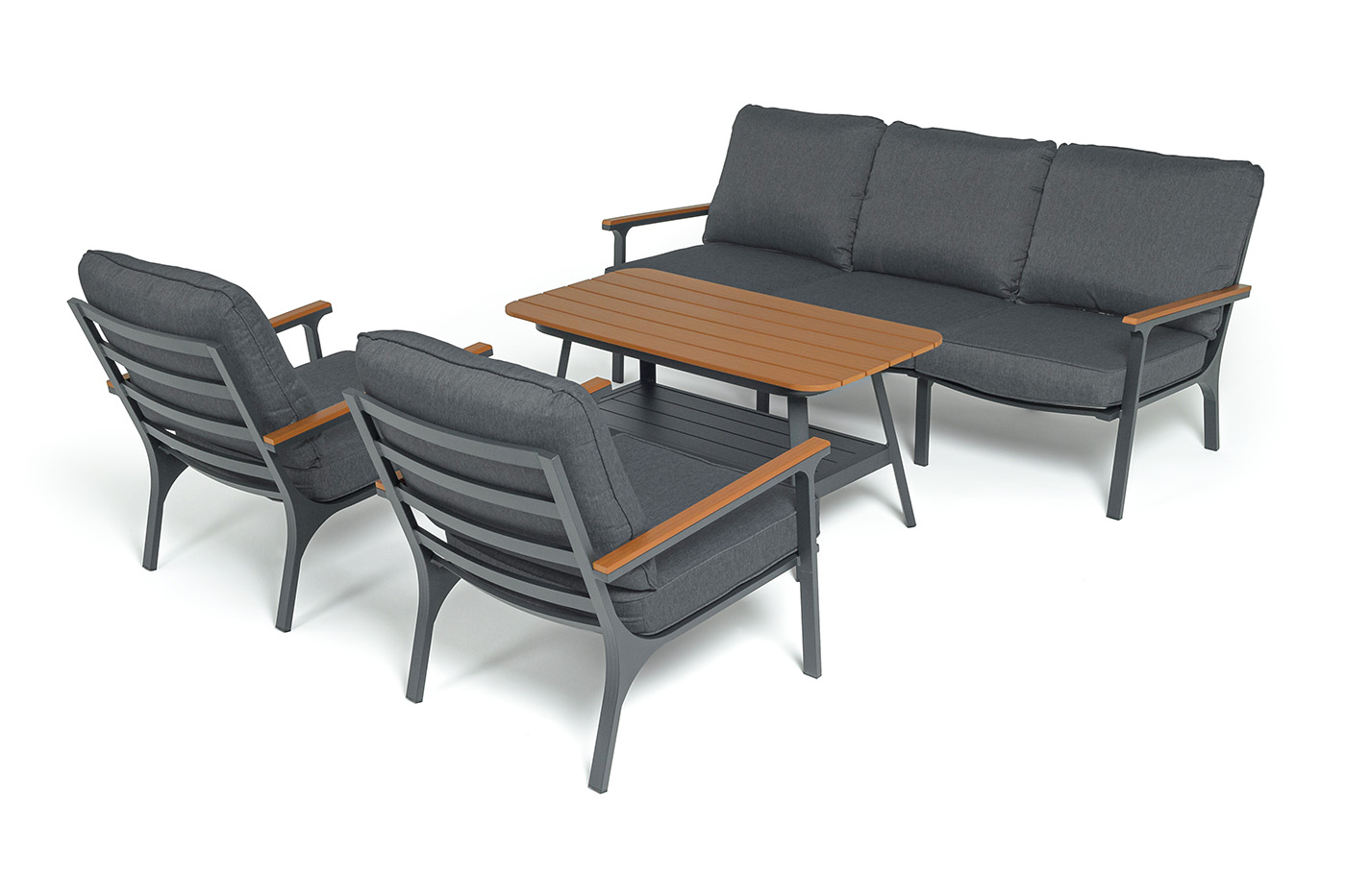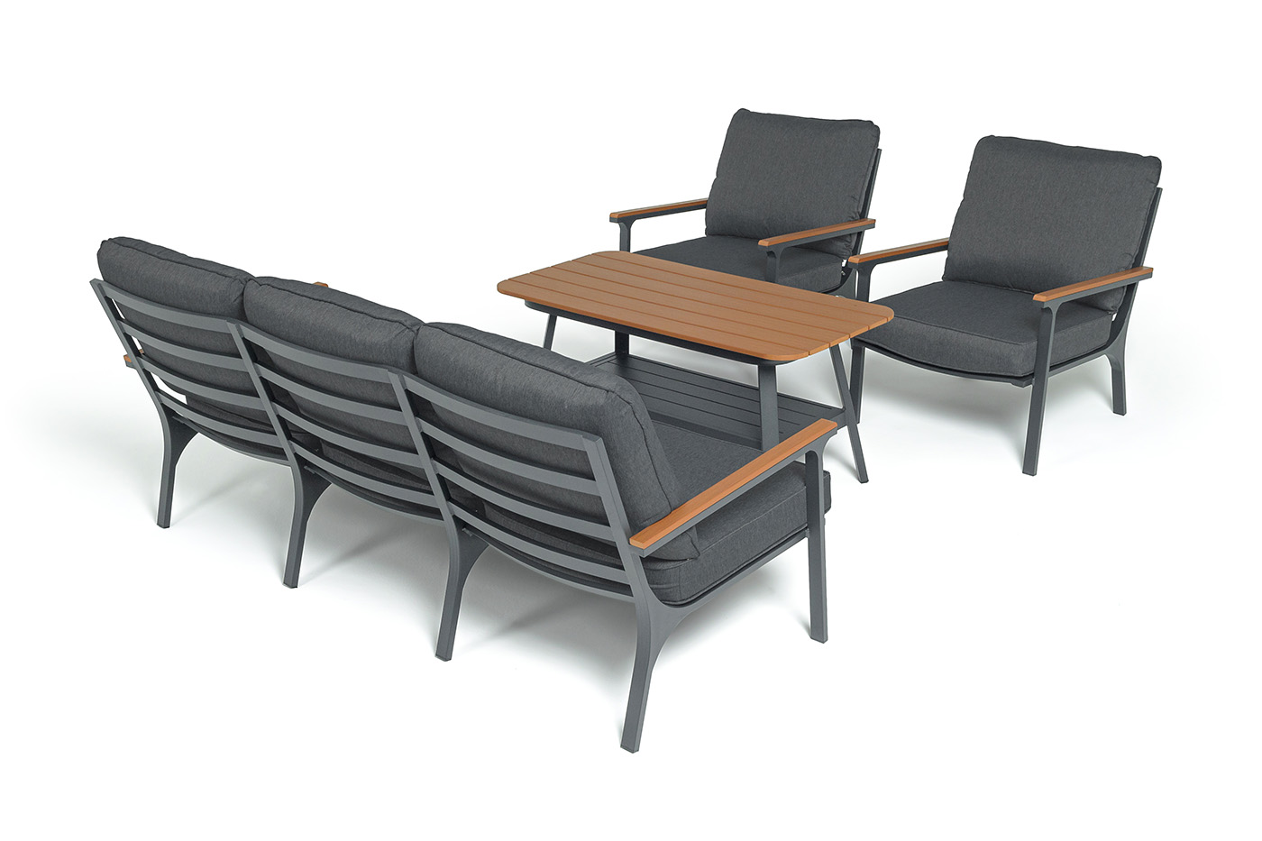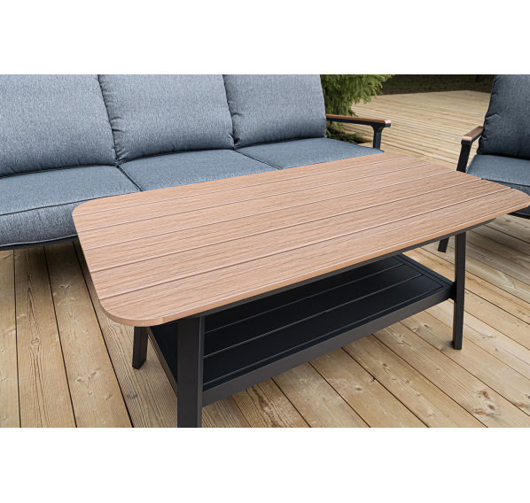 Каркас мебели выполнен из прочного алюминия темно-серого цвета. На подлокотниках дивана и двух кресел установлен облицовочный материал из древесно полимерного композита (ДПК) цвет «дерево». Крепление к каркасу осуществляется на болтах с пластиковыми заглушками темно-серого цвета, которые не ржавеют. Комплект дополняют подушки со съёмными чехлами. Материал чехлов - 100% полиэстер плотностью 190гр/м2.