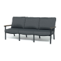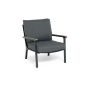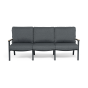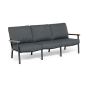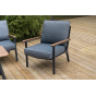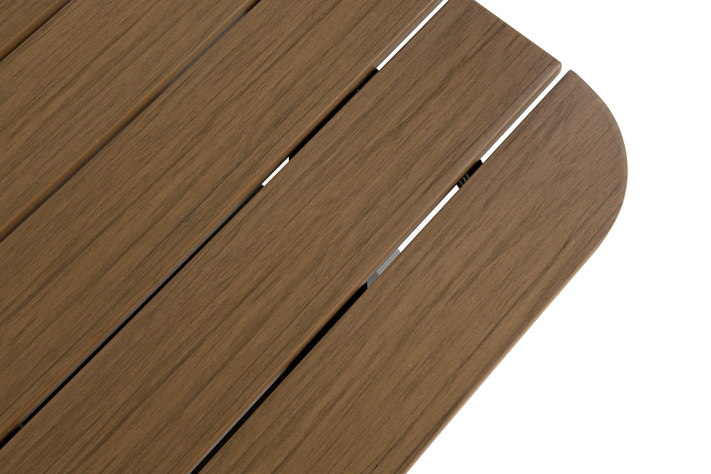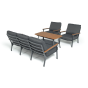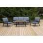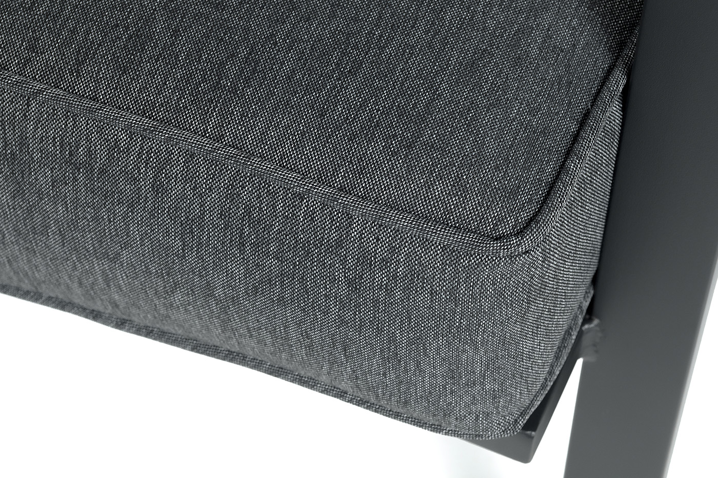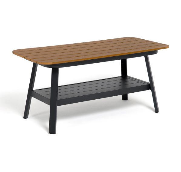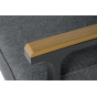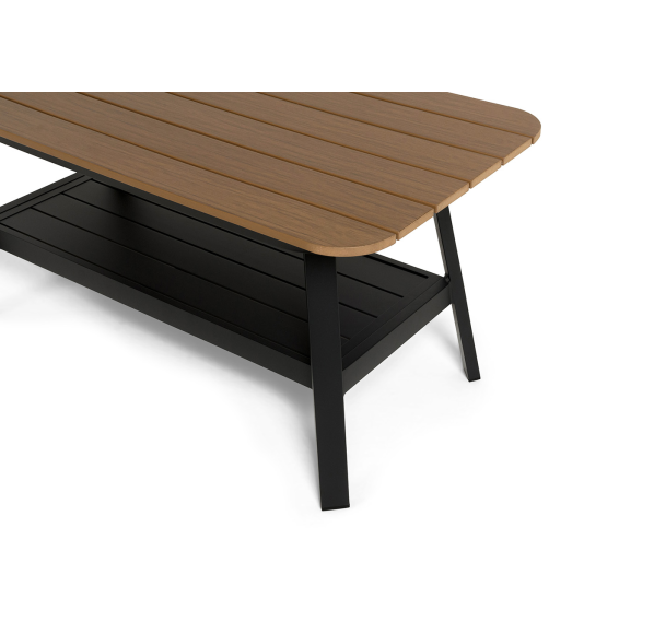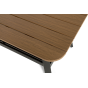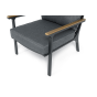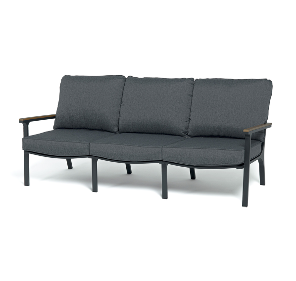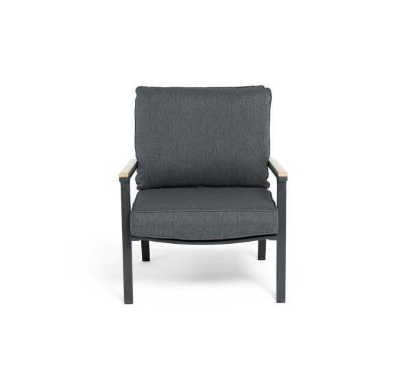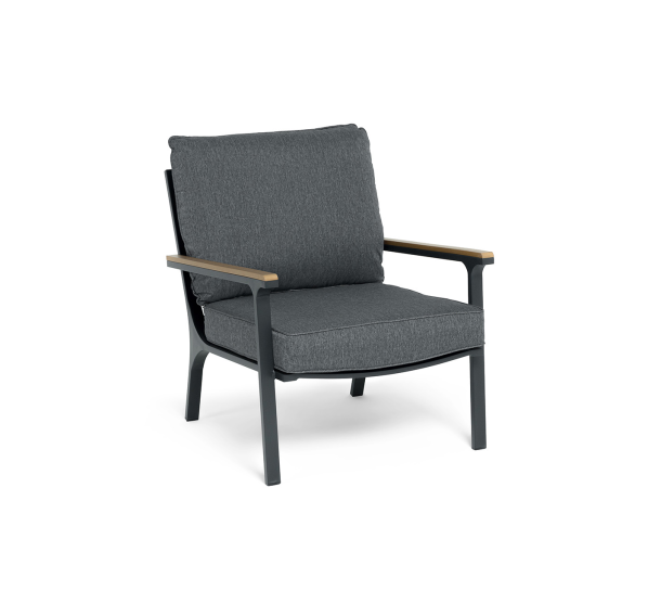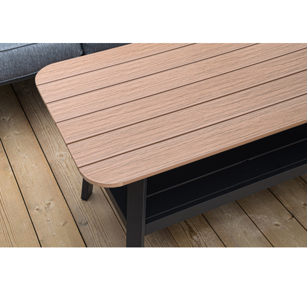 Каркас мебели выполнен из прочного алюминия темно-серого цвета. На подлокотниках дивана и двух кресел установлен облицовочный материал из древесно полимерного композита (ДПК) цвет «дерево». Крепление к каркасу осуществляется на болтах с пластиковыми заглушками темно-серого цвета, которые не ржавеют. Комплект дополняют подушки со съёмными чехлами. Материал чехлов - 100% полиэстер плотностью 190гр/м2.