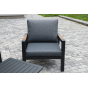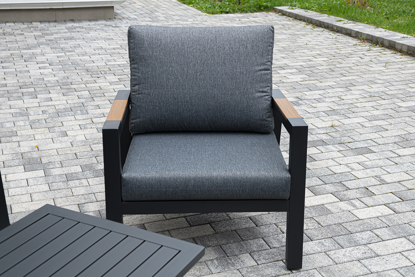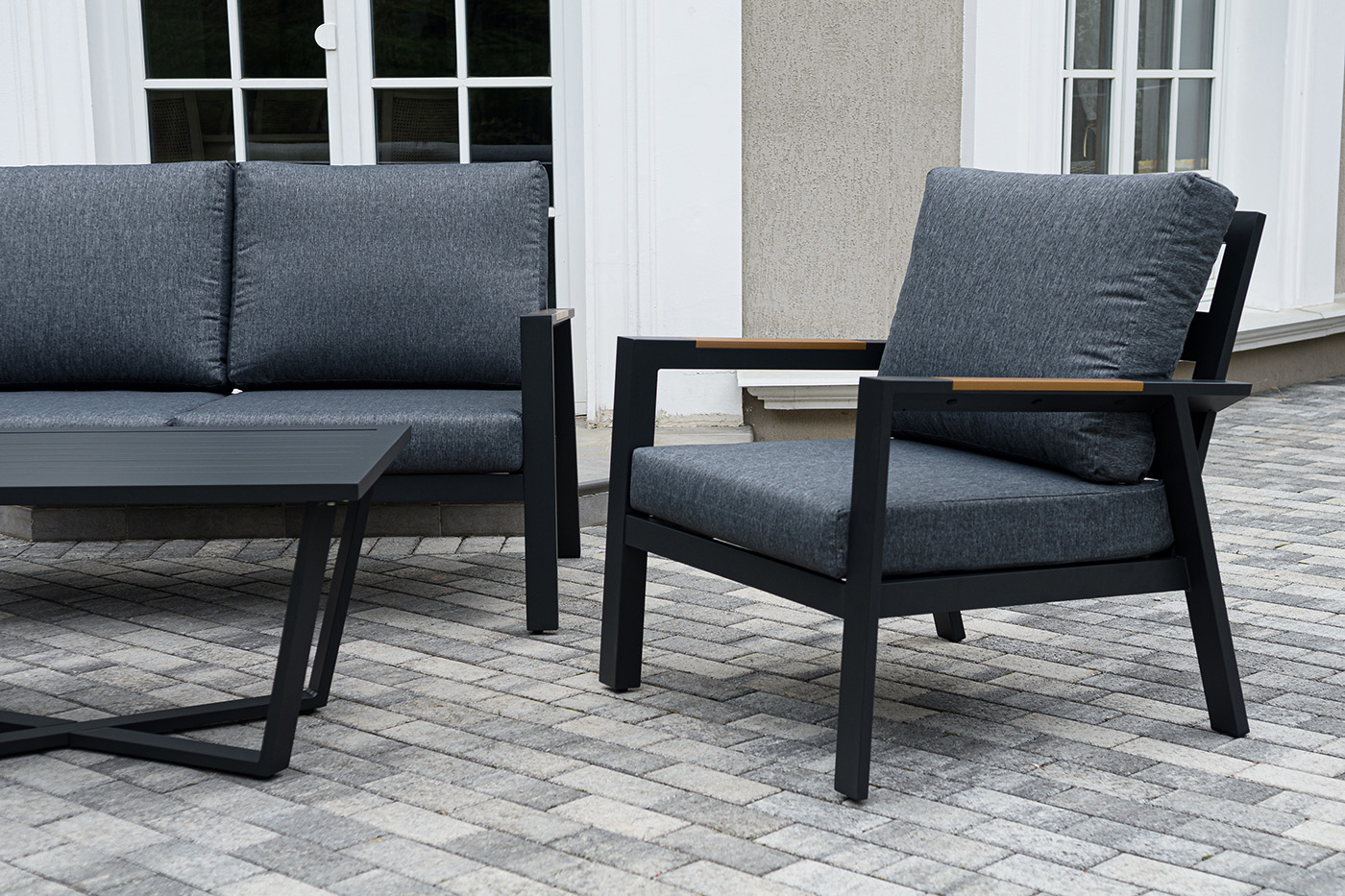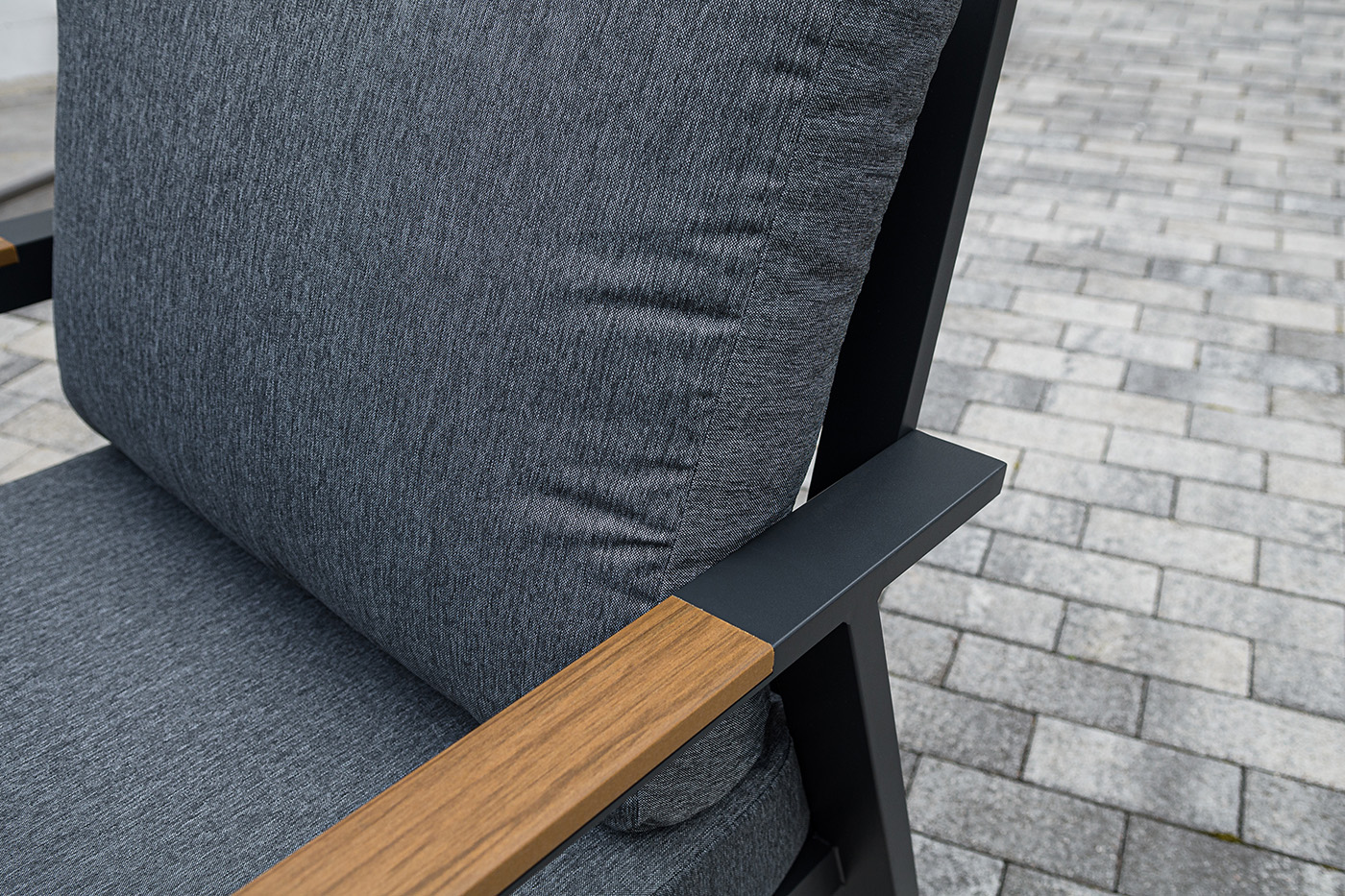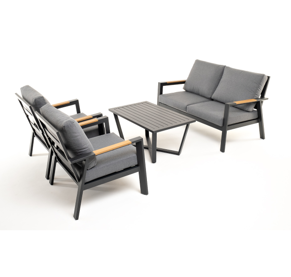 Каркас мебели выполнен из прочного алюминия темно-серого цвета. На подлокотниках дивана и двух кресел установлен облицовочный материал из древесно полимерного композита (ДПК) цвет «дерево». Крепление к каркасу осуществляется на болтах с пластиковыми заглушками темно-серого цвета, которые не ржавеют. Комплект дополняют подушки со съёмными чехлами. Материал чехлов - 100% полиэстер плотностью 190гр/м2.