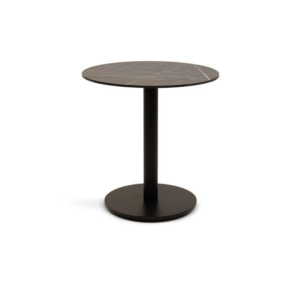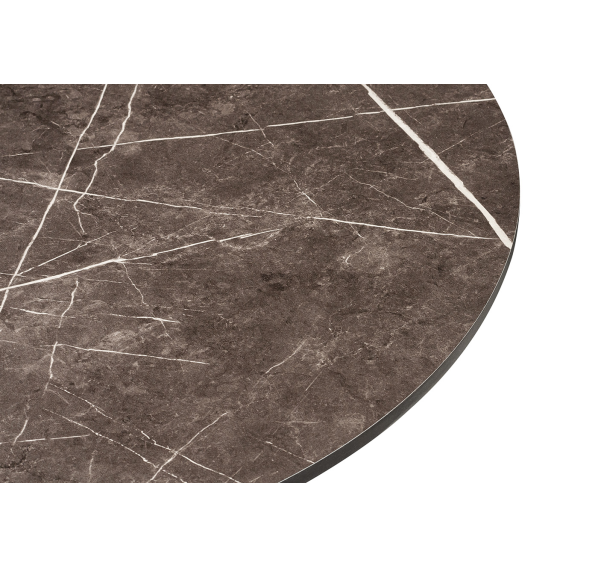 Круглый стол «Каффе» со столешницей из HPL в цвете «серый мрамор». Это высококачественный ударопрочный компакт-пластик, обладающий низкой пористостью, что предотвращает впитывание жидкостей, поэтому столы из HPL идеально подходит для обеденных зон. Толщина столешницы – 12 мм.