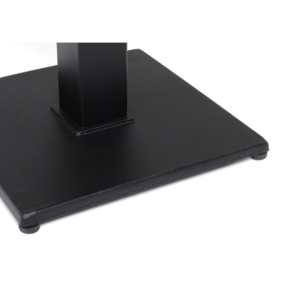 Подстолье изготовлено из чугуна черного цвета, с рамкой для крепления столешницы и широким основанием 400×400 мм. Благодаря использованию материалов, устойчивых к влаге, ультрафиолету и перепаду температур, стол можно использовать на открытом воздухе и в местах с повышенной влажностью.