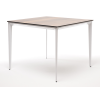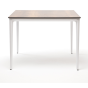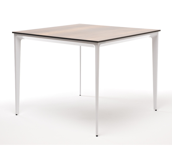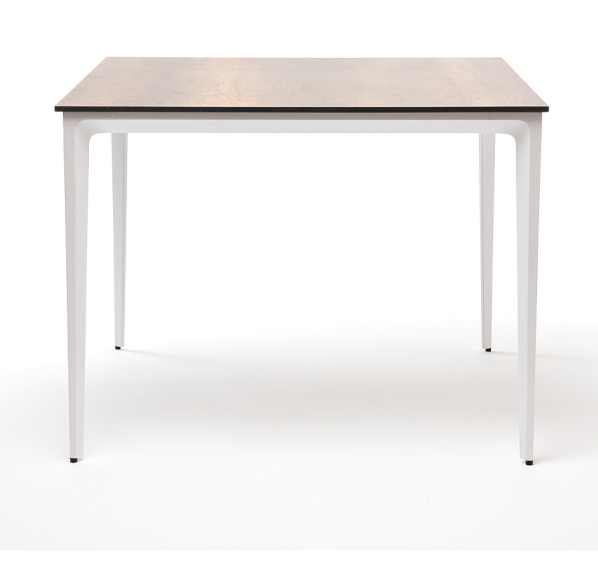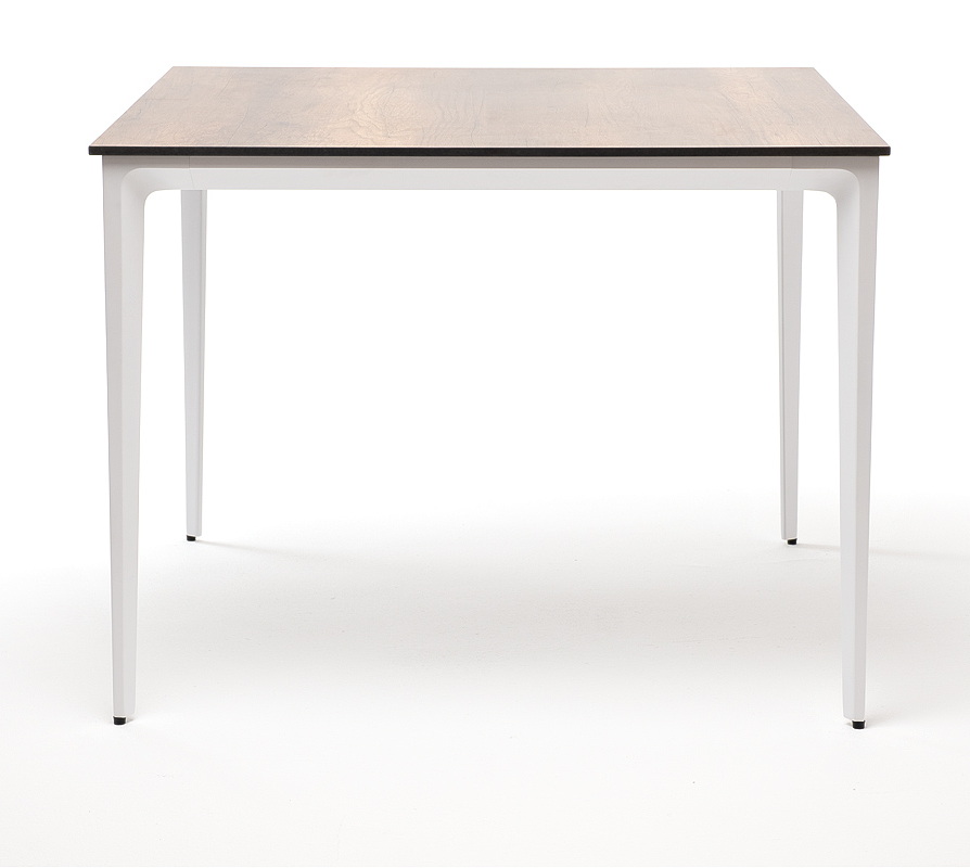 Столешница выполнена из современного высококачественного монолитного компакт-пластик HPL, толщиной 12 мм в цвете «дуб». Материал устойчив к высоким температурам, попаданию влаги и может использоваться при любых погодных условиях. Подстолье изготовлено из крашеного алюминия белого цвета.