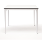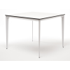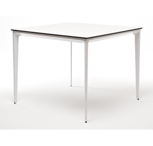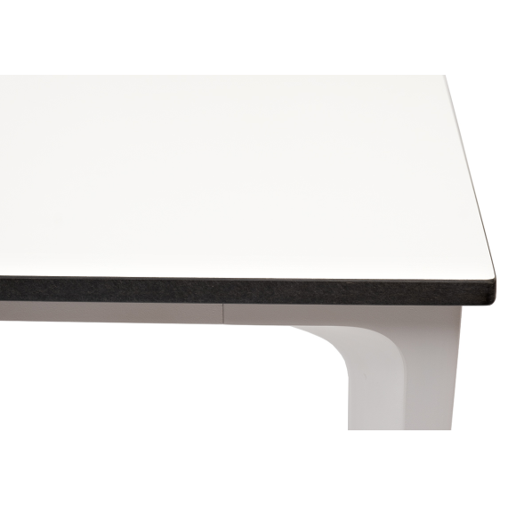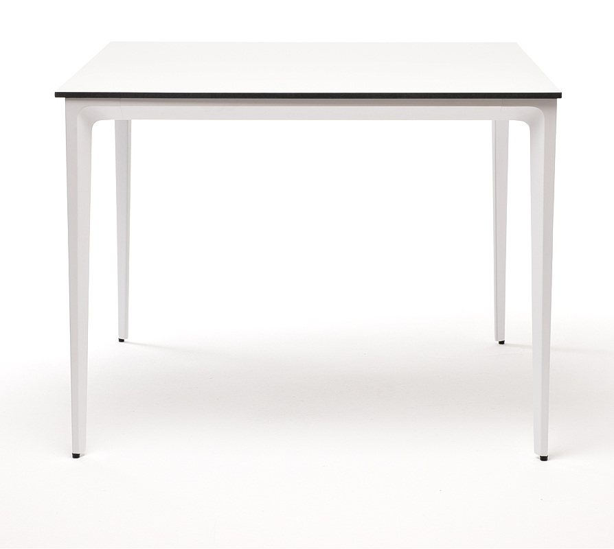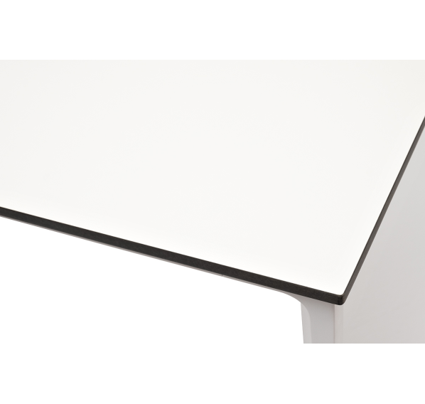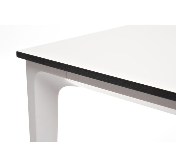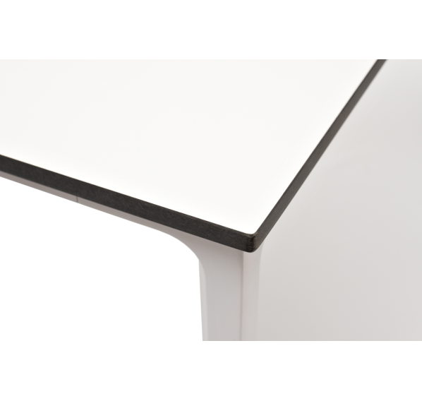 Столешница выполнена из современного высококачественного монолитного компакт-пластик HPL, толщиной 12 мм в молочном цветом. Материал устойчив к высоким температурам, попаданию влаги и может использоваться при любых погодных условиях. Подстолье изготовлено из крашеного алюминия белого цвета.