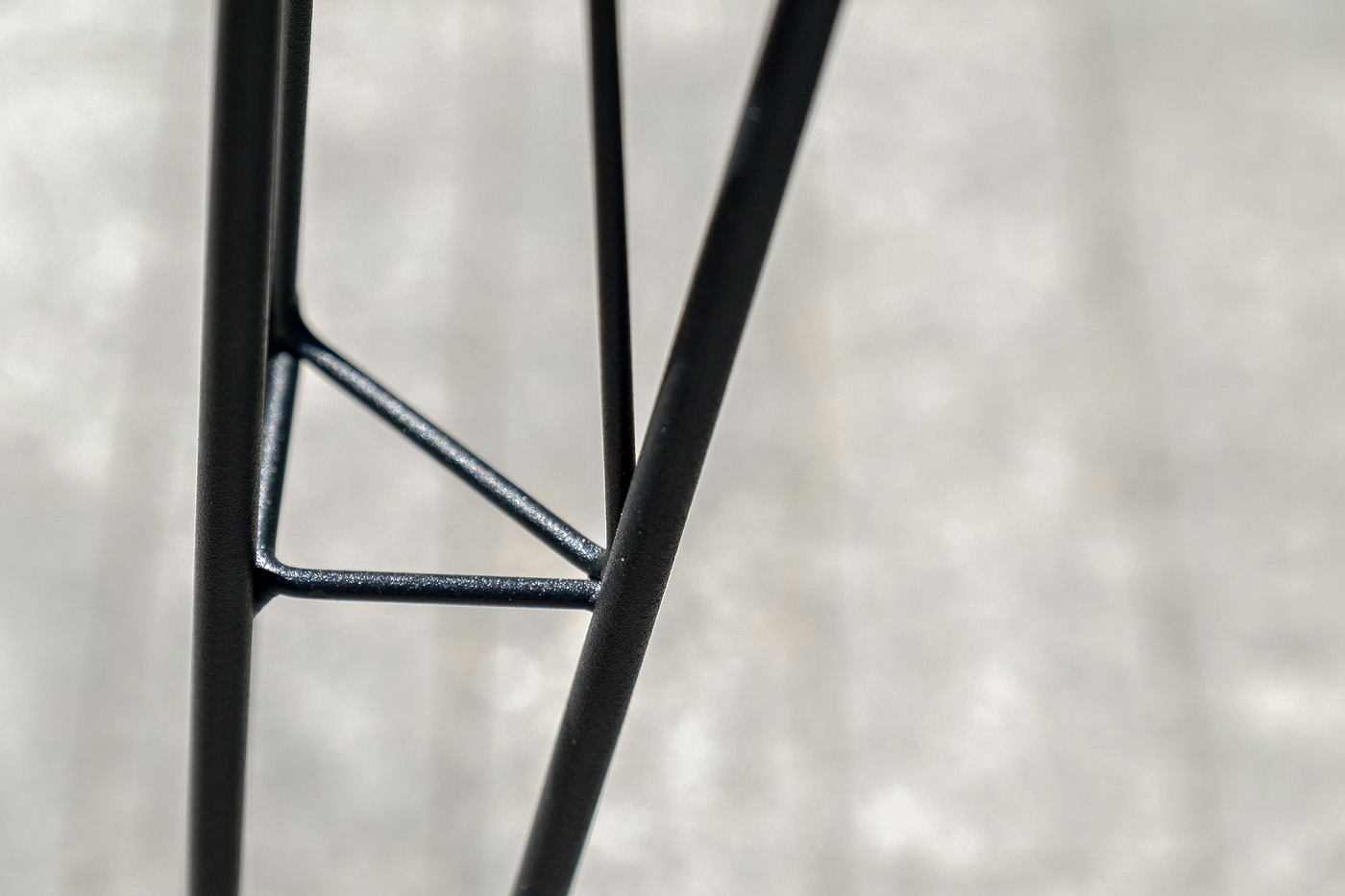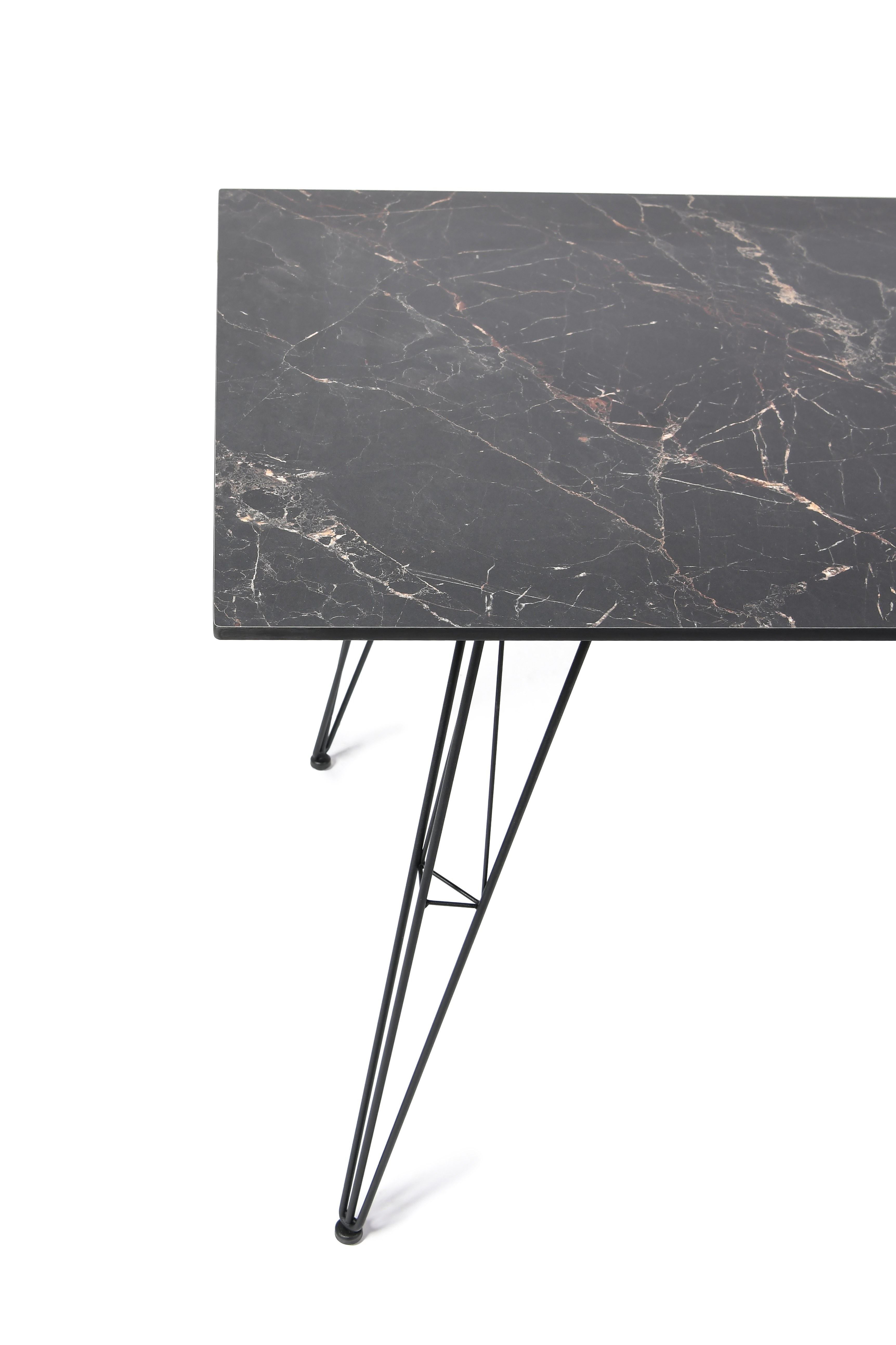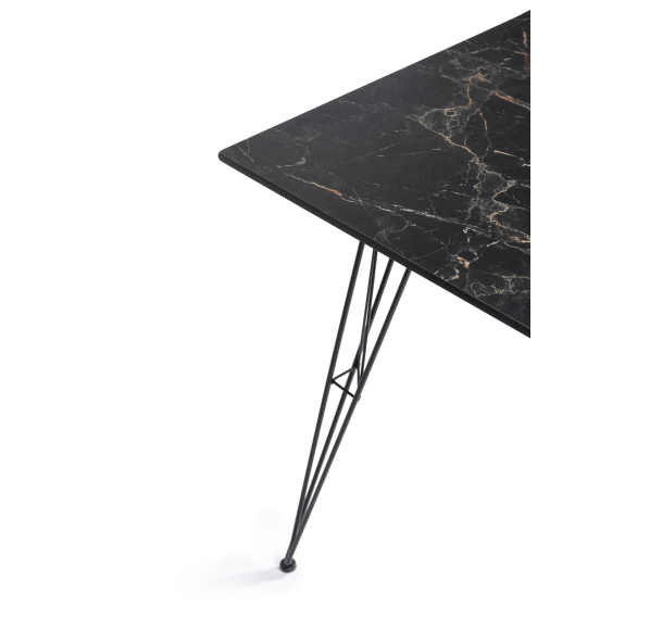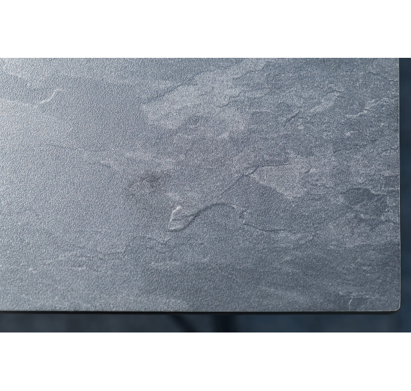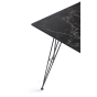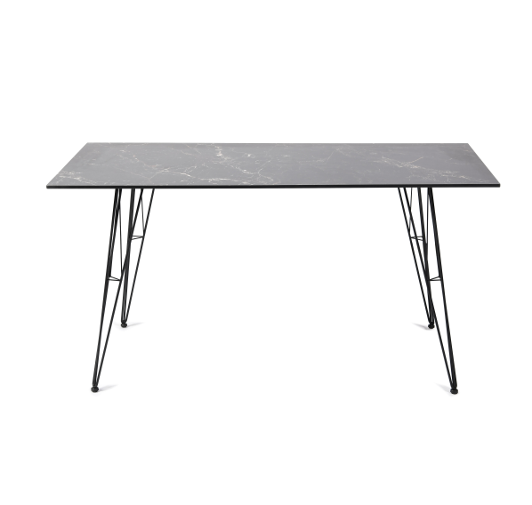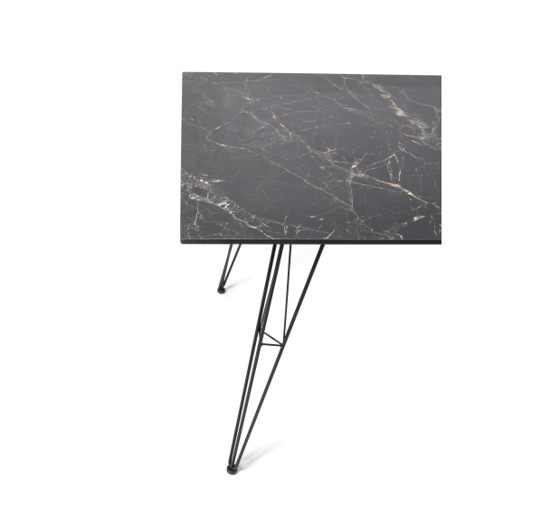 Столешница выполнена из современного высококачественного монолитного компакт-пластик HPL, толщиной 12 мм с цветом под черный мрамор. Материал устойчив к высоким температурам, попаданию влаги и может использоваться и на кухне. Подстолье изготовлено из крашеного металла в цвете «мокрый асфальт».