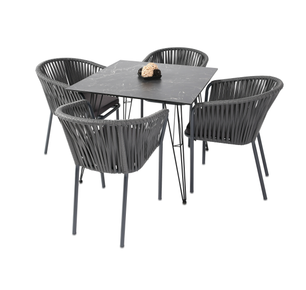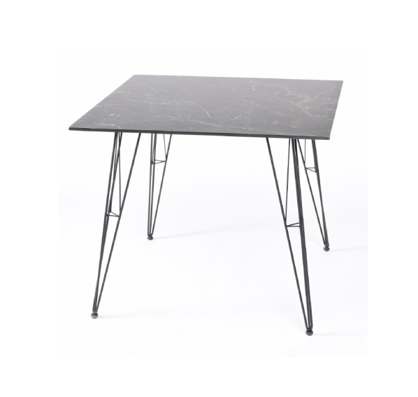 Современный обеденный стол «Руссо» в стиле лофт. Подстолье изготовлено из металла, окрашенного в темно-серый цвет. Столешница - качественный монолитный компакт-пластик HPL, толщиной 12 мм. Цвет столешницы имитирует черный мрамор.