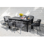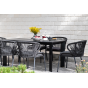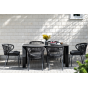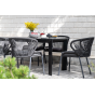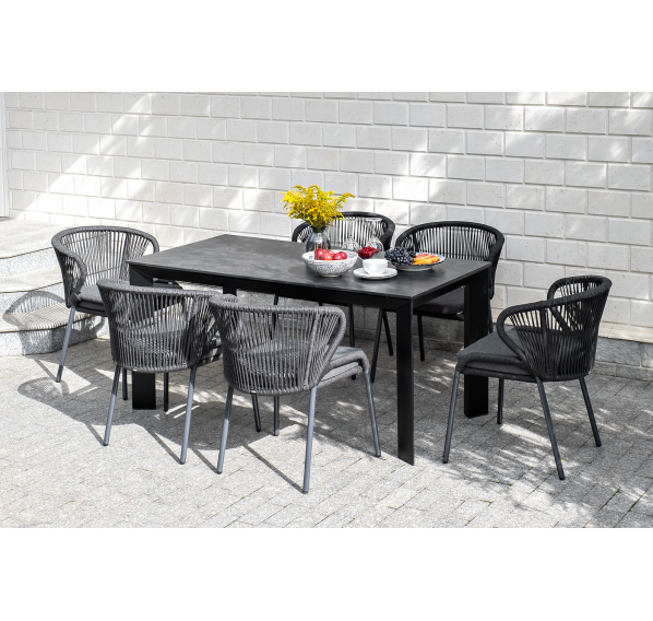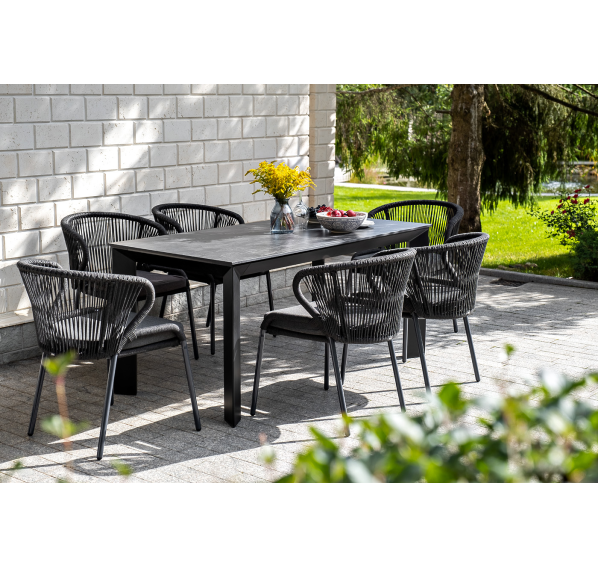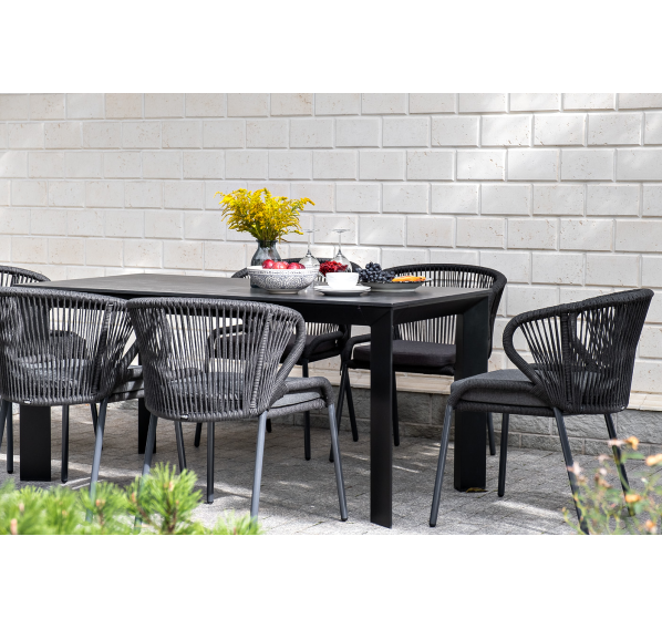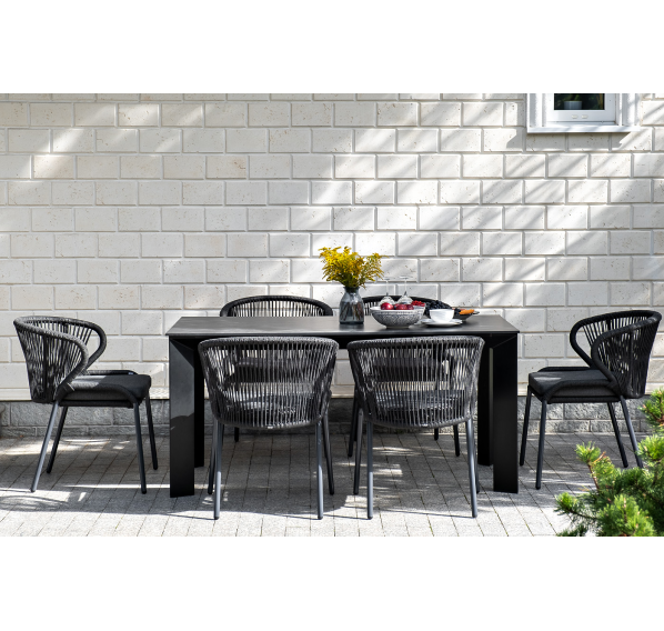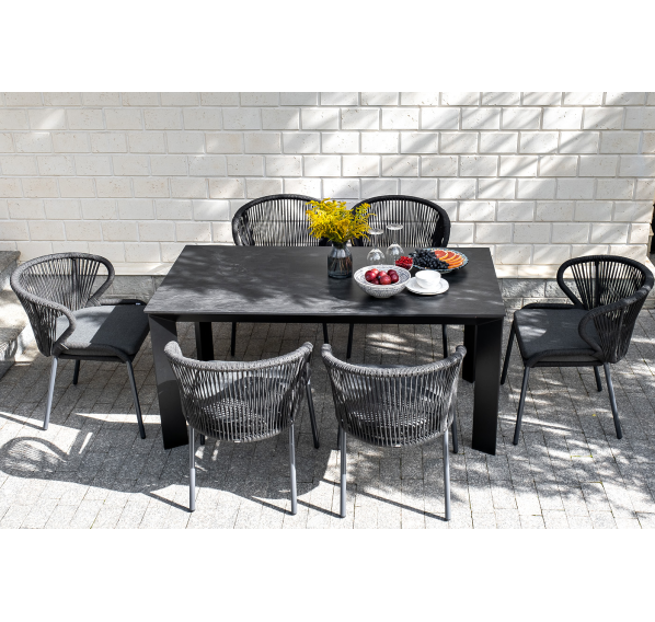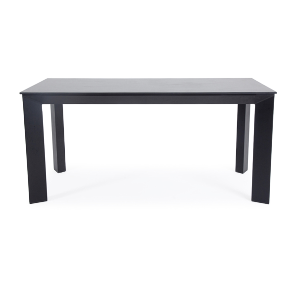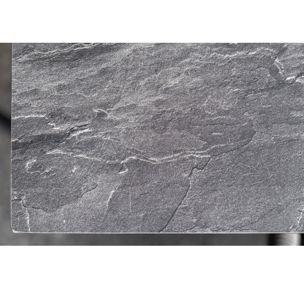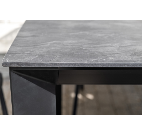 Столешница выполнена из современного высококачественного монолитного компакт-пластик HPL, толщиной 12 мм в цвете «серый гранит». Материал устойчив к высоким температурам, попаданию влаги и может использоваться как в помещении, так и на открытом пространстве. Подстолье изготовлено из крашеного алюминия черного цвета.