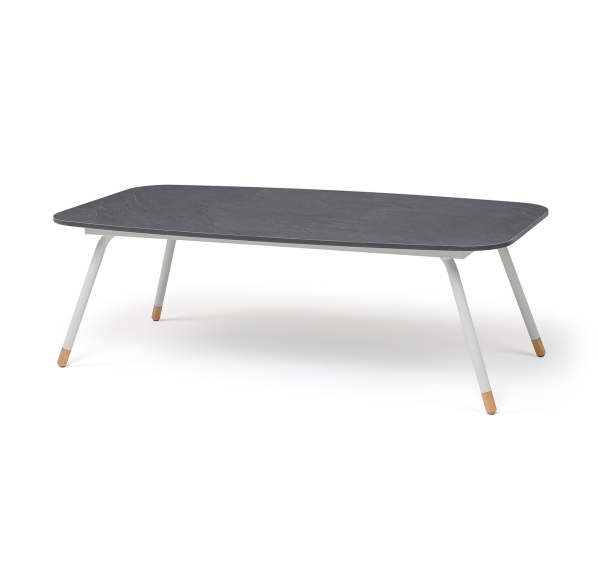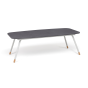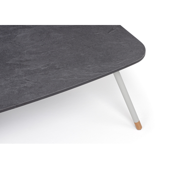 Каркас столика изготовлен из алюминия, окрашенного в светло-серый цвет. Алюминий является легким и прочным материалом, что обеспечивает долговечность и надежность изделия. На ножках столика идут дубовые наконечники (заглушки).