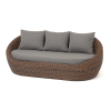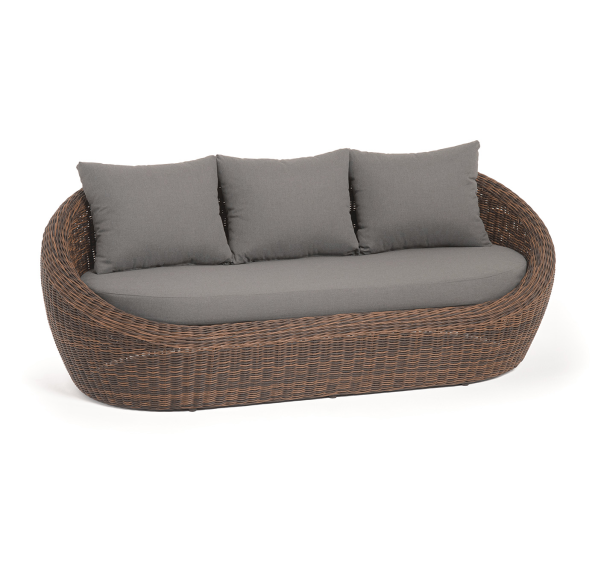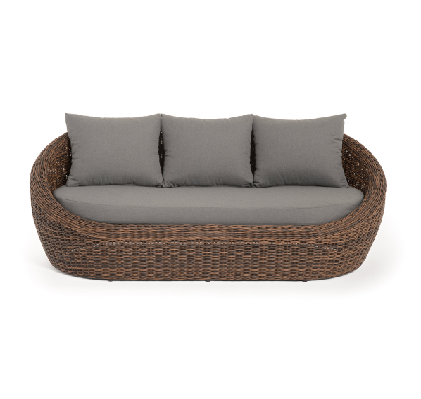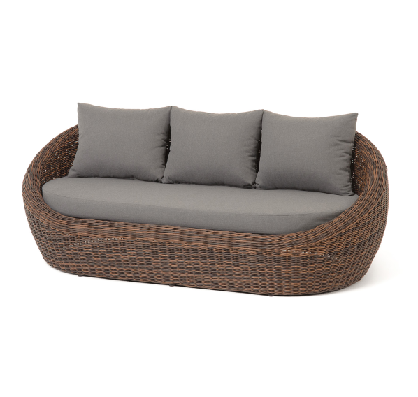 Трехместный диван дополняют мягкие подушки в сером цвете со съёмными чехлами. Тканевые изделия выполнены из прочного полиэстера плотностью 300гр/м2. Материал имеет влагоотталкивающую пропитку.