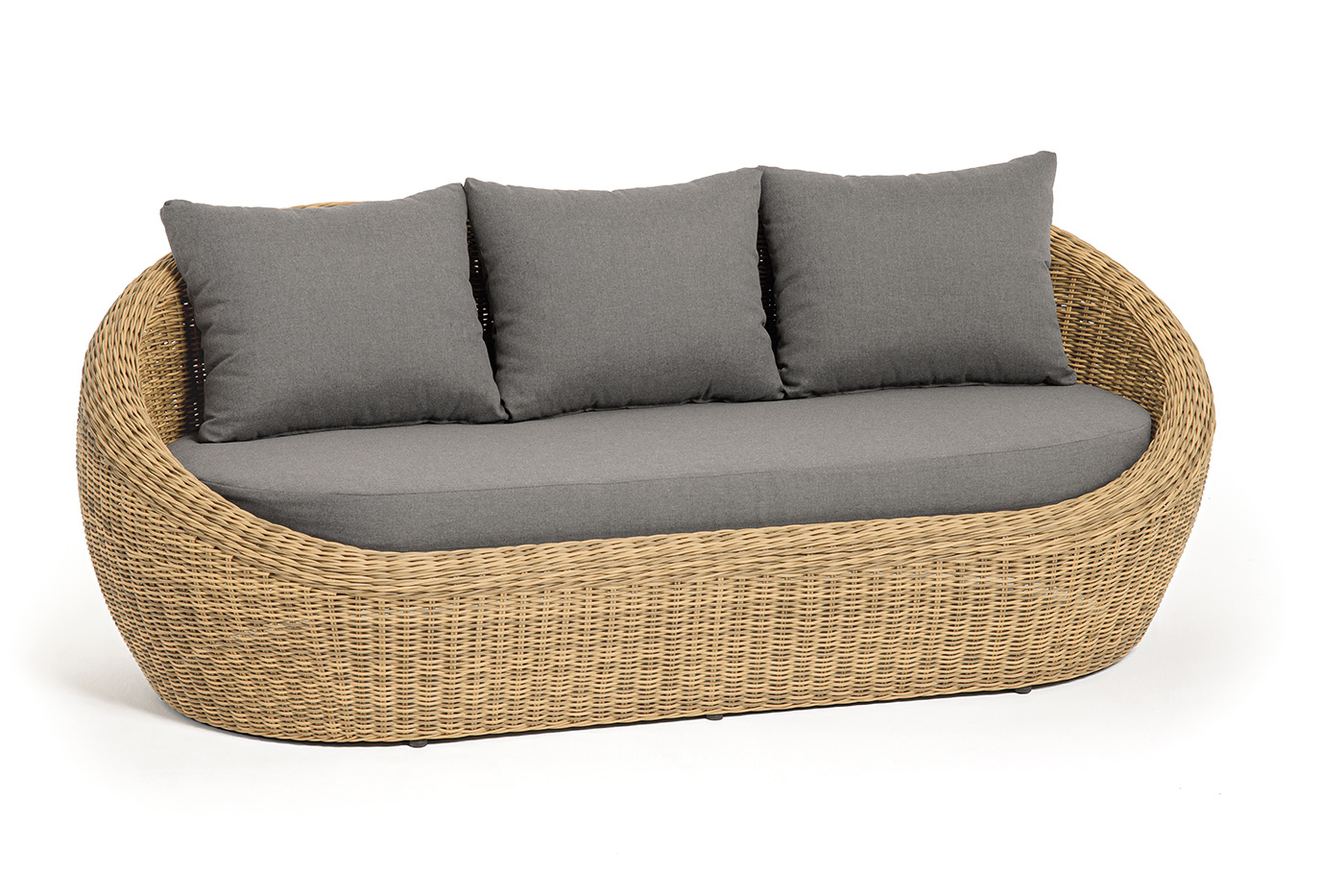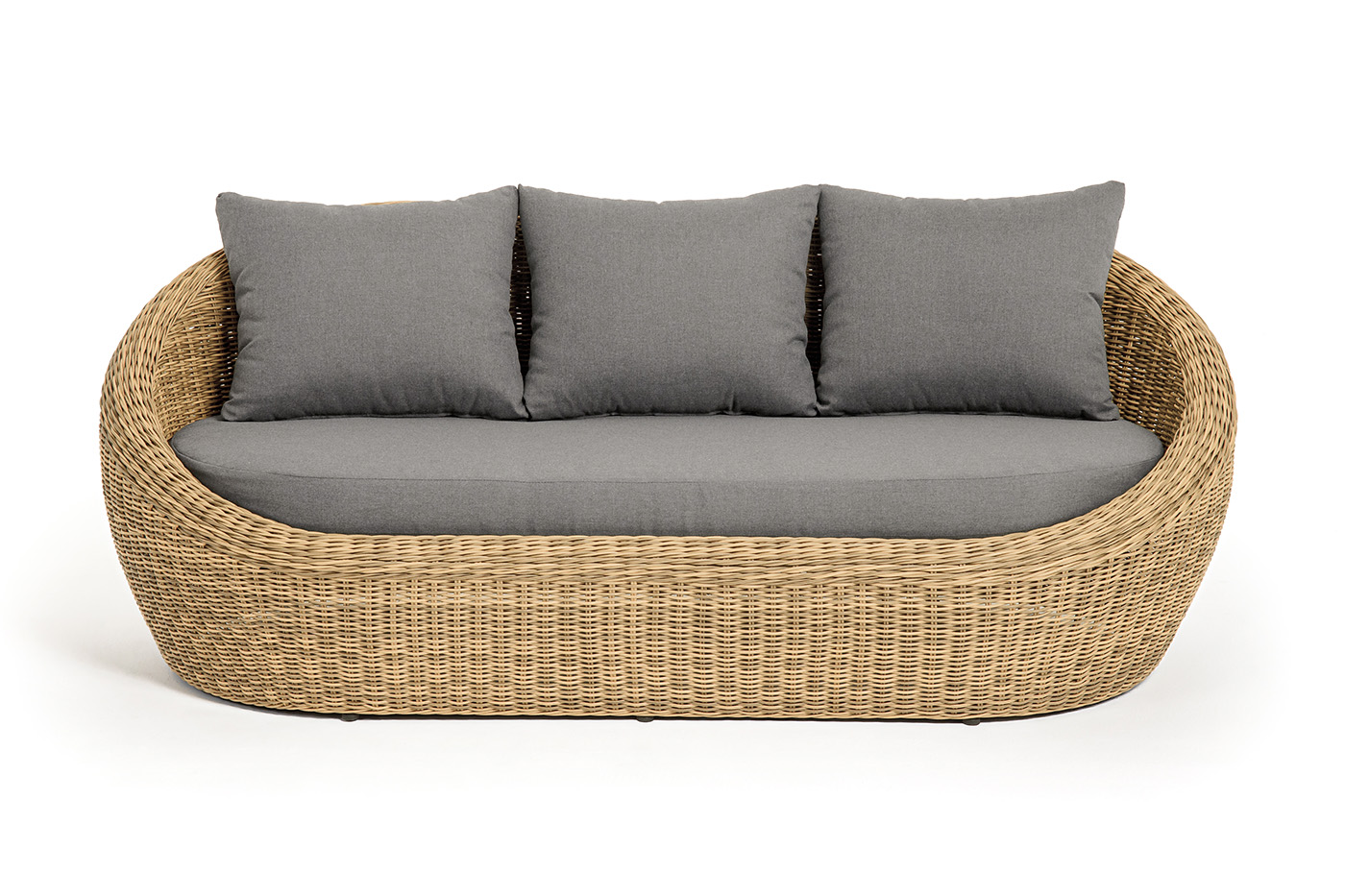 Трехместный диван дополняют мягкие подушки в сером цвете со съёмными чехлами. Тканевые изделия выполнены из прочного полиэстера плотностью 300гр/м2. Материал имеет влагоотталкивающую пропитку.