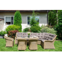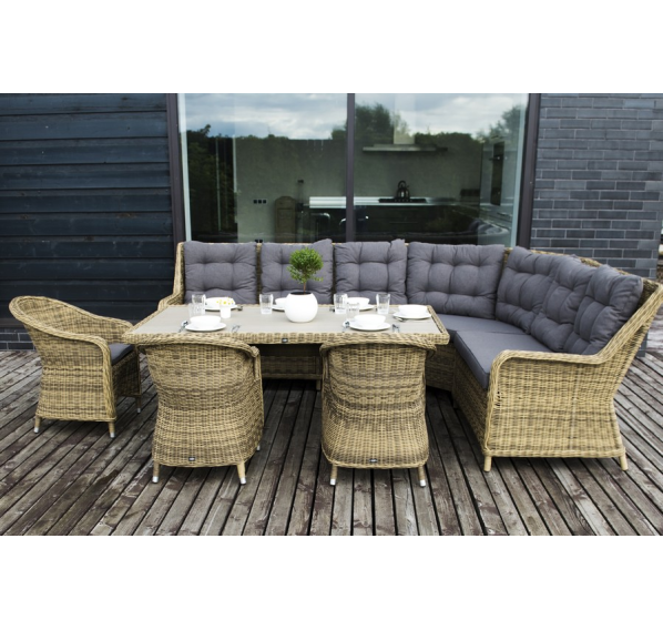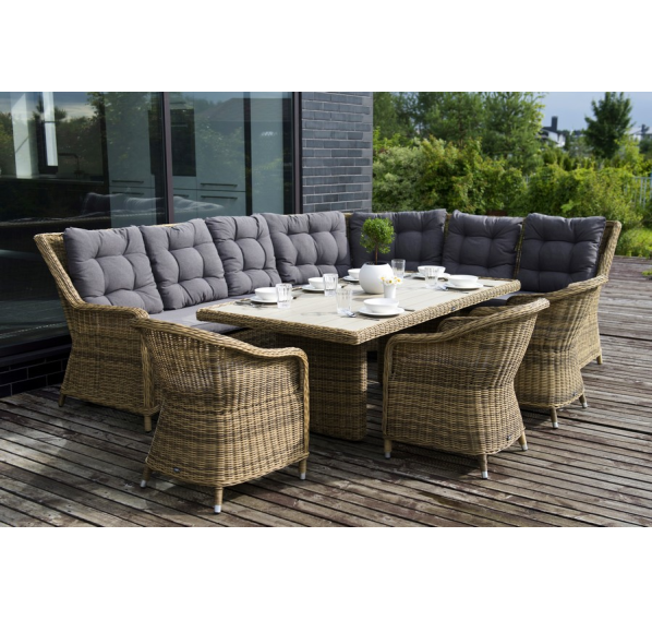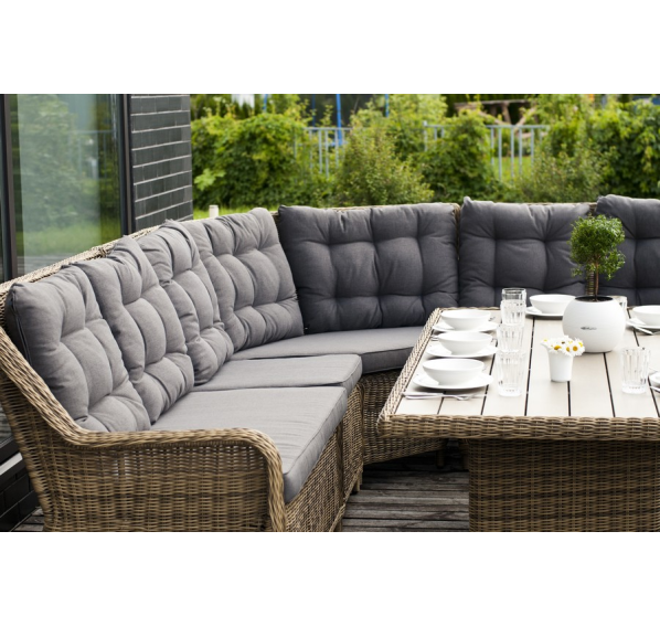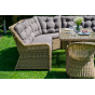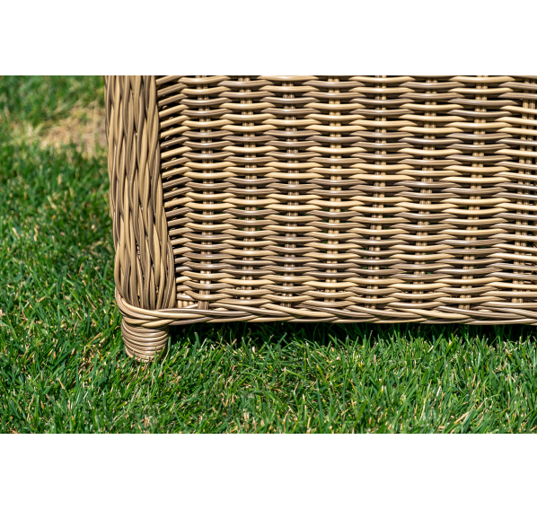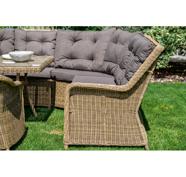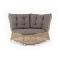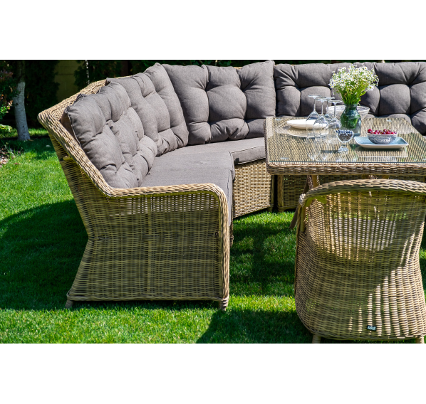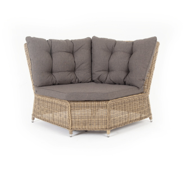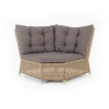 Плетеный угловой диванный модуль «Бергамо» изготовлен из алюминиевого каркаса, вручную оплетенного круглым искусственным ротангом соломенного цвета.