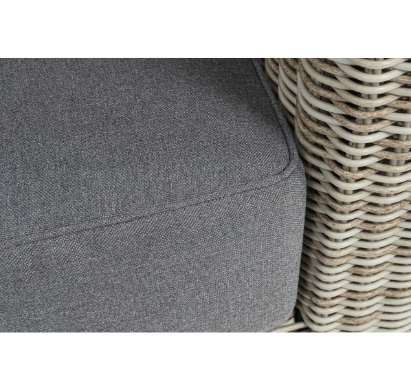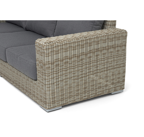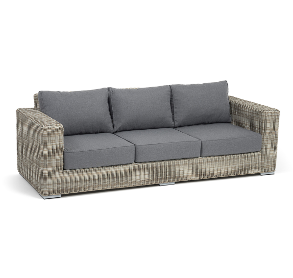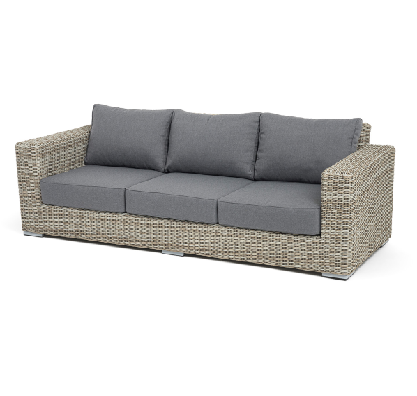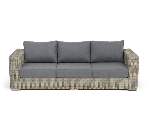 В комплекте с трехместным диваном идут мягкие подушки для комфортного расположения. Чехлы съёмные серого цвета из высококлассного полиэстера с плотностью 300гр/м2. Защитные свойства ткани усиливаются при помощи влагоотталкивающей пропитки.