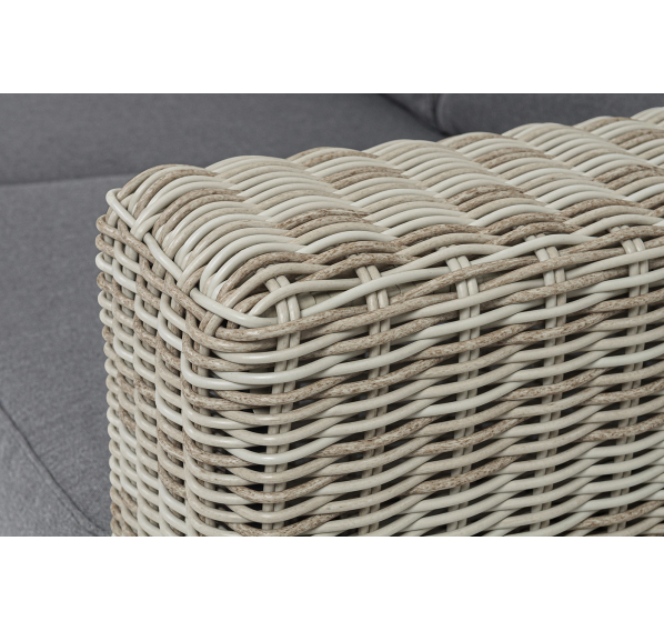 Ручное круглое плетение является основным декоративным элементом мебели. Оно выполнено из искусственного ротанга в бежевом цвете.
