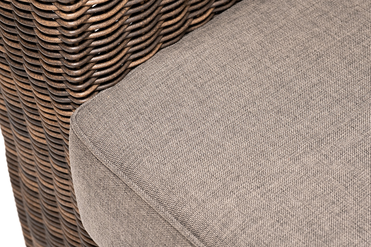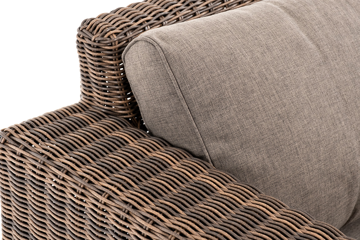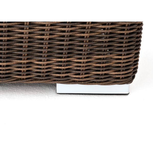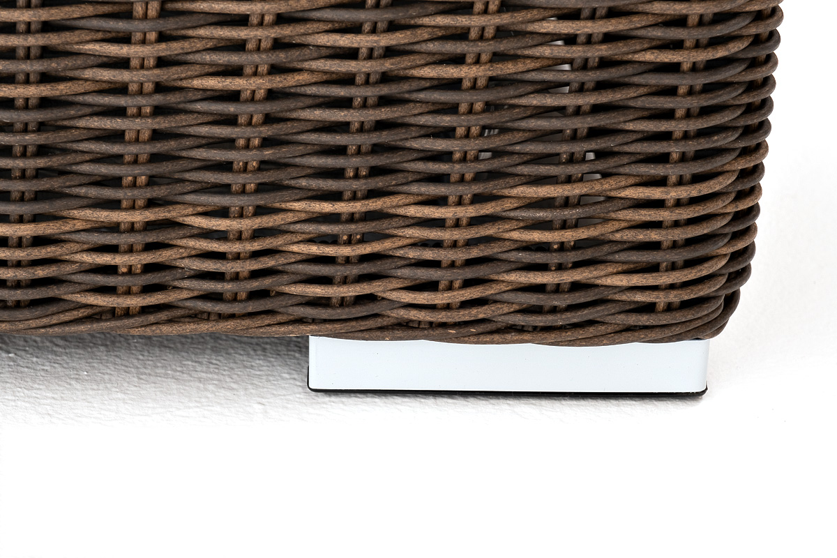 Ручное круглое плетение является основным декоративным элементом мебели. Оно выполнено из искусственного ротанга в коричневом цвете.