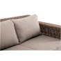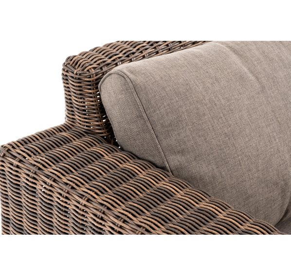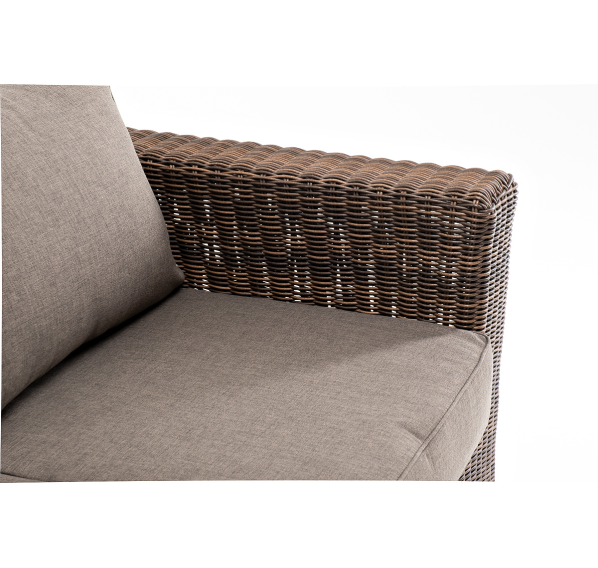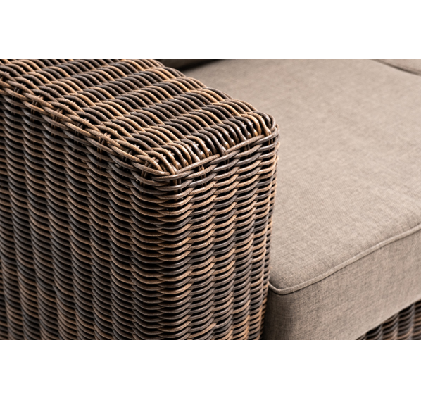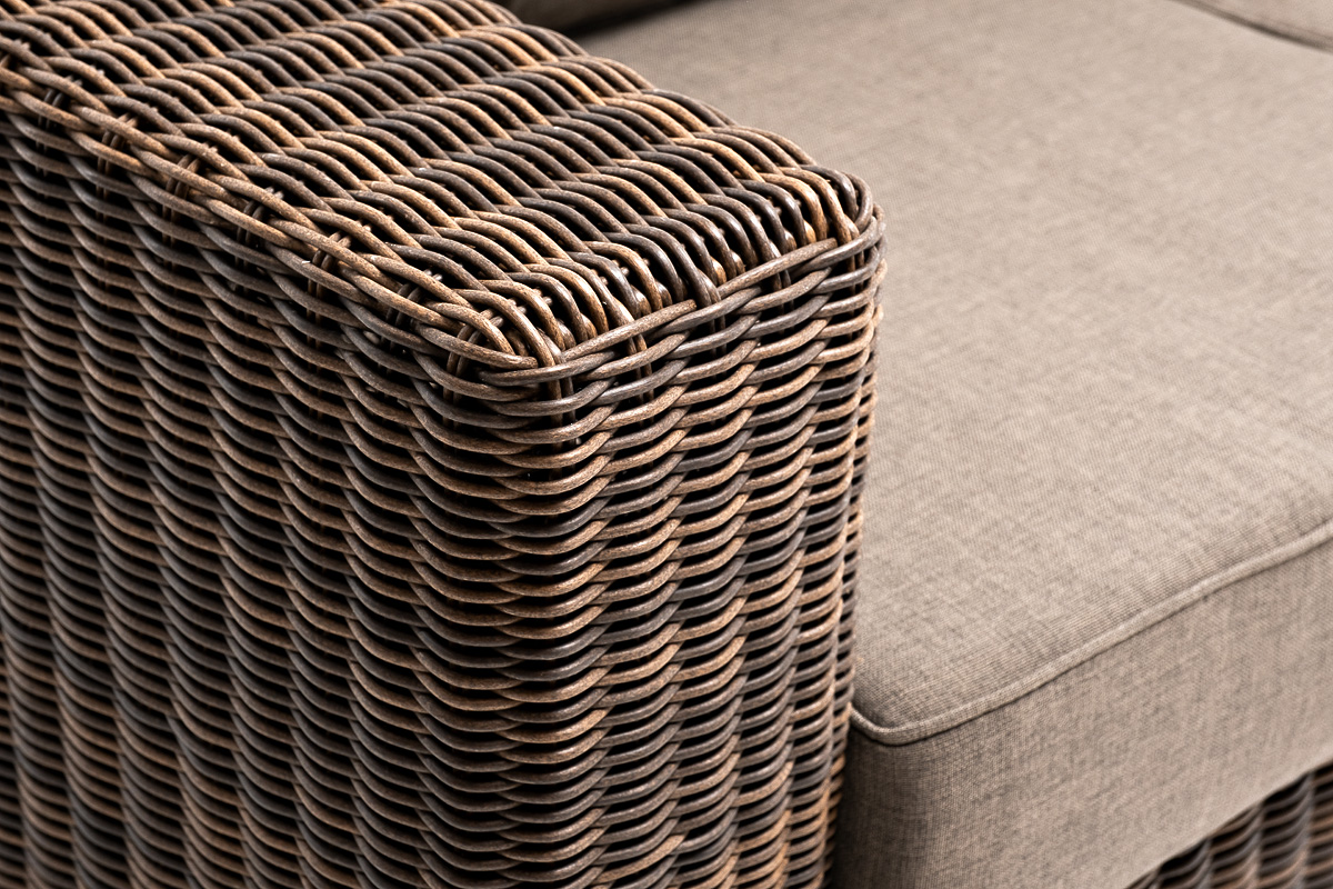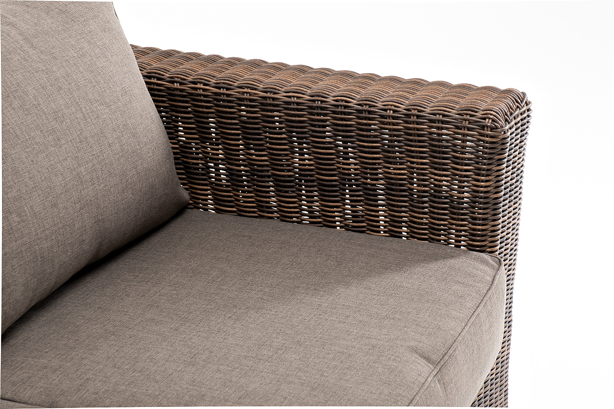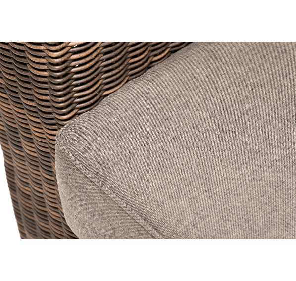 Ручное круглое плетение является основным декоративным элементом мебели. Оно выполнено из искусственного ротанга в коричневом цвете.