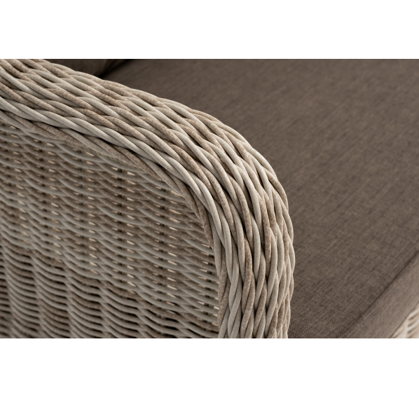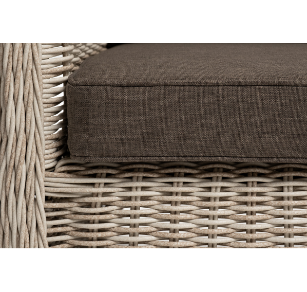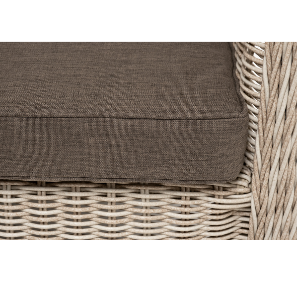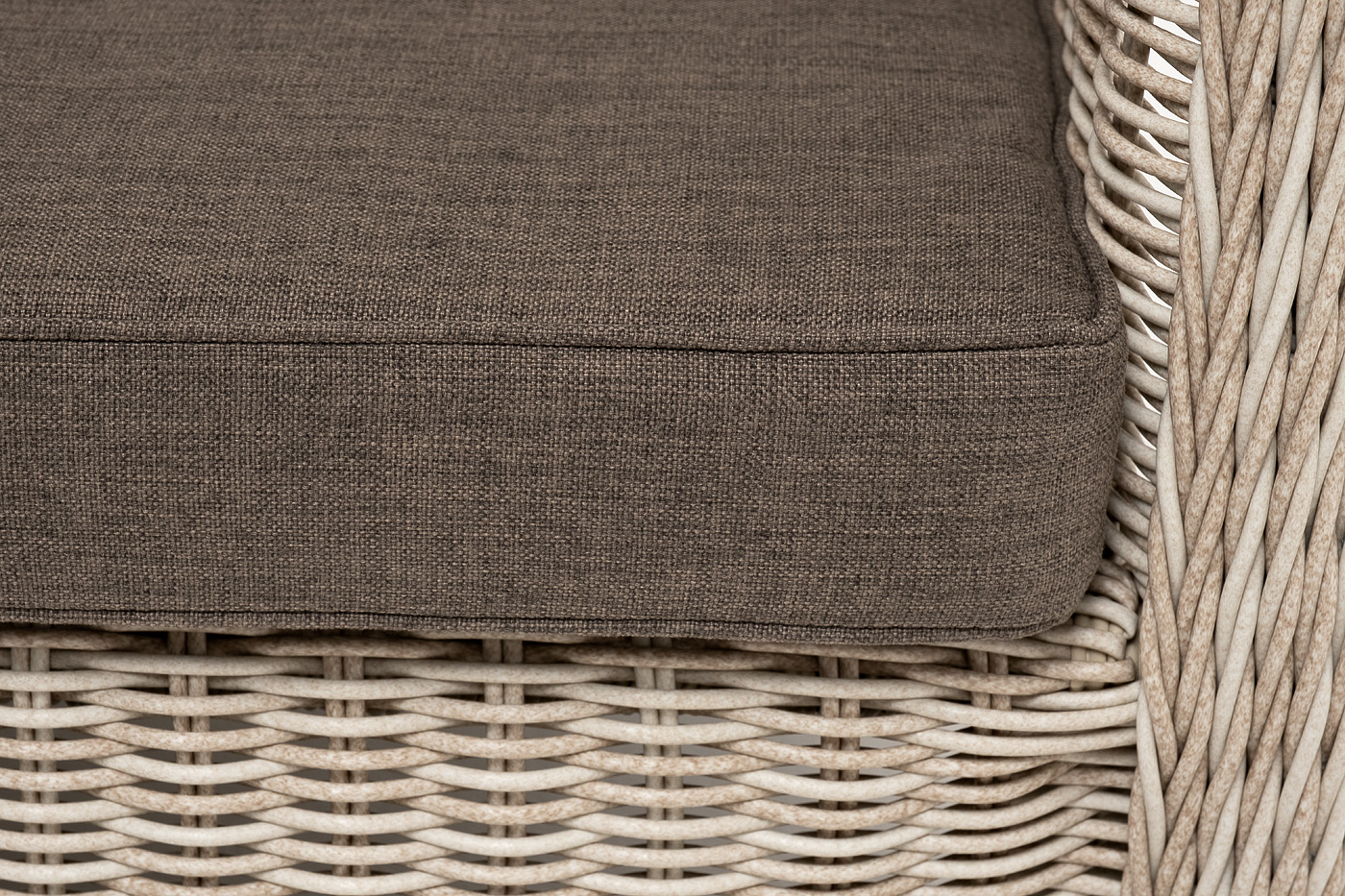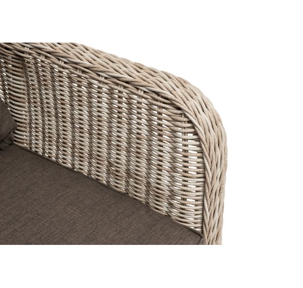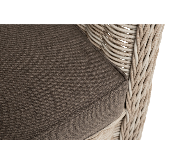 Ручное круглое плетение является основным декоративным элементом мебели. Оно выполнено из искусственного ротанга в бежевом цвете.