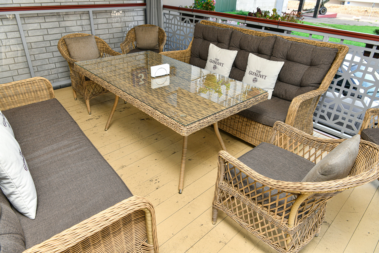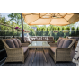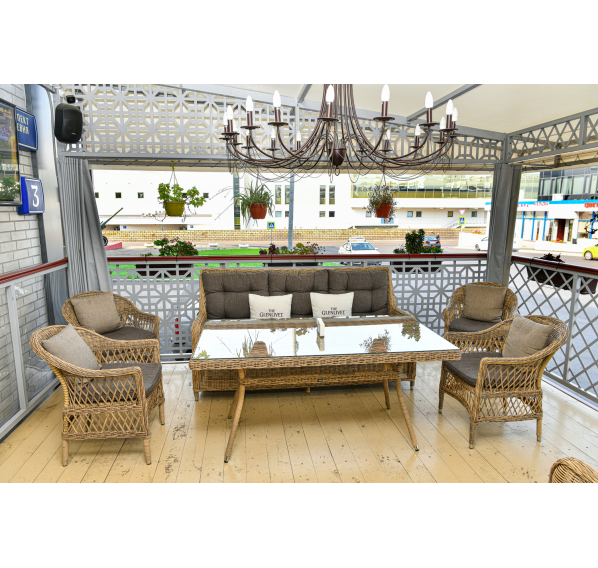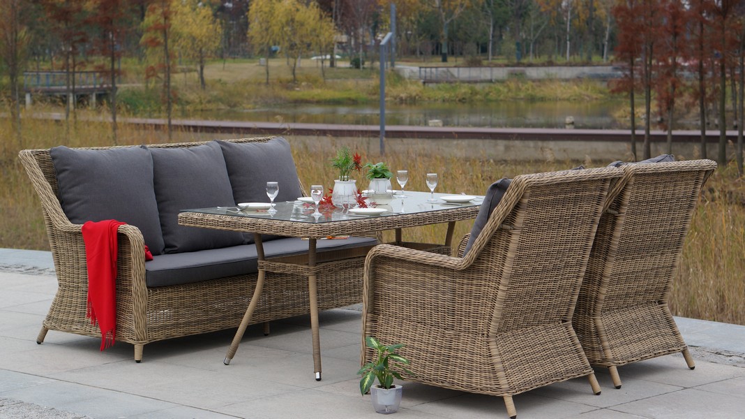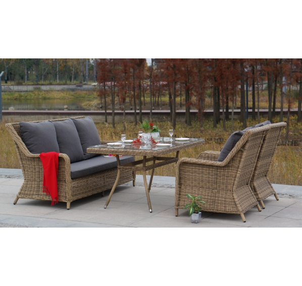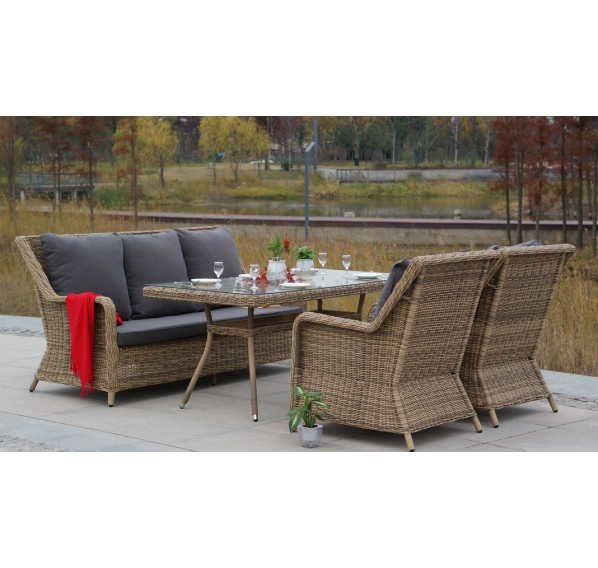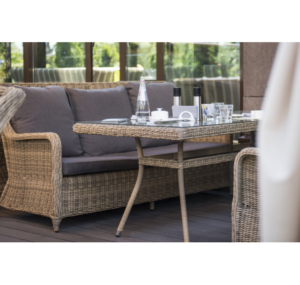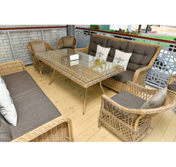 Ручное круглое плетение является основным декоративным элементом мебели. Оно выполнено из круглого искусственного ротанга соломенного цвета.