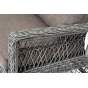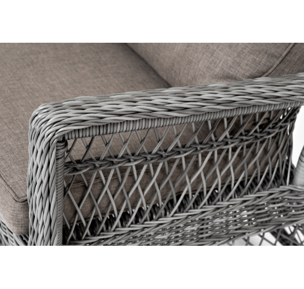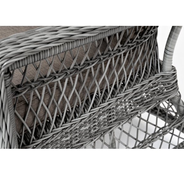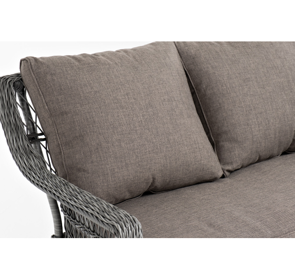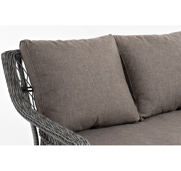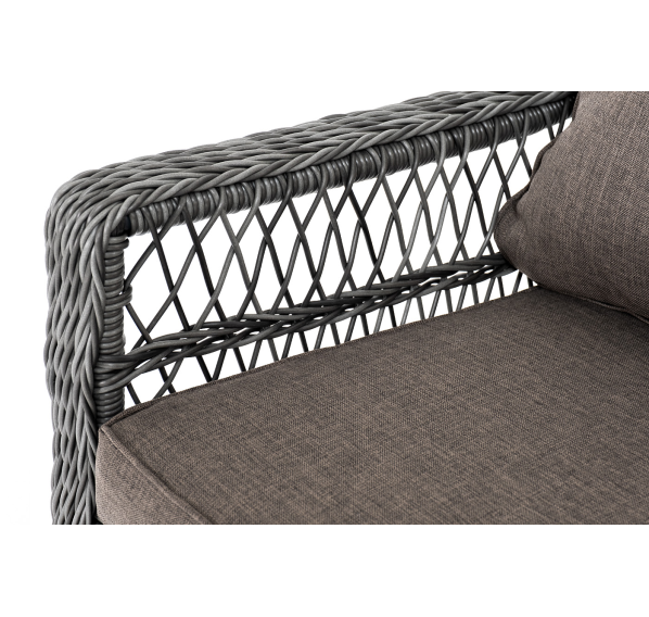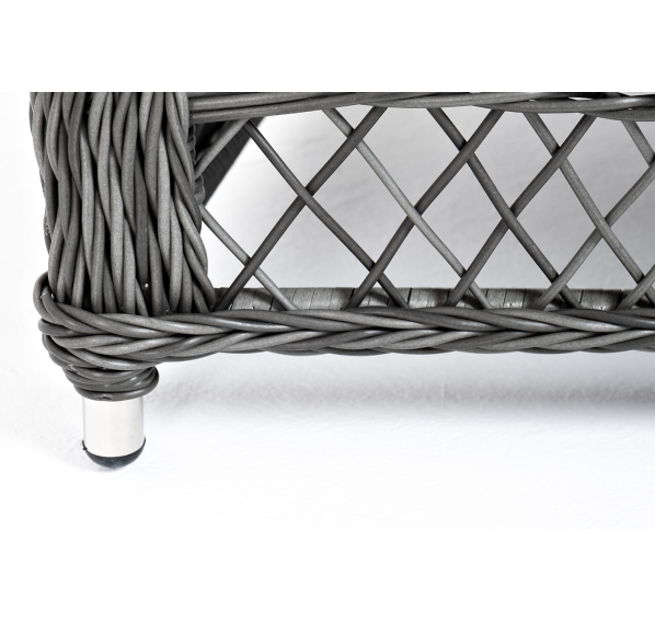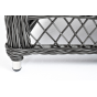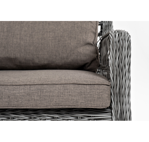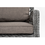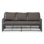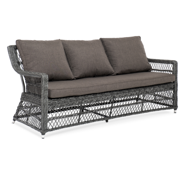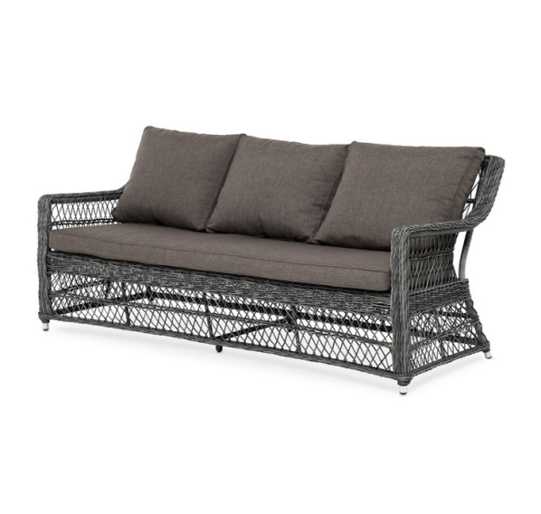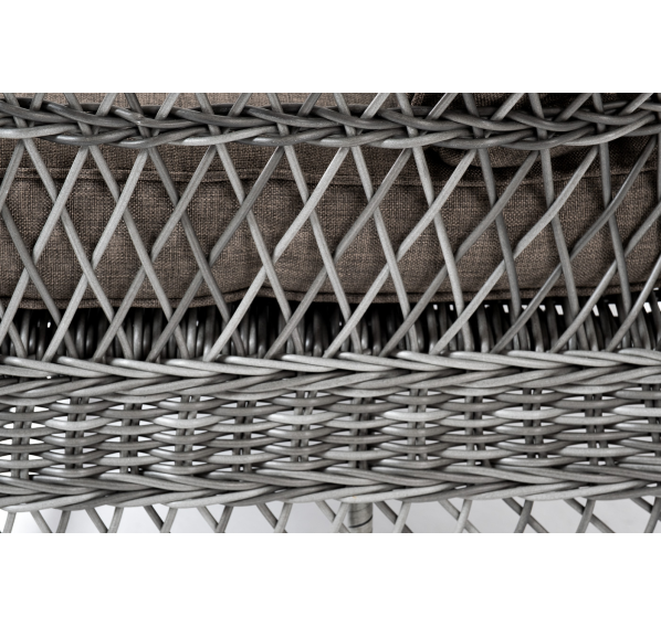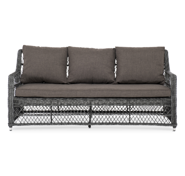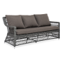 Модель выполнена с помощью ручного круглого плетения из искусственного ротанга. Трехместный диван представлен в графитовом цвете.