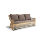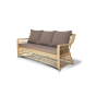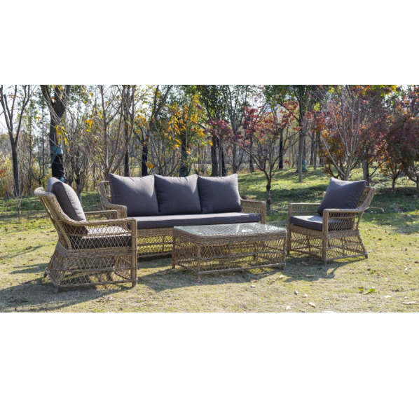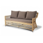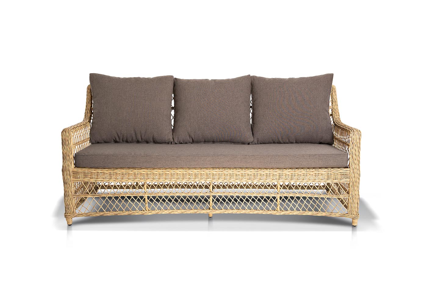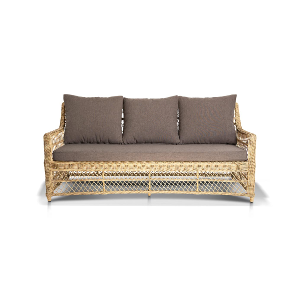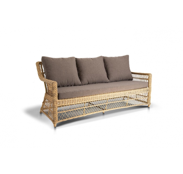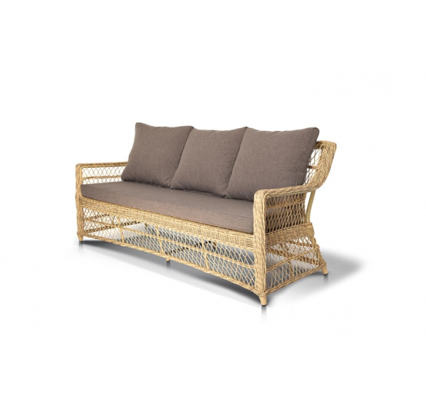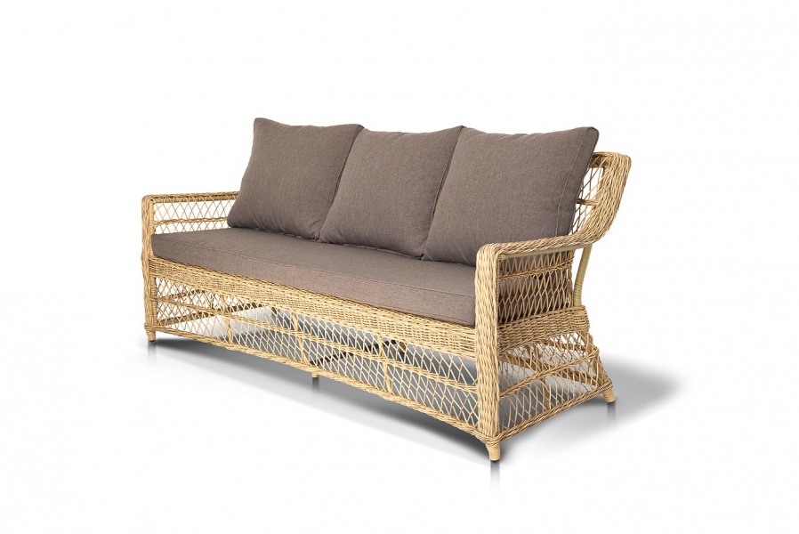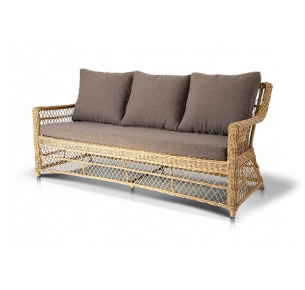 Модель выполнена с помощью ручного круглого плетения из искусственного ротанга. Трехместный диван представлен в соломенном цвете.