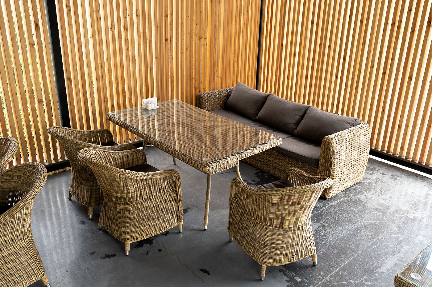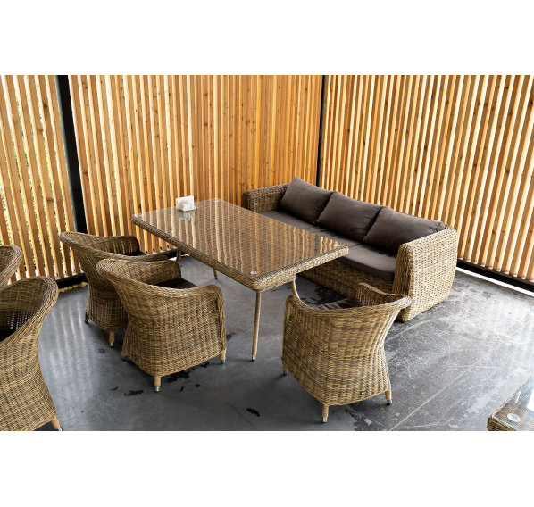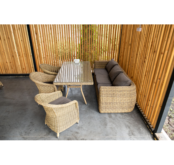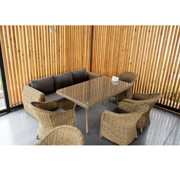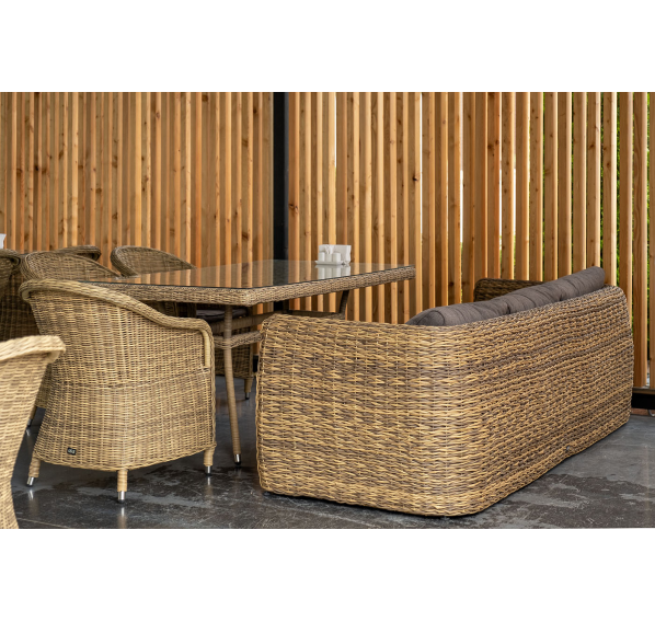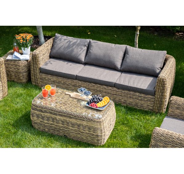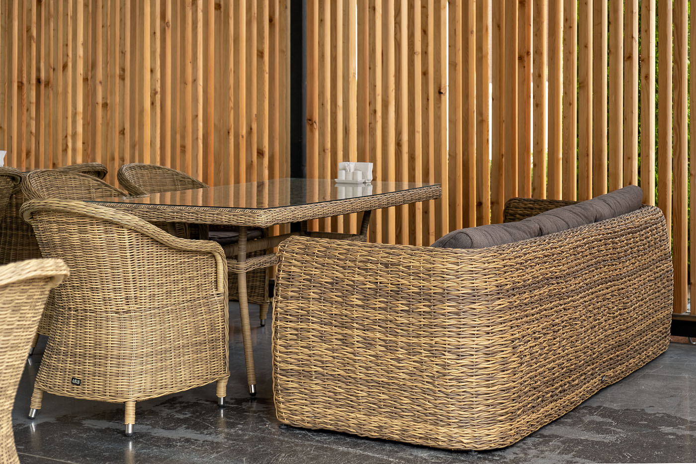 Ручное круглое плетение является основным декоративным элементом мебели. Оно выполнено из искусственного ротанга вида «гиацинт» в соломенном цвете.