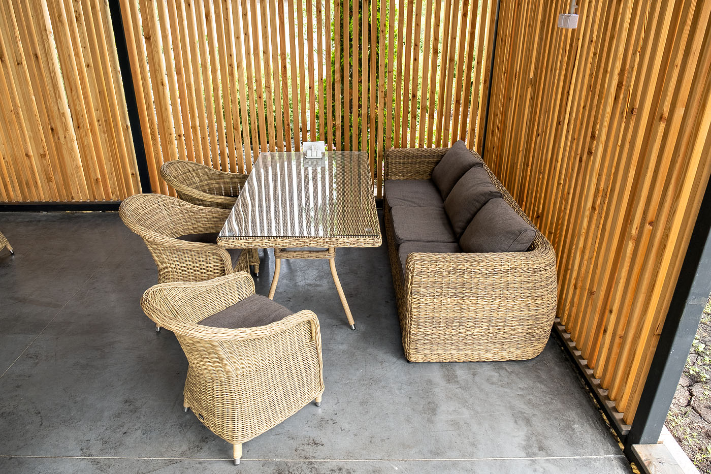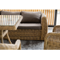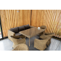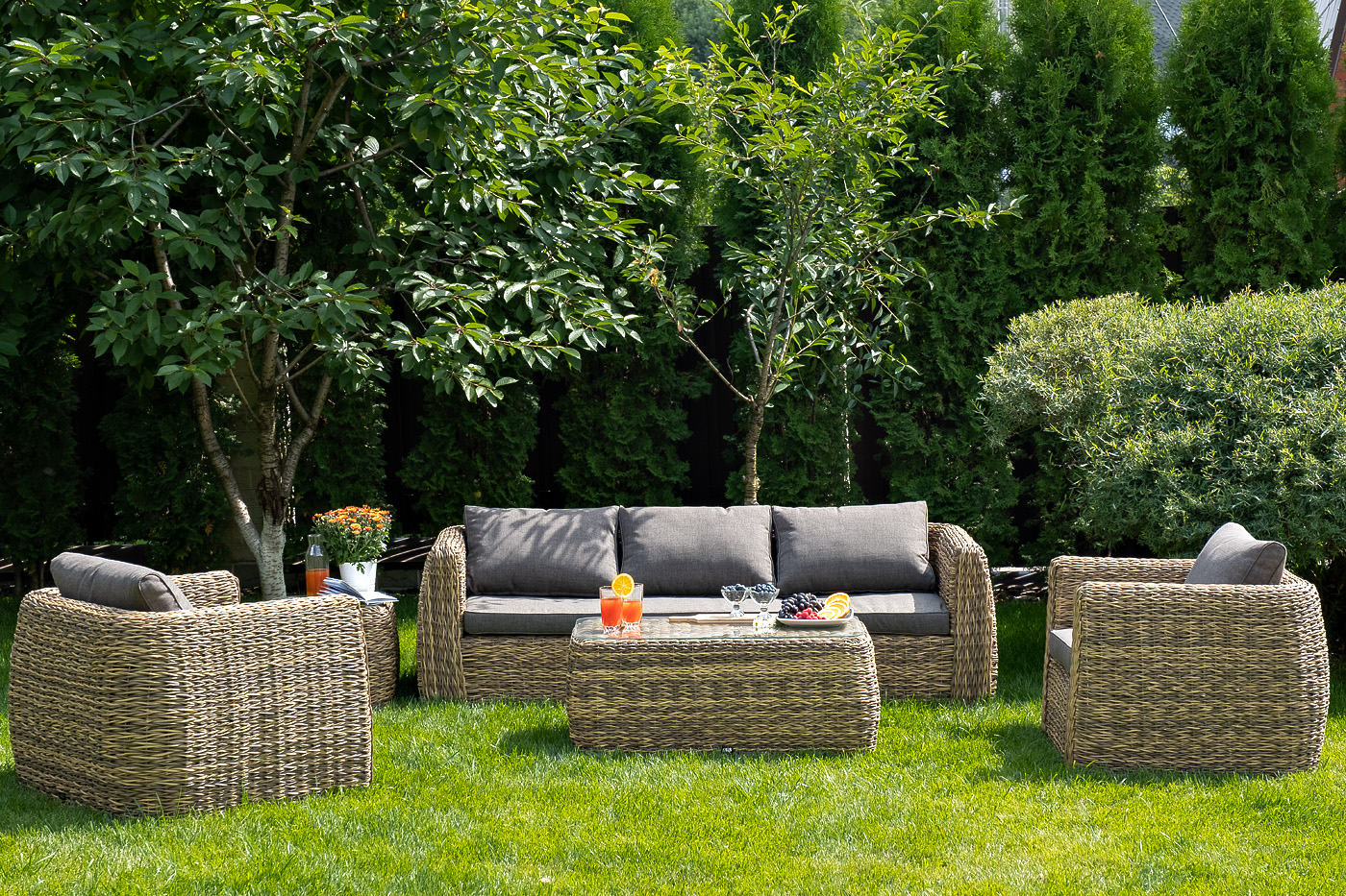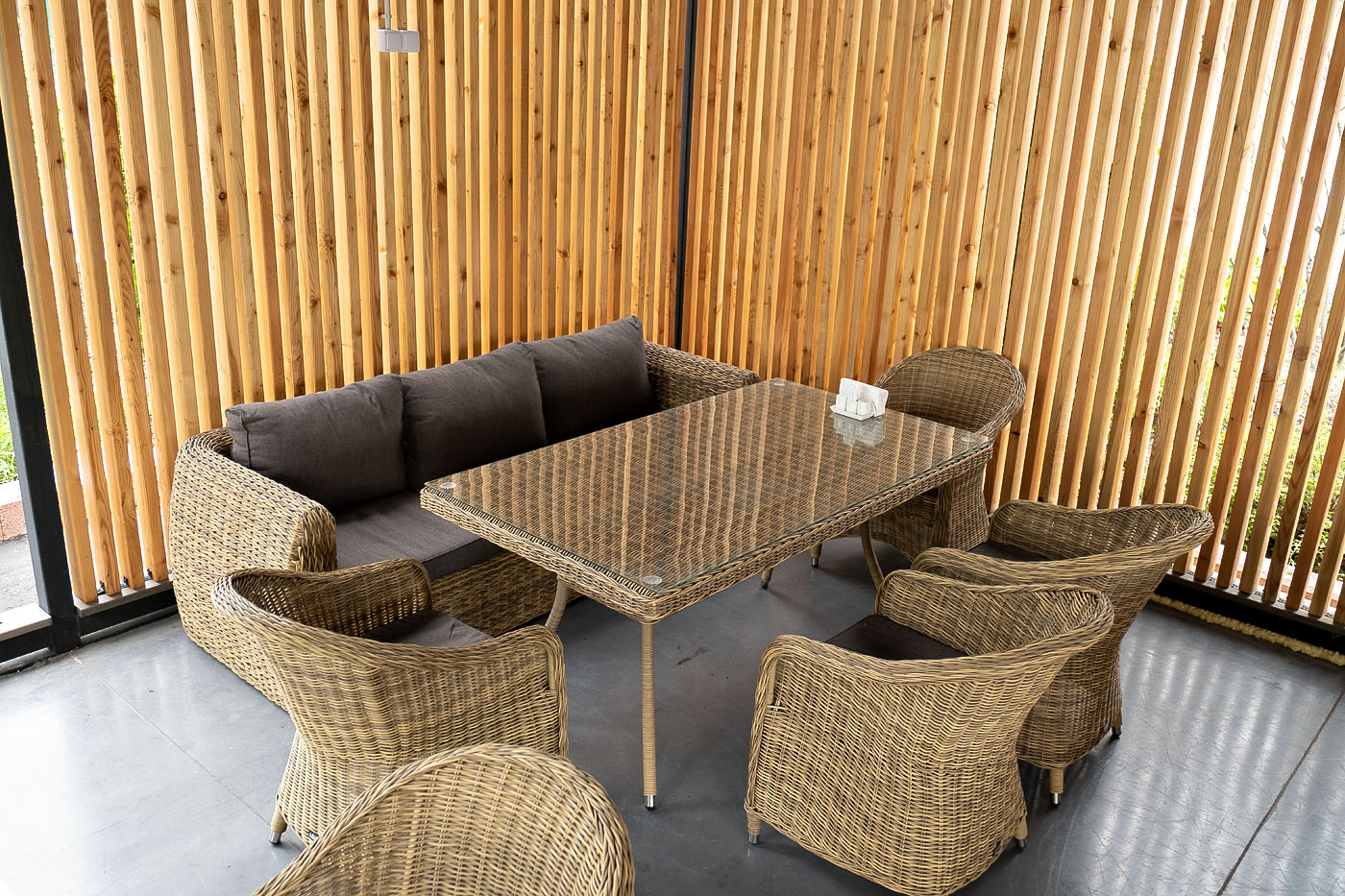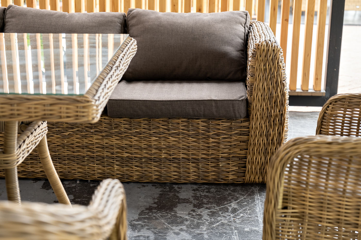 Ручное круглое плетение является основным декоративным элементом мебели. Оно выполнено из искусственного ротанга вида «гиацинт» в соломенном цвете.