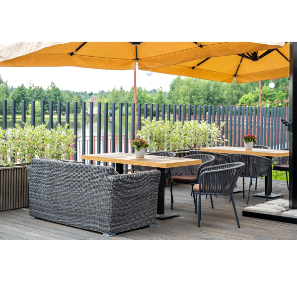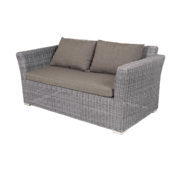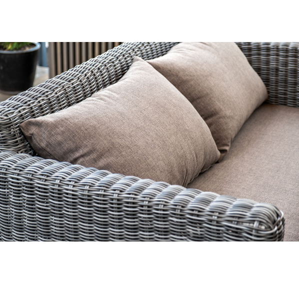 Двухместный диван дополнен несколькими подушками со съёмными чехлами серого цвета. Они изготовлены из прочного полиэстера, плотность которого достигает 300гр/м2. Предусмотрена влагоотталкивающая пропитка ткани для защиты текстильных изделий от намокания.