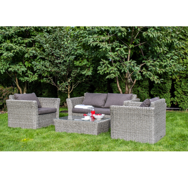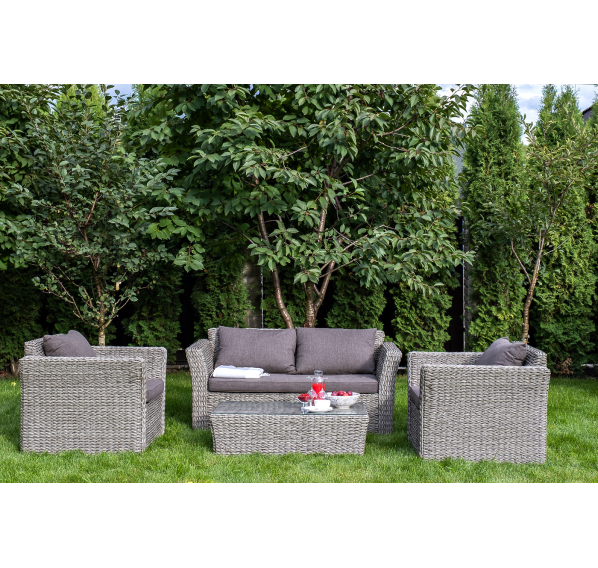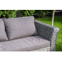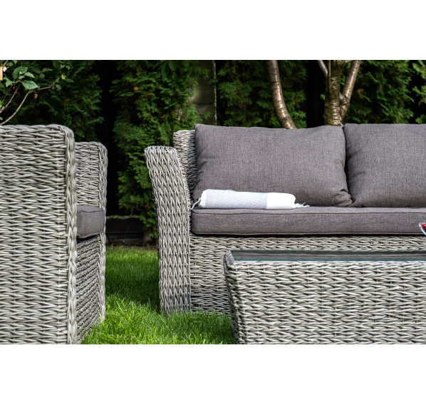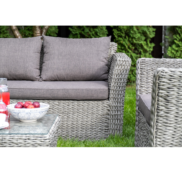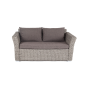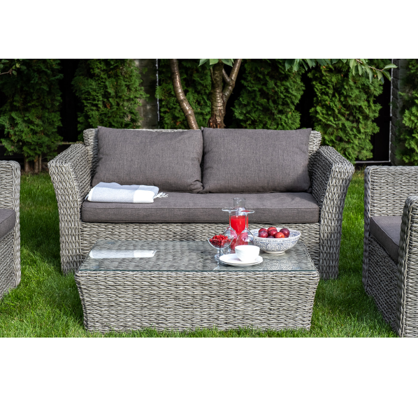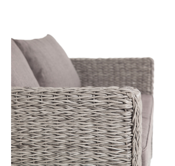 Диван выполнен из искусственного ротанга вида «гиацинт» серого цвета, оплетенного вручную.
