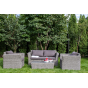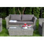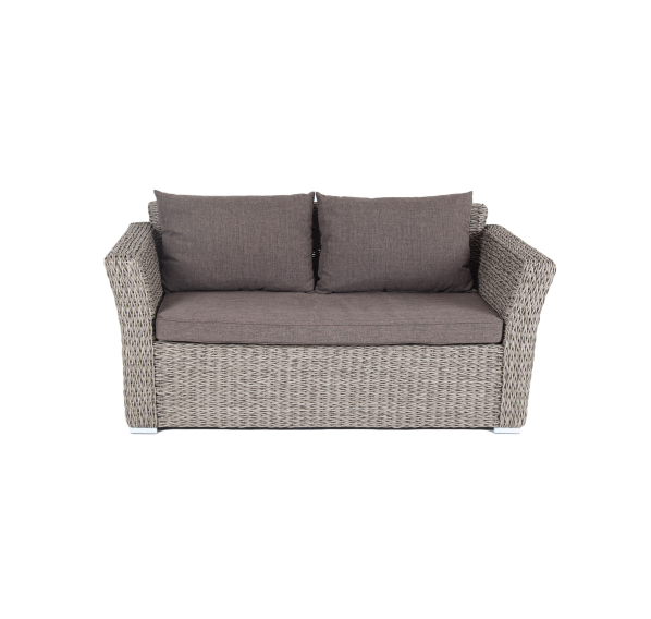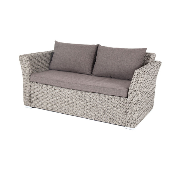 Двухместный диван дополнен несколькими подушками со съёмными чехлами серого цвета. Они изготовлены из прочного полиэстера, плотность которого достигает 300гр/м2. Предусмотрена влагоотталкивающая пропитка ткани для защиты текстильных изделий от намокания.