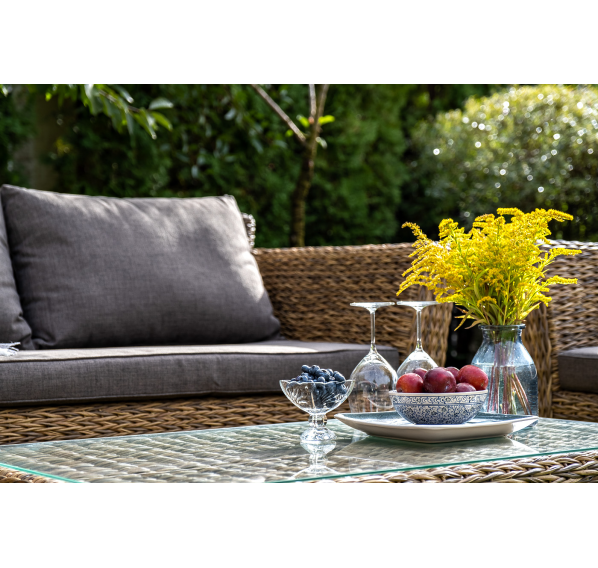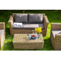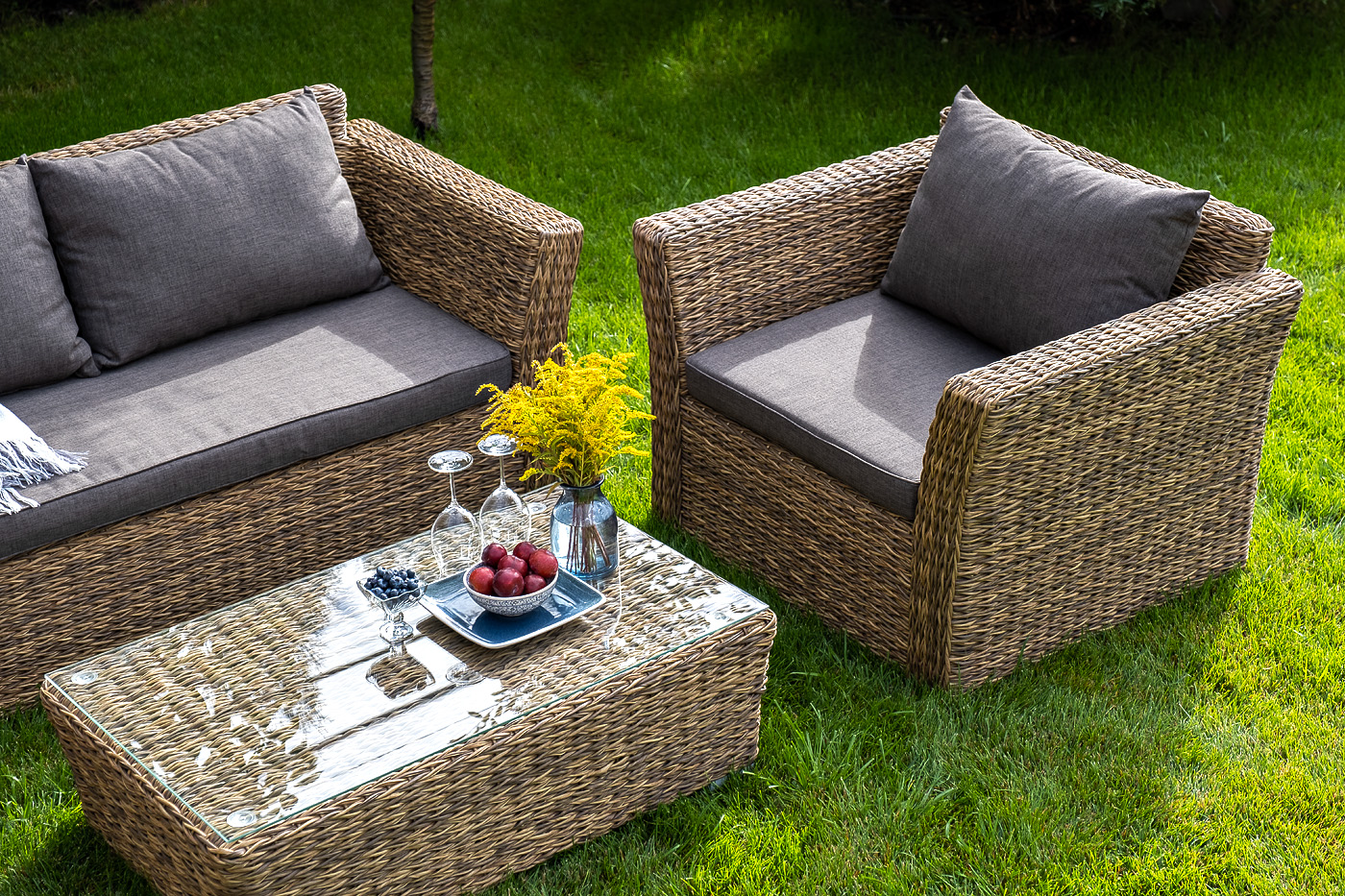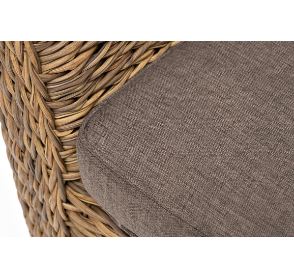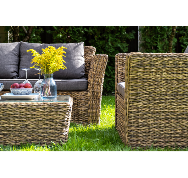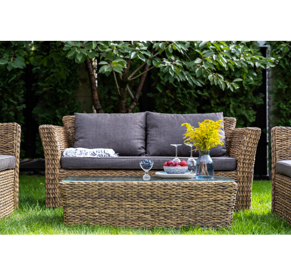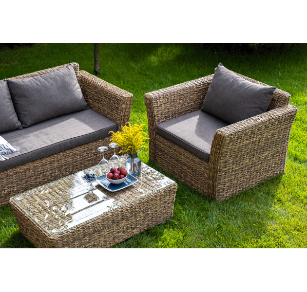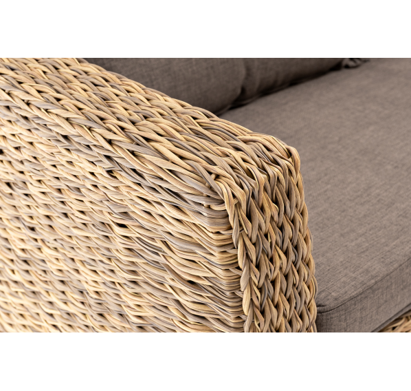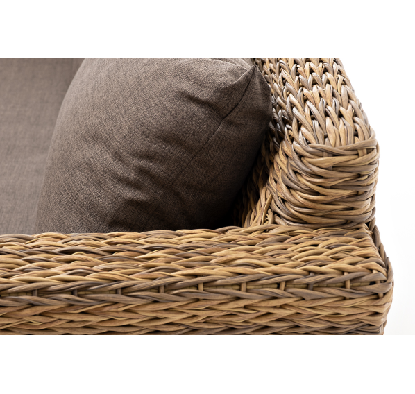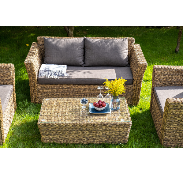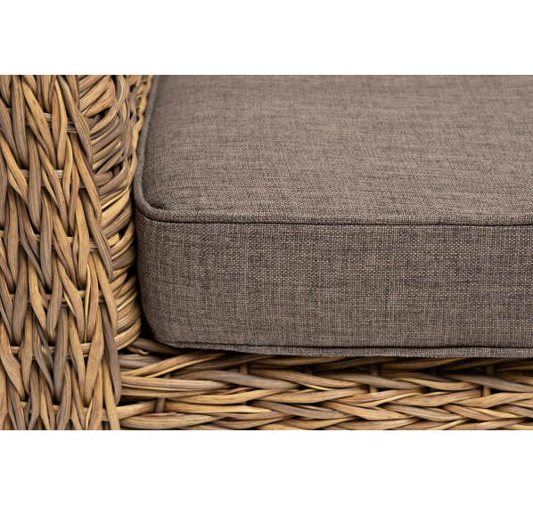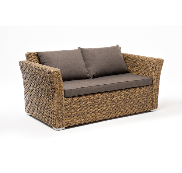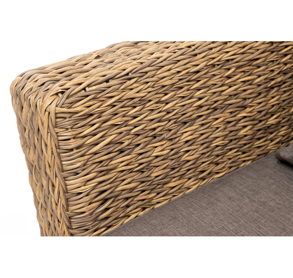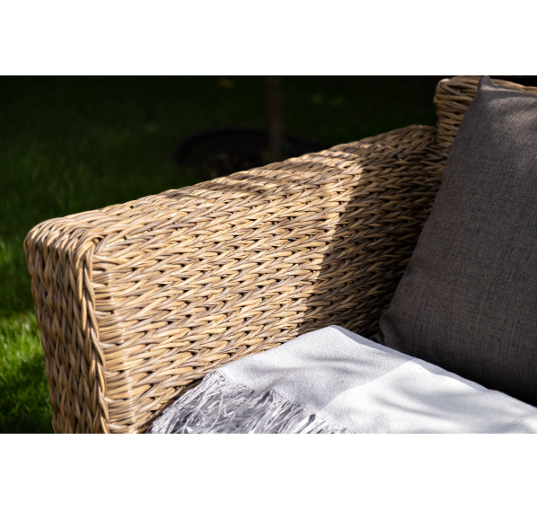 Диван выполнен из искусственного ротанга вида «гиацинт» соломенного цвета, оплетенного вручную.