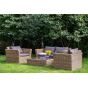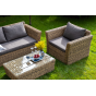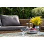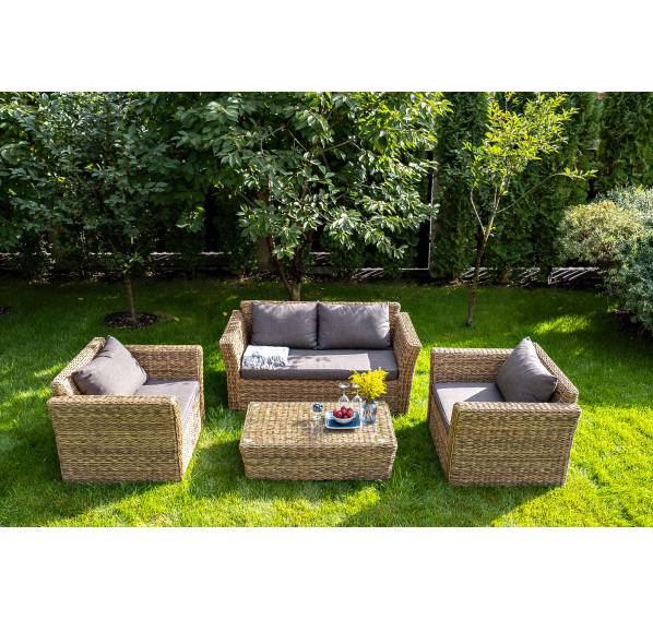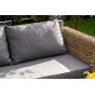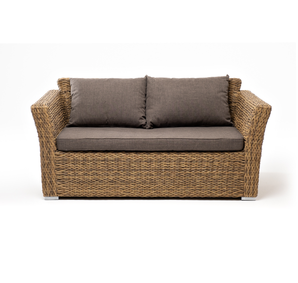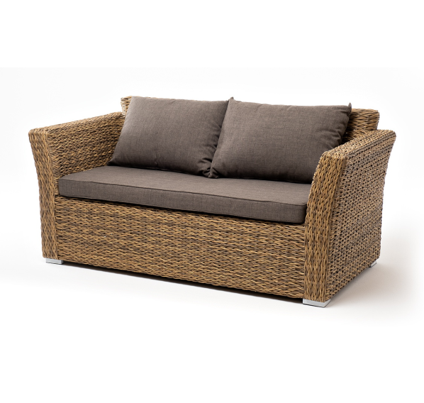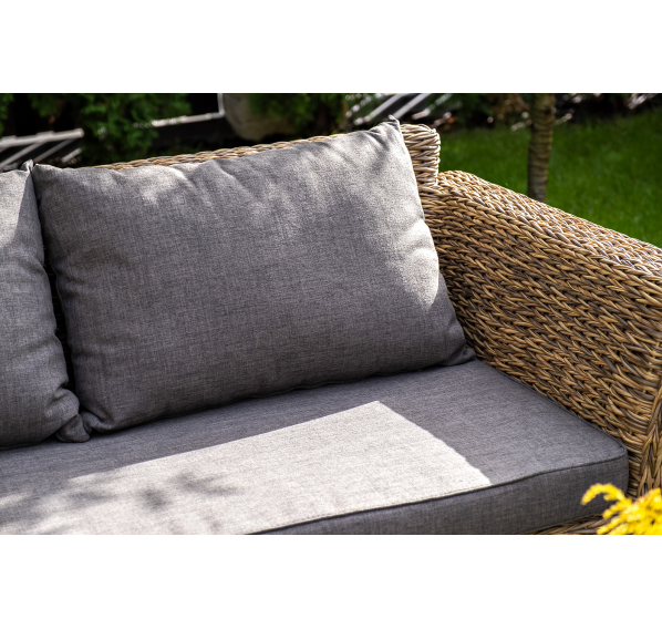 Двухместный диван дополнен несколькими подушками со съёмными чехлами серого цвета. Они изготовлены из прочного полиэстера, плотность которого достигает 300гр/м2. Предусмотрена влагоотталкивающая пропитка ткани для защиты текстильных изделий от намокания.