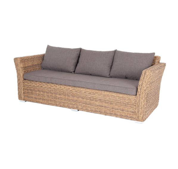 Трехместный диван укомплектован мягкими подушками, которые защищены съёмными чехлами в сером оттенке. При их пошиве используется износостойкий полиэстер, плотность которого достигает 300гр/м2. Предусмотрена влагоотталкивающая пропитка.