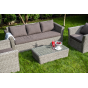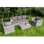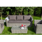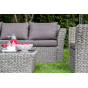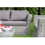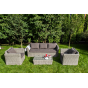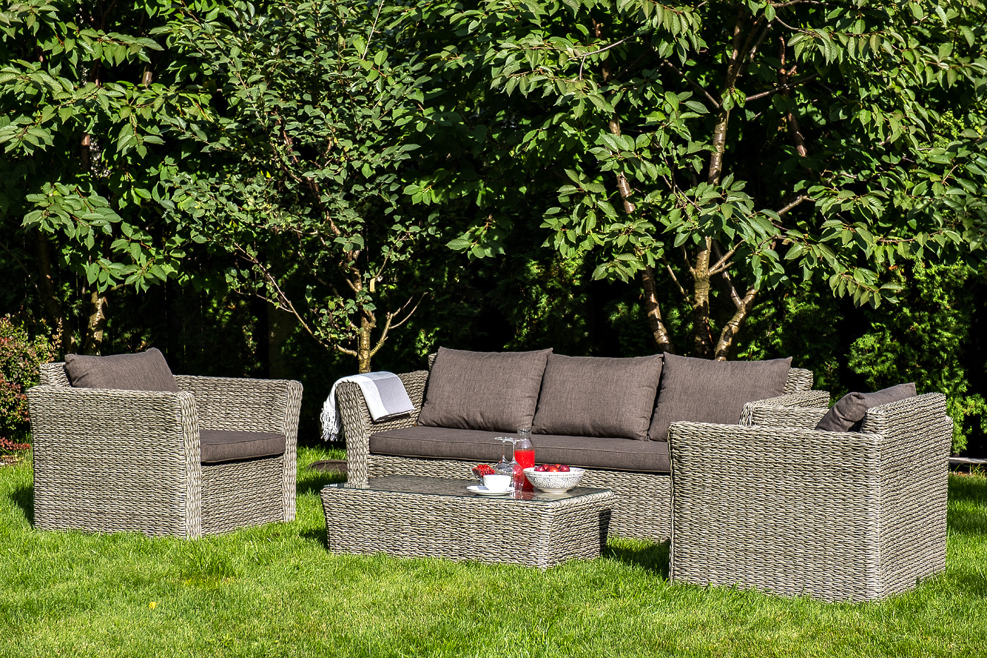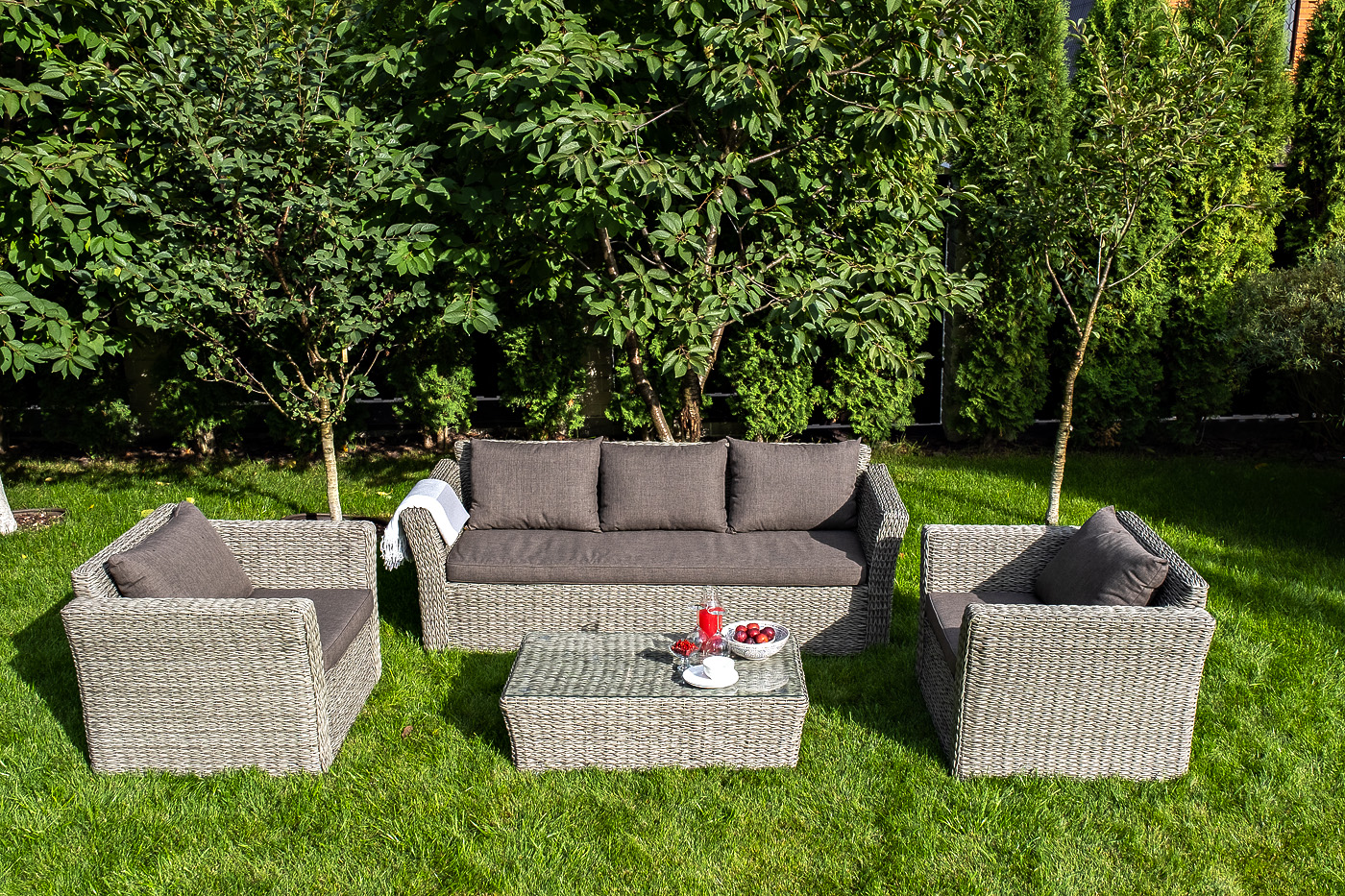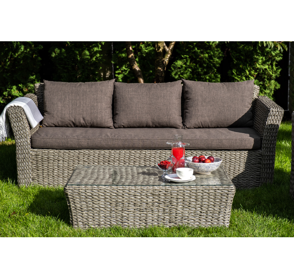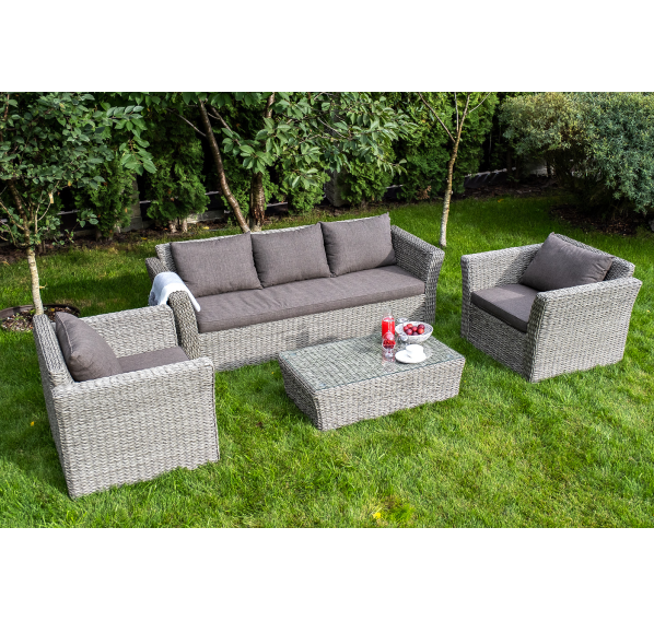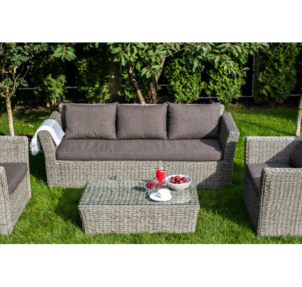 Мебель декорирована ручным плетением, выполненным из искусственного ротанга вида «гиацинт» серого цвета.