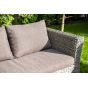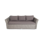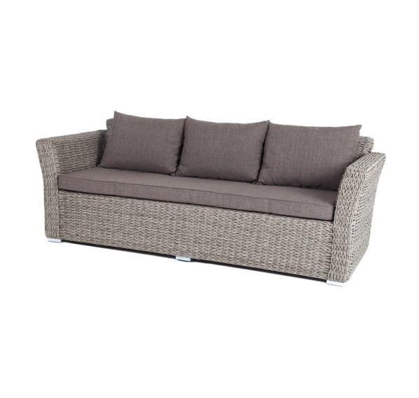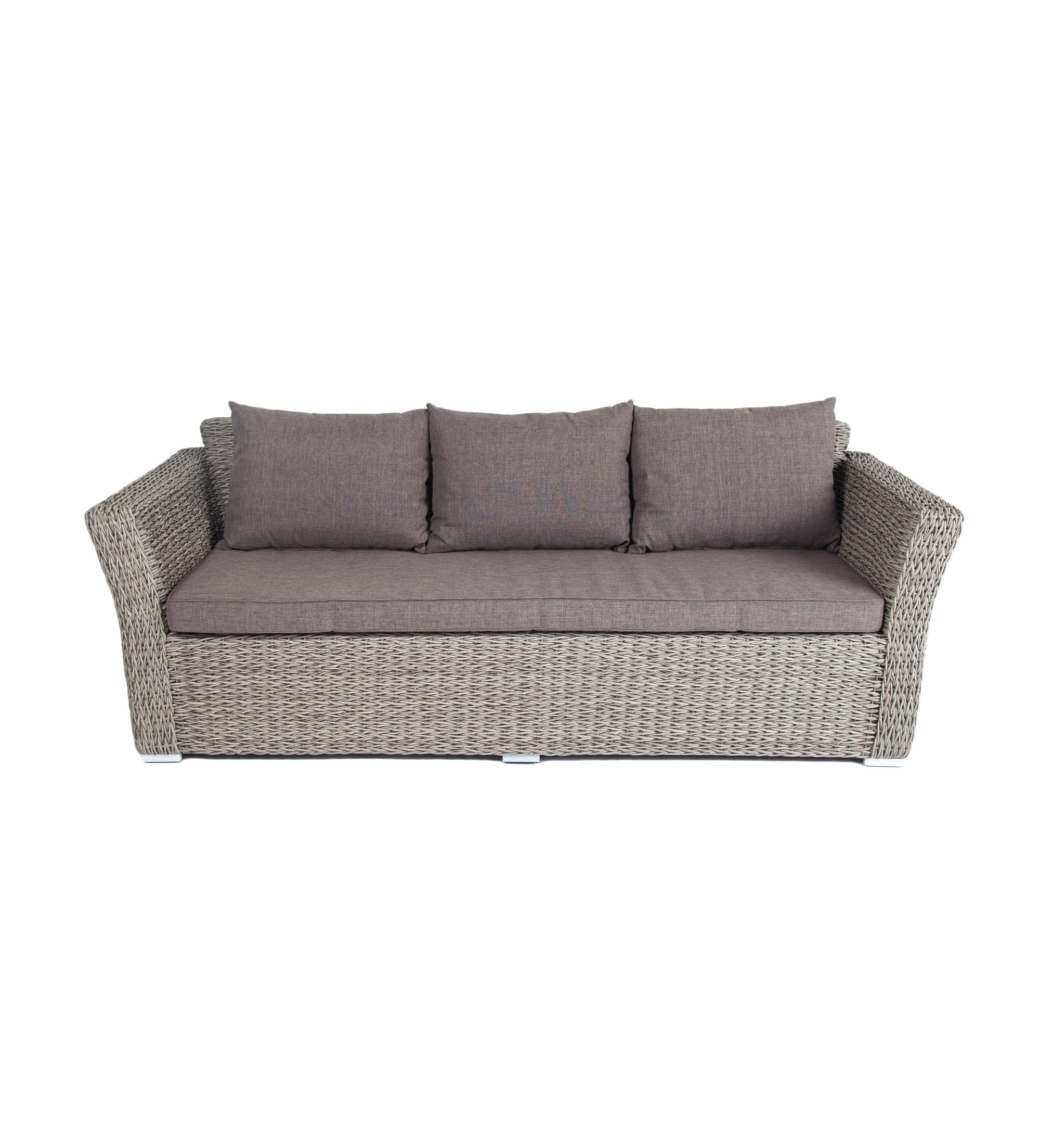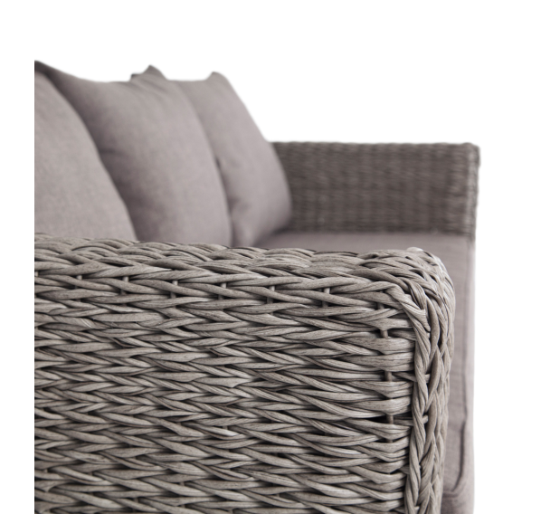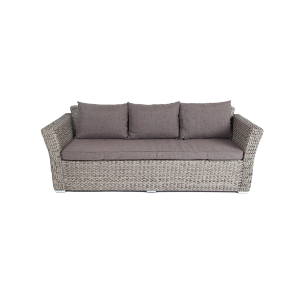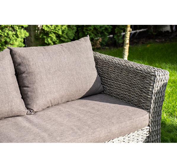 Трехместный диван укомплектован мягкими подушками, которые защищены съёмными чехлами в сером оттенке. При их пошиве используется износостойкий полиэстер, плотность которого достигает 300гр/м2. Предусмотрена влагоотталкивающая пропитка.