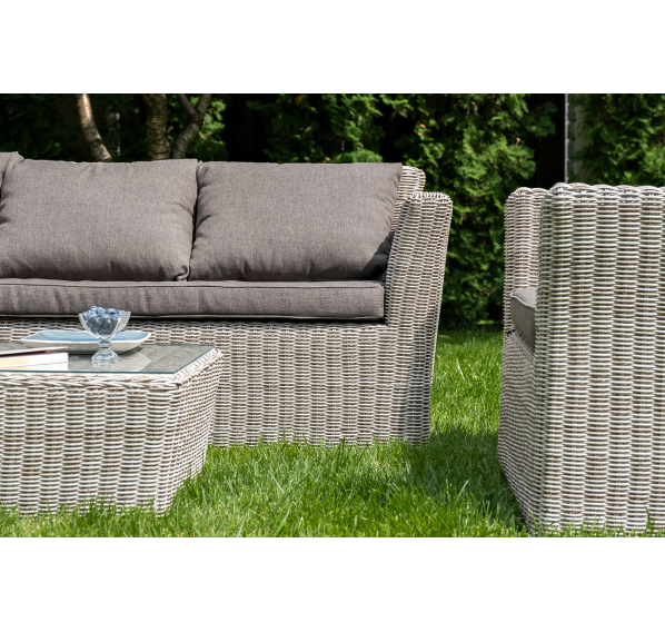 Диван из искусственного ротанга «Капучино» в своей основе имеет каркас из алюминия, который оплетен вручную круглым плетением бежевого цвета.