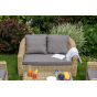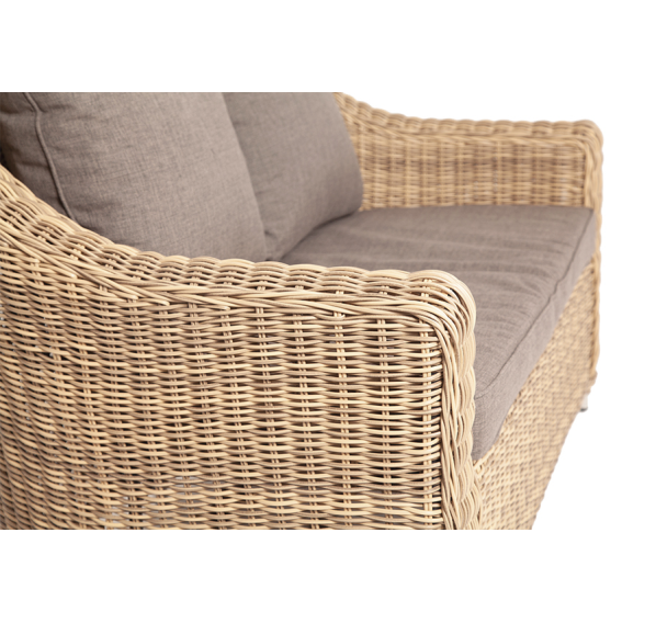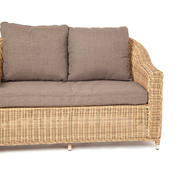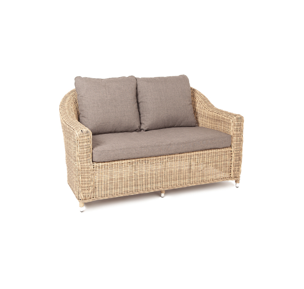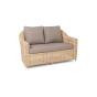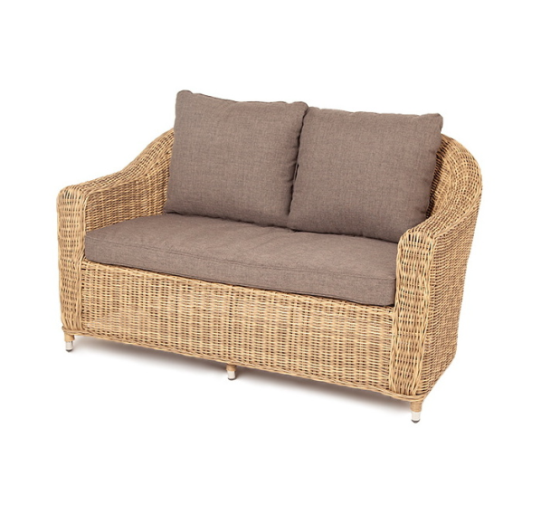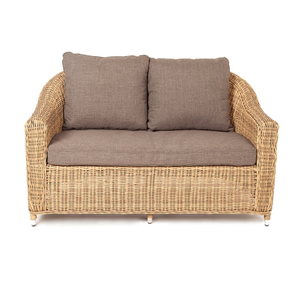 Диван из искусственного ротанга соломенного цвета «Кон Панна» дает возможность комфортно расположить две персоны благодаря комплектным подушкам из полиэстера с влагоотталкивающей пропиткой.