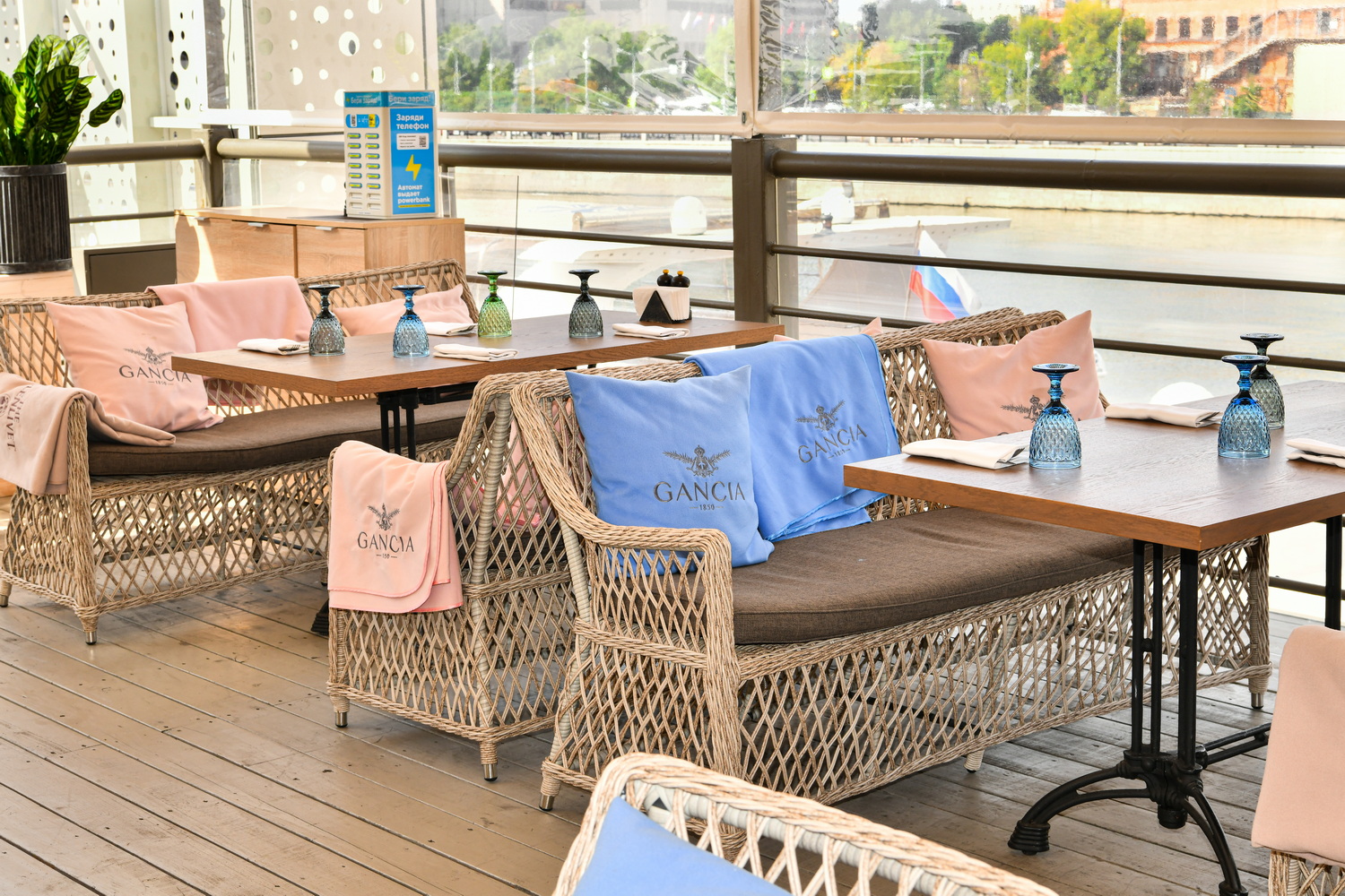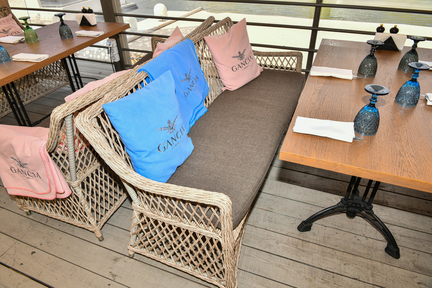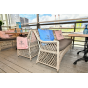 Каркас выполнен из алюминия, выдерживающий до 200 кг. Сверху все вручную оплетено круглым искусственным ротангом высокого качества. Цвет - бежевый. Под солнечным светом изящное плетение приобретает более насыщенный тон.