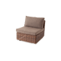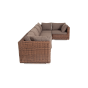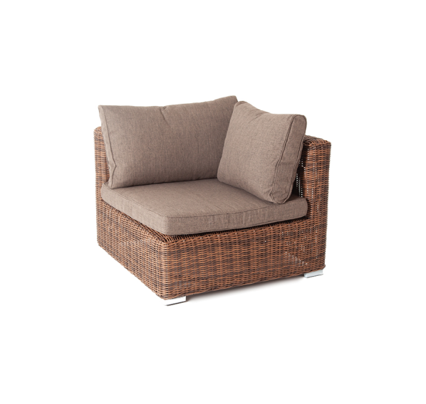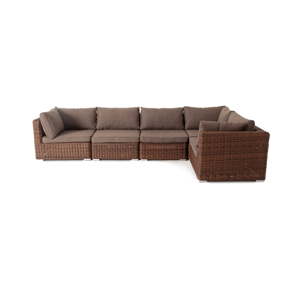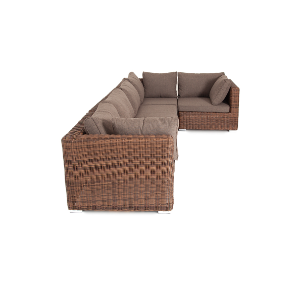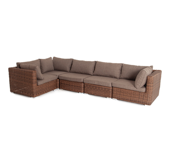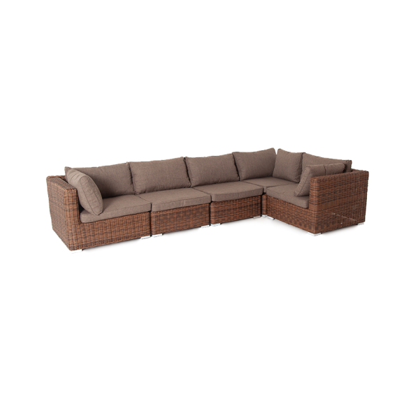 Диван из ротанга «Лунго» относится к группе трансформирующихся моделей, которые рассчитаны на большую компанию. Он состоит из набора модулей: трех угловых (размер – 860×860×650 мм) и двух прямых (740×860×650 мм).