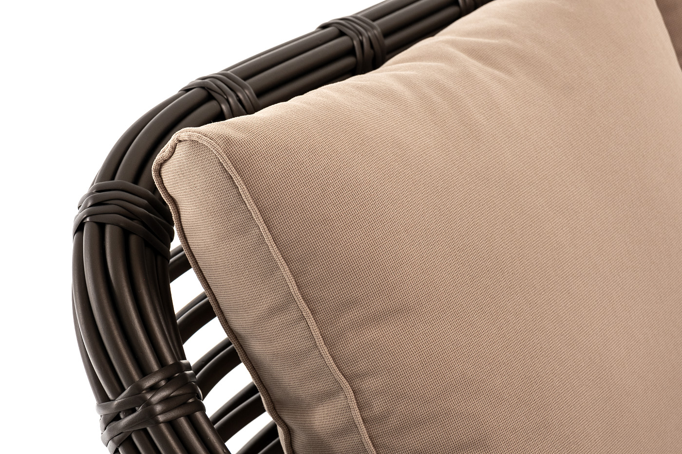Ручное круглое плетение является основным декоративным элементом мебели. Оно выполнено из искусственного ротанга в соломенном цвете.