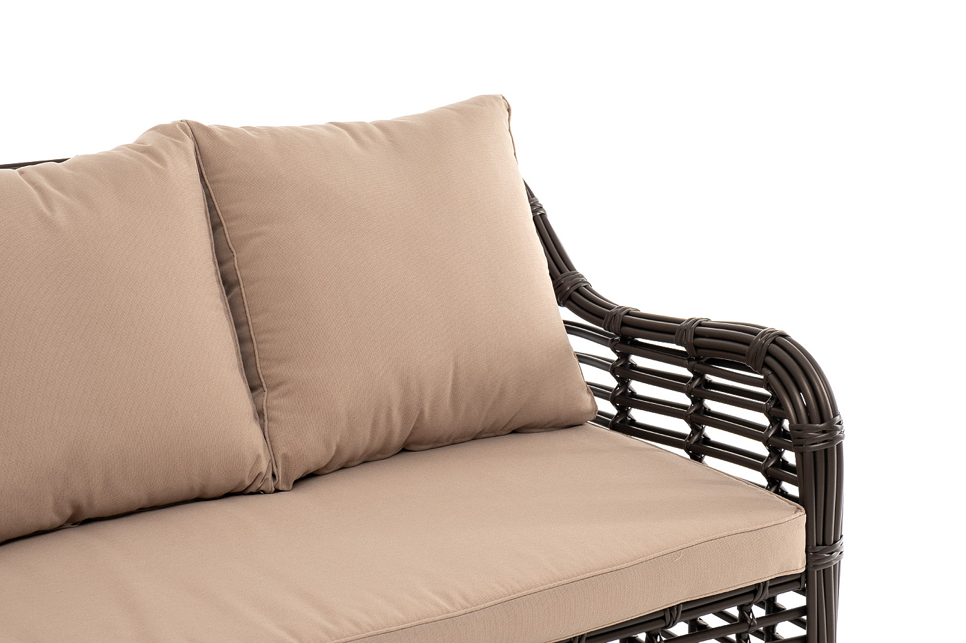 В комплекте с трехместным диваном идут мягкие подушки для комфортного расположения. Чехлы съёмные бежевого цвета из высококлассного полиэстера с плотностью 300гр/м2. Защитные свойства ткани усиливаются при помощи влагоотталкивающей пропитки.