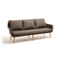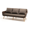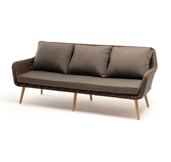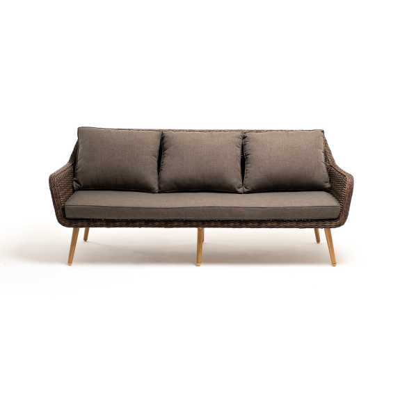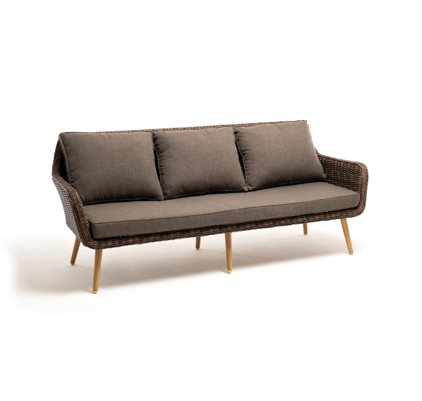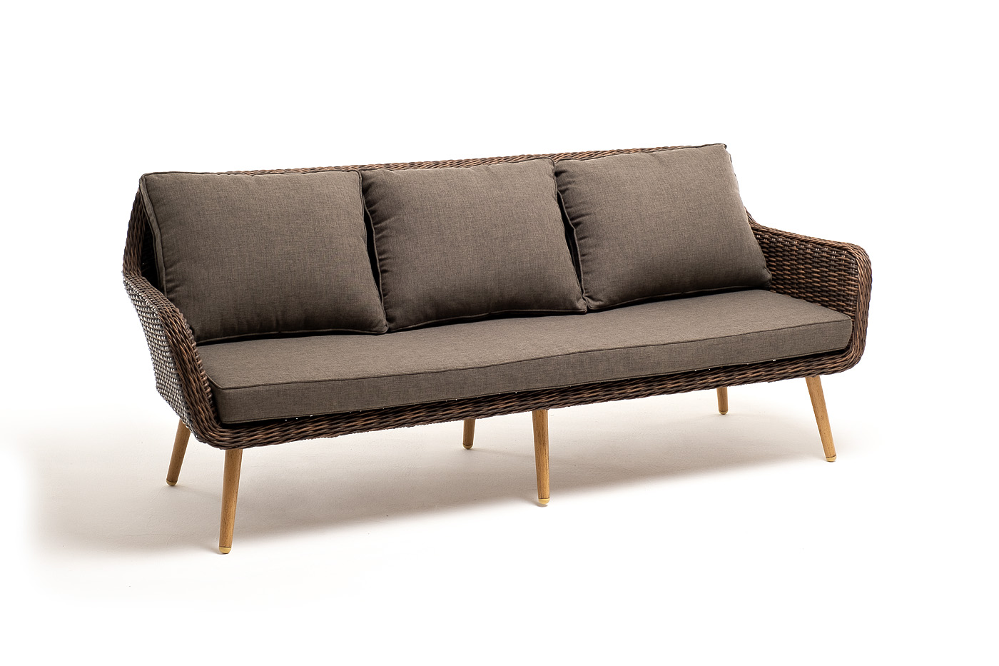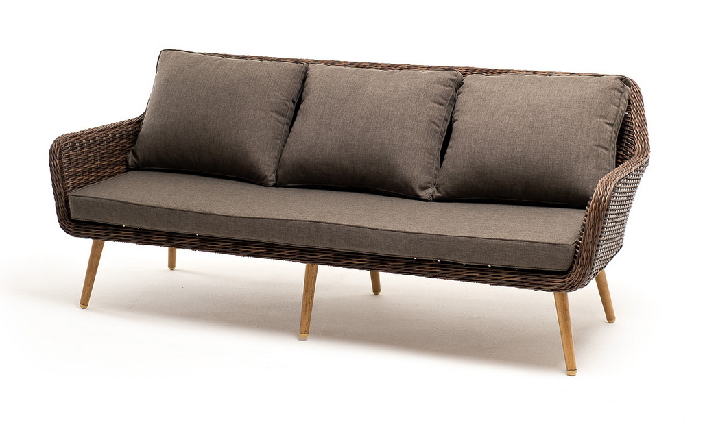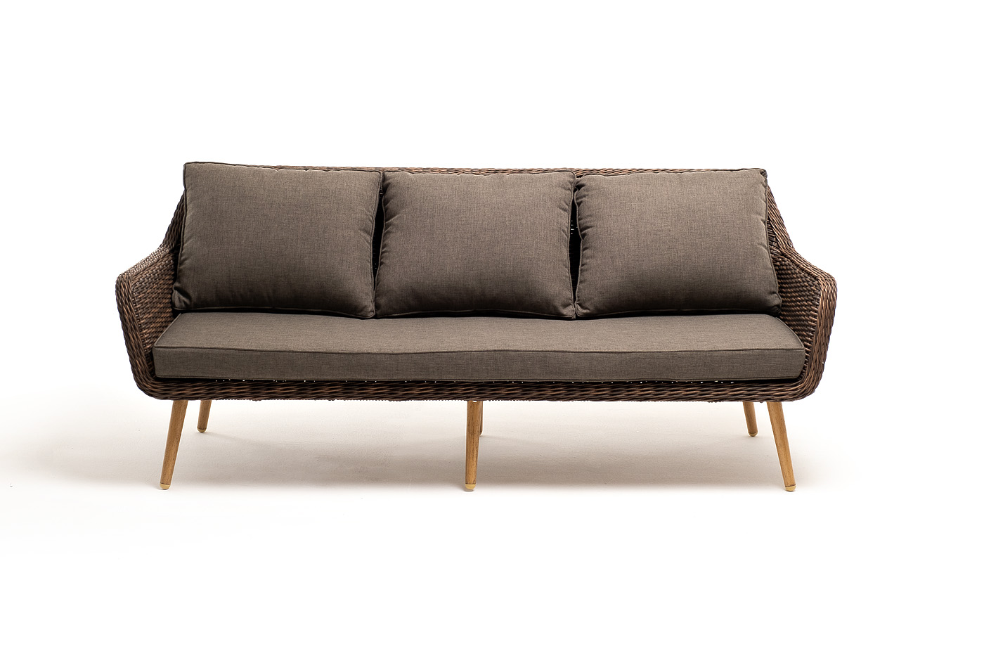 Трехместный диван дополняют мягкие подушки в сером цвете со съёмными чехлами. Тканевые изделия выполнены из прочного полиэстера плотностью 300гр/м2. Материал имеет влагоотталкивающую пропитку.
