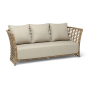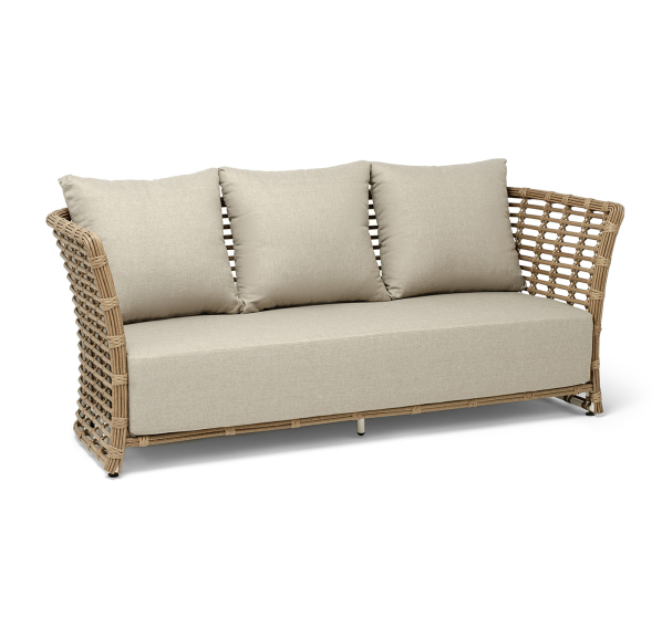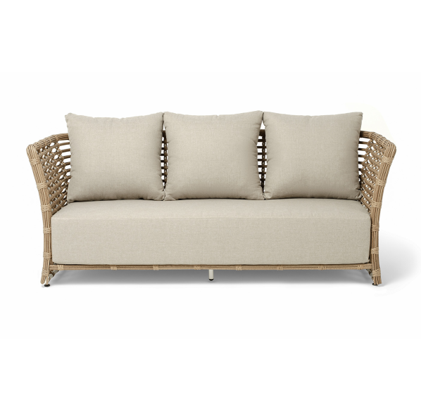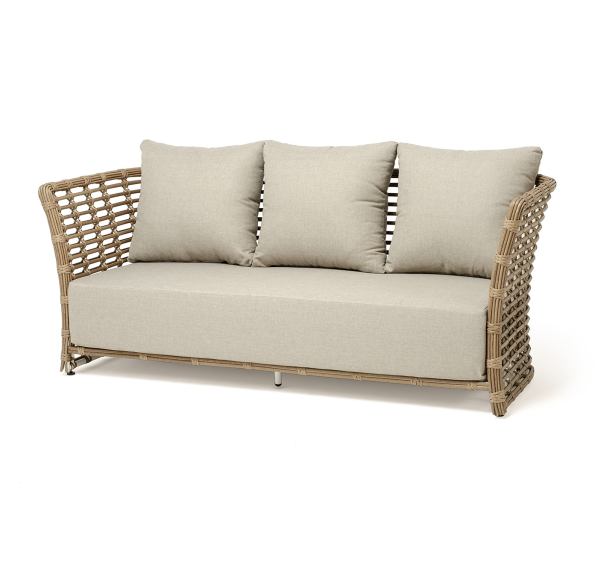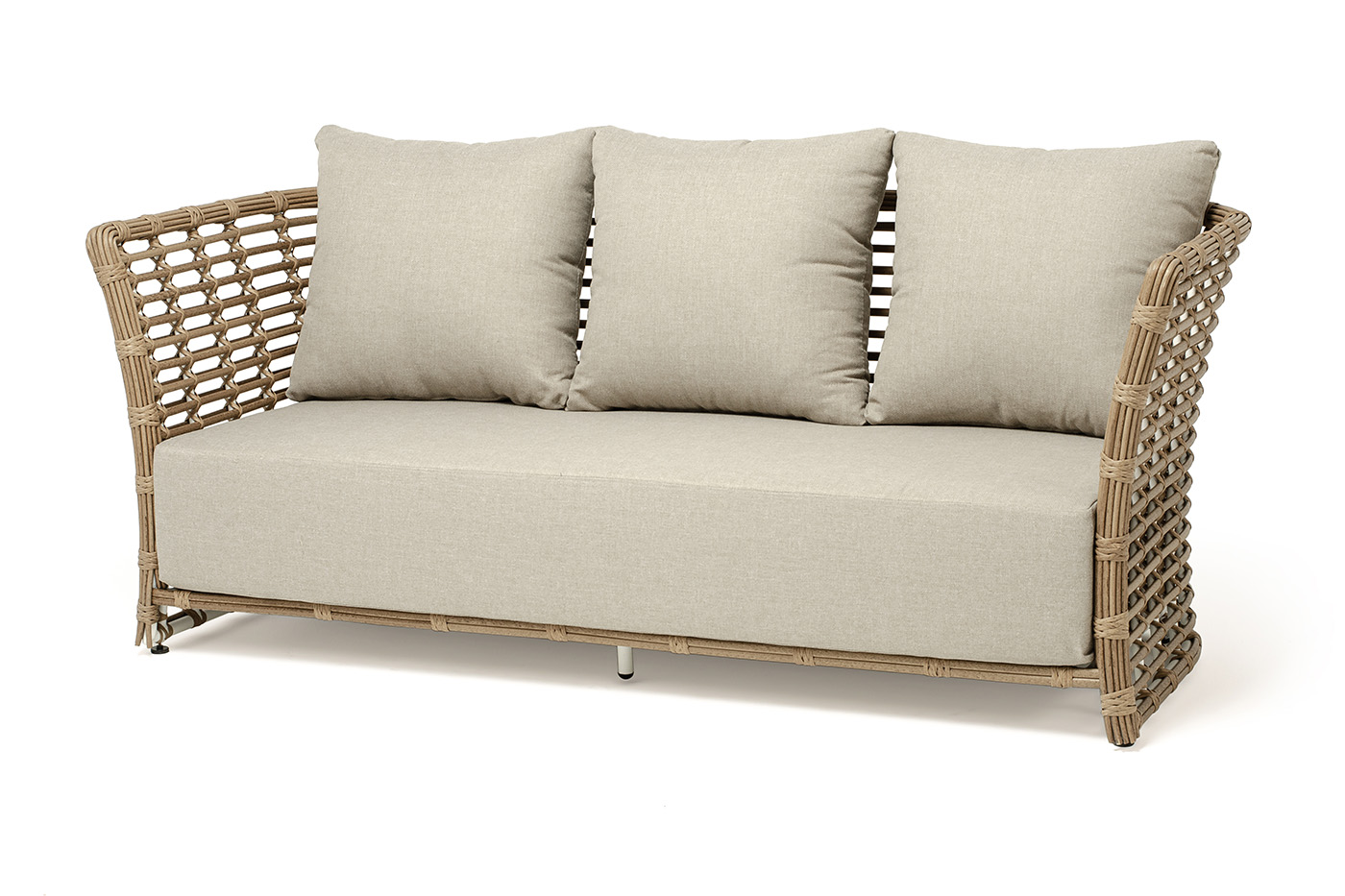 В комплекте с трехместным диваном идут мягкие подушки для комфортного расположения. Чехлы съёмные бежевого цвета из высококлассного полиэстера с плотностью 300гр/м2. Защитные свойства ткани усиливаются при помощи влагоотталкивающей пропитки.