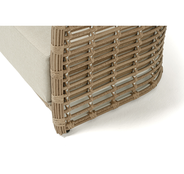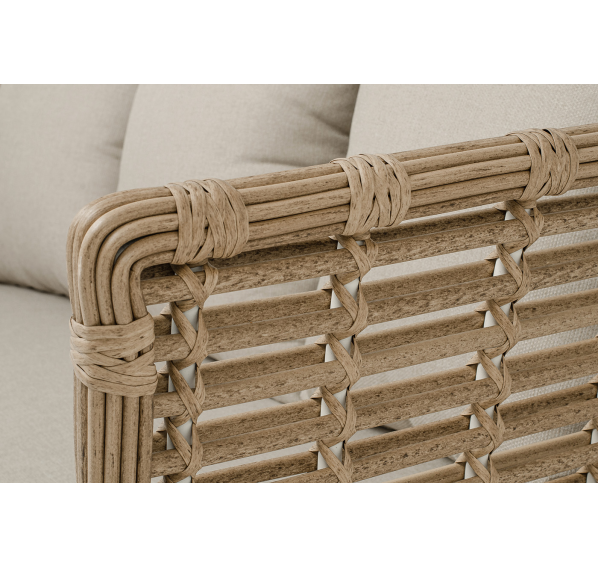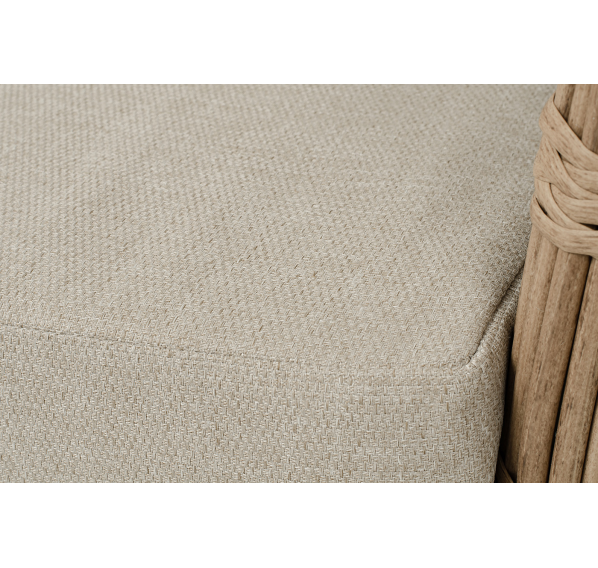 Ручное круглое плетение является основным декоративным элементом мебели. Оно выполнено из искусственного ротанга в соломенном цвете.