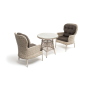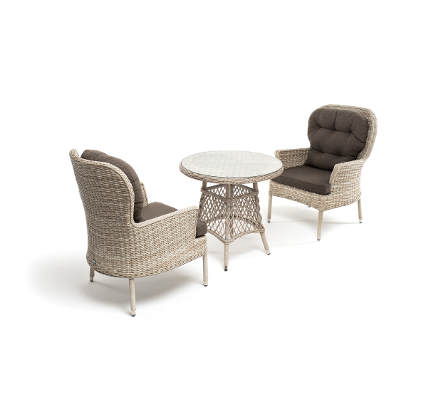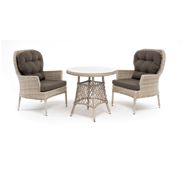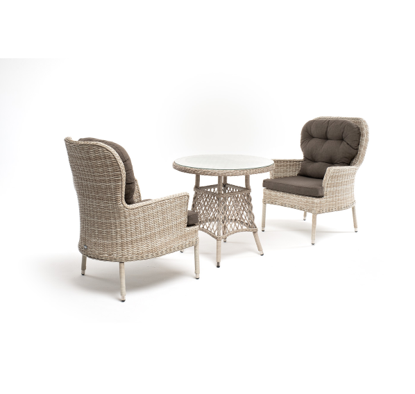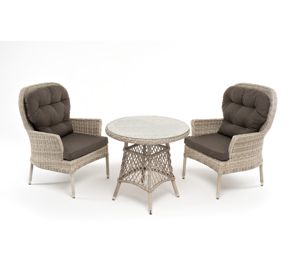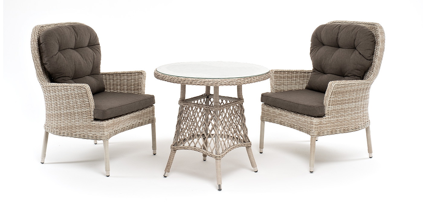 Кофейный комплект «Алиса» рассчитан на 2 персоны и подходит для расположения на балконе, в небольших гостиных, на террасе и других местах с ограниченным пространством. В основе каркас из алюминия.