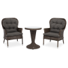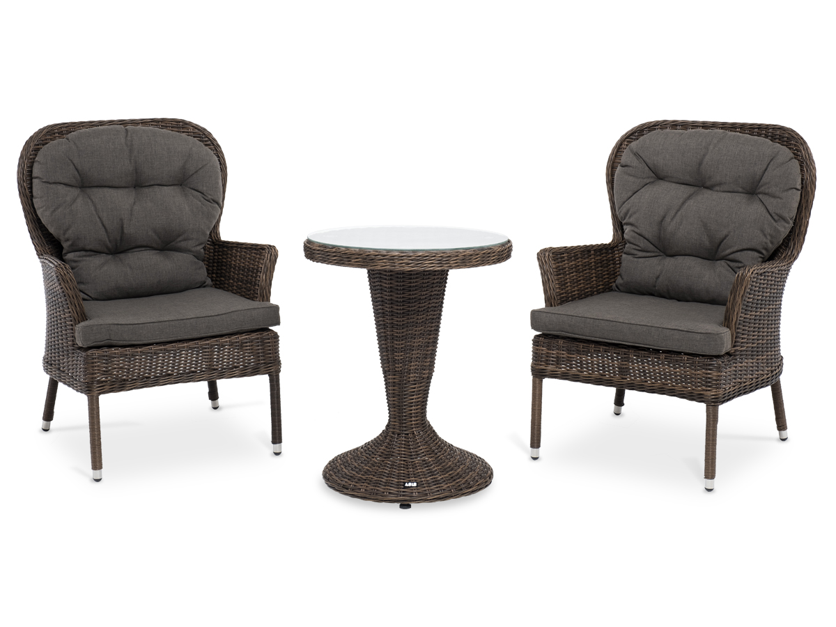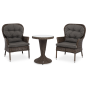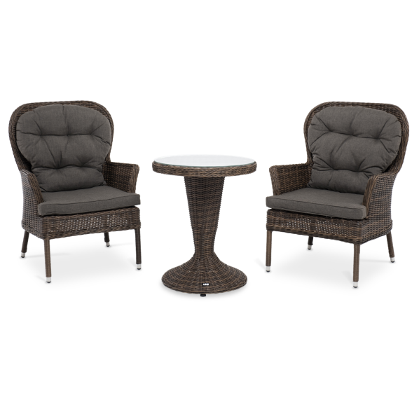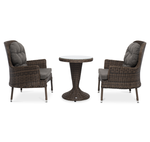 Кофейный комплект «Алиса» рассчитан на 2 персоны и подходит для расположения на балконе, в небольших гостиных, на террасе и других местах с ограниченным пространством. В основе каркас из алюминия.