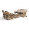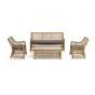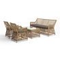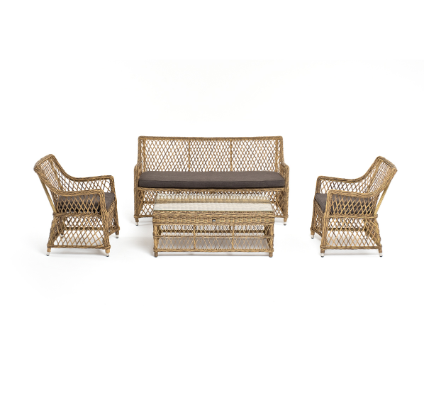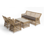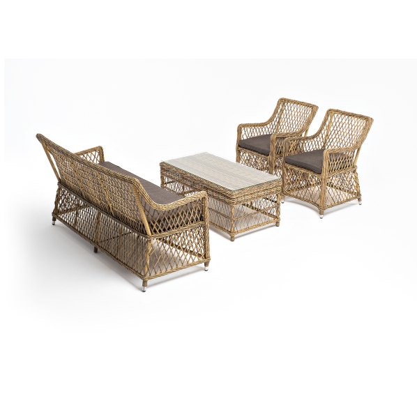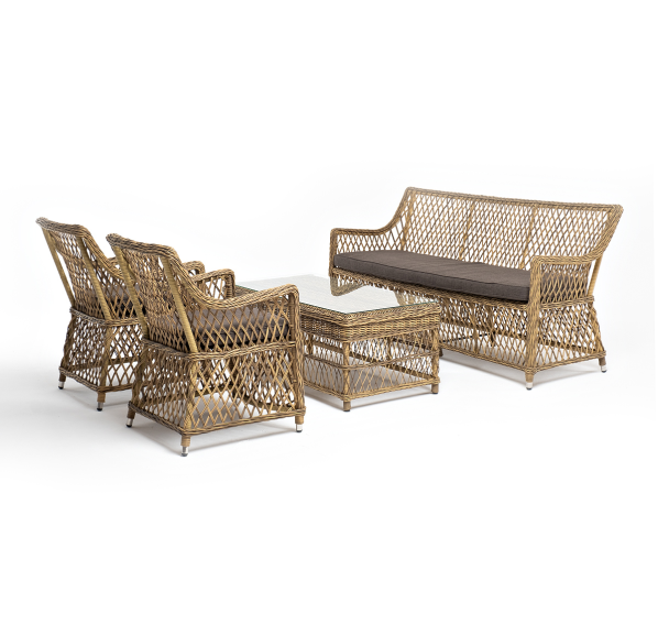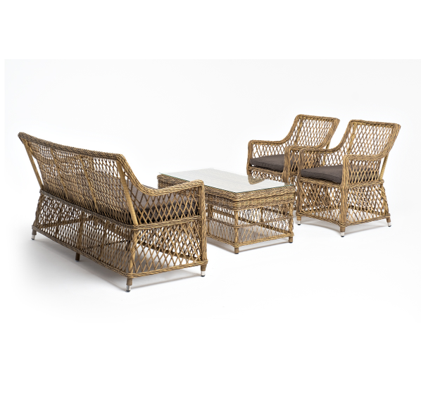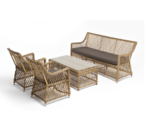 Оплетка выполнена вручную искусственным ротангом соломенного цвета, диван и кресло укомплектованы подушками из 100% полиэстера, которые пропитаны специальным составом, обладающим влагоотталкивающим свойством.