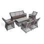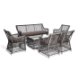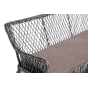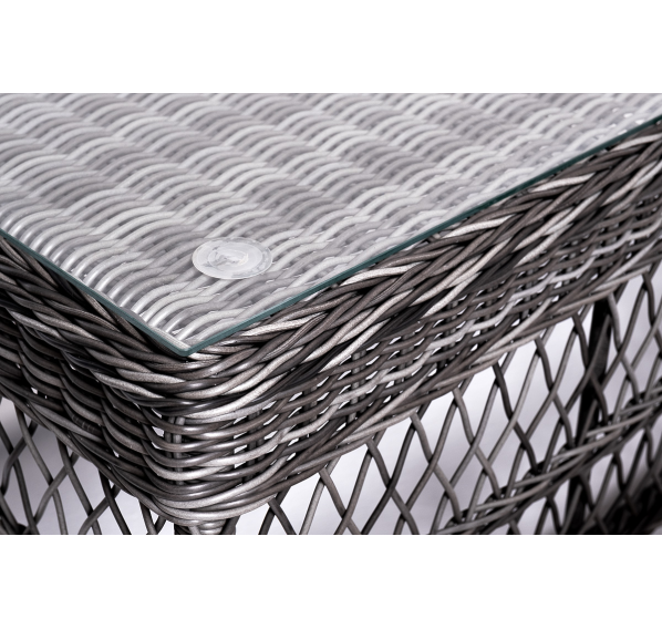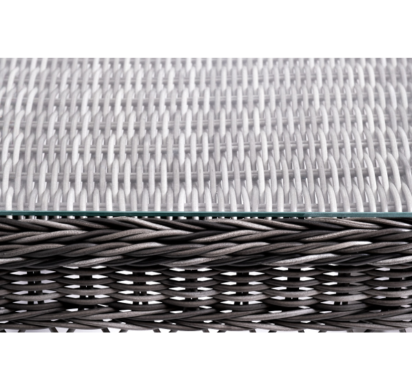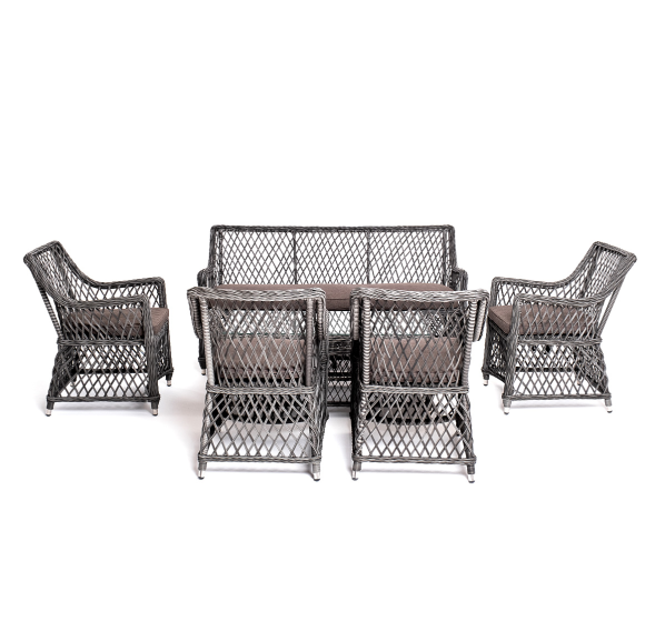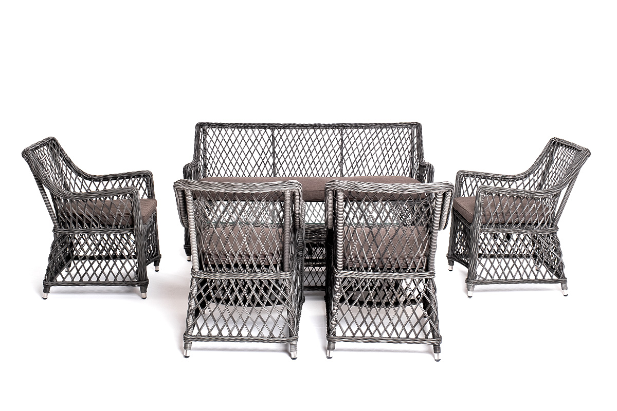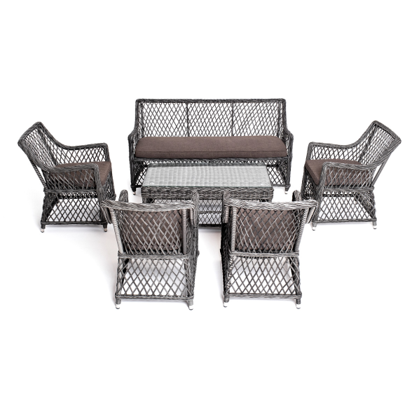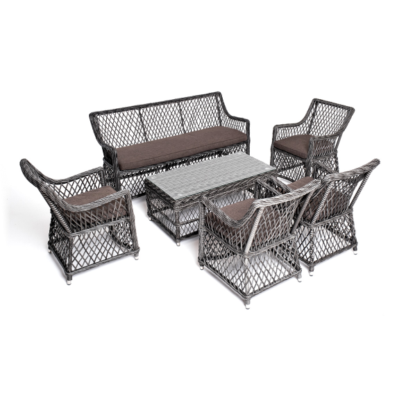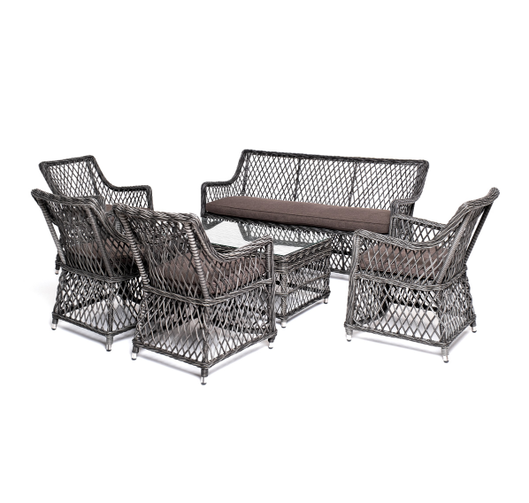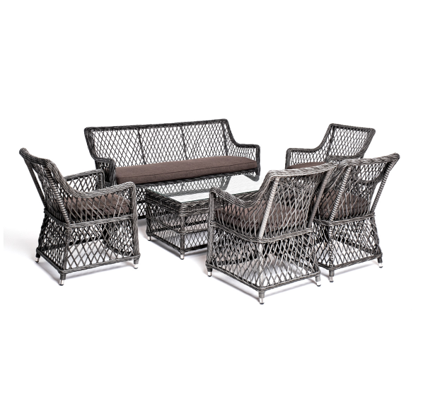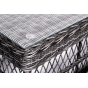 Оплетка выполнена вручную искусственным ротангом в цвете графит, диван и кресло укомплектованы подушками из 100% полиэстера, которые пропитаны специальным составом, обладающим влагоотталкивающим свойством.