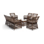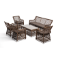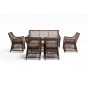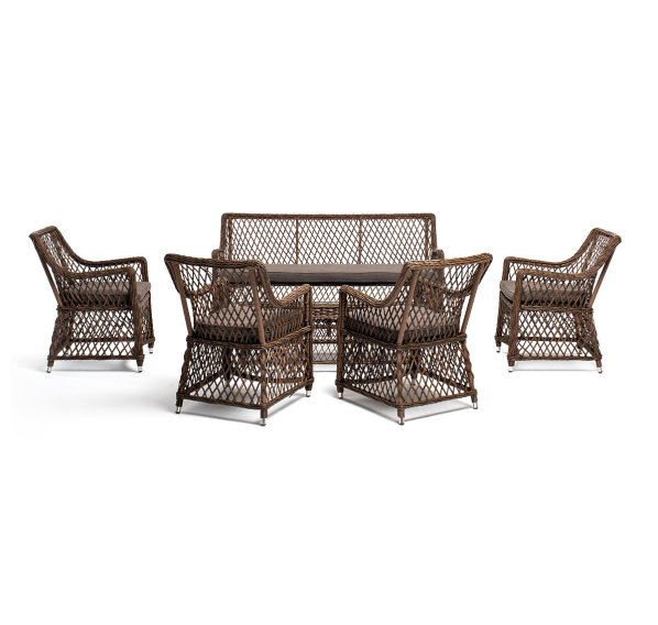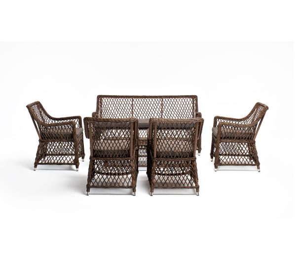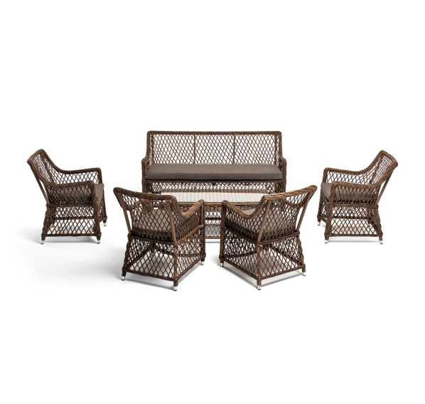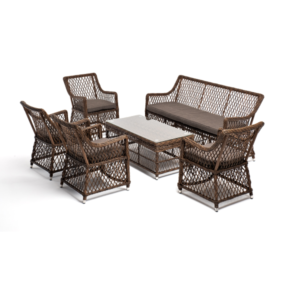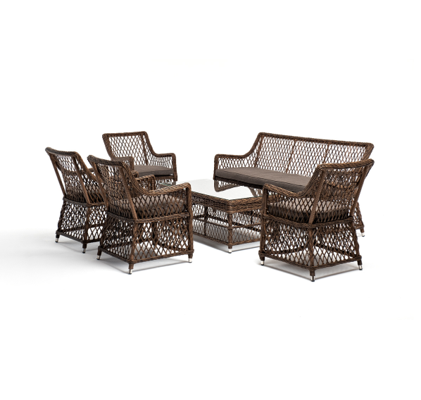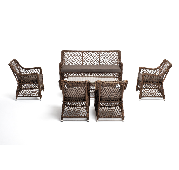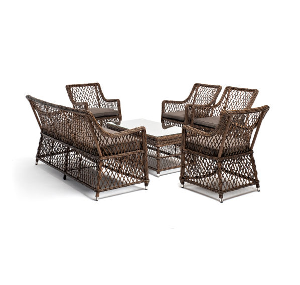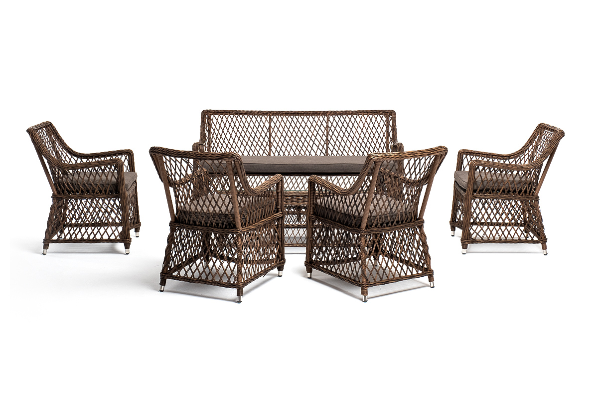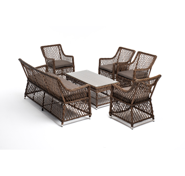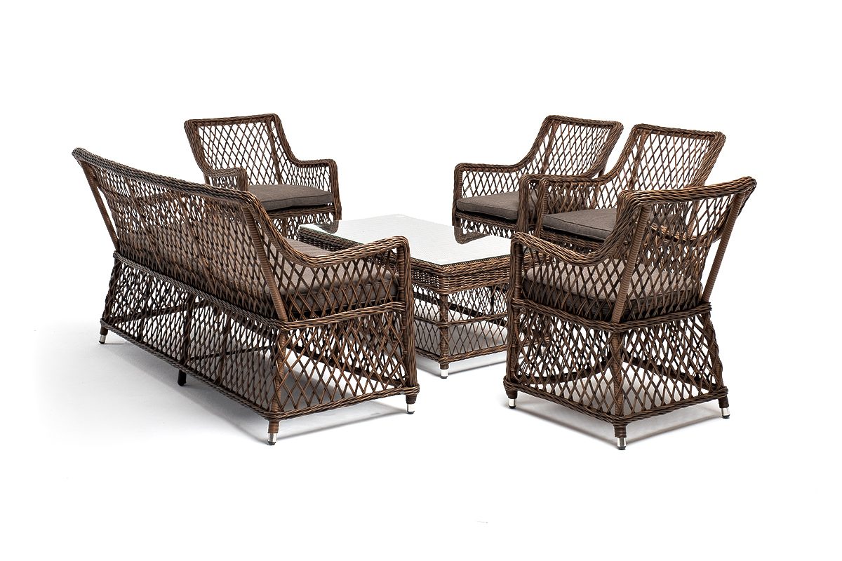 Оплетка выполнена вручную искусственным ротангом коричневого цвета, диван и кресло укомплектованы подушками из 100% полиэстера, которые пропитаны специальным составом, обладающим влагоотталкивающим свойством.