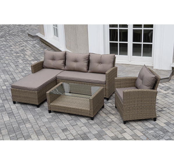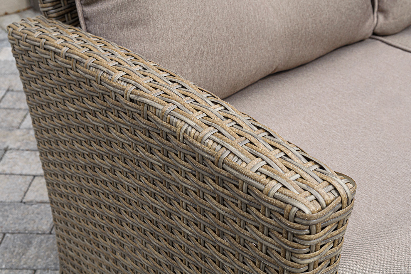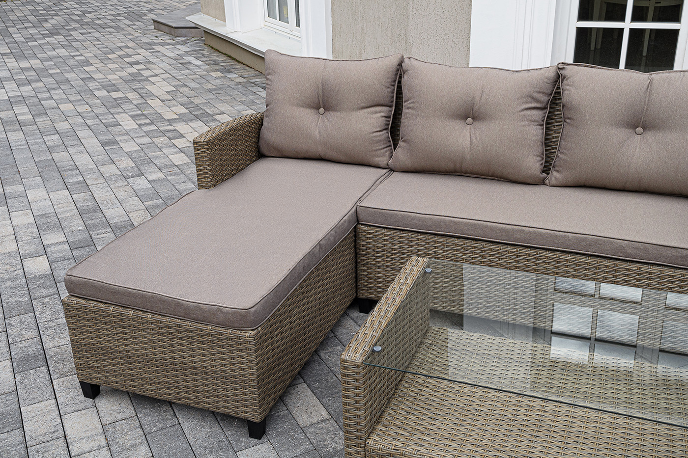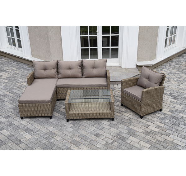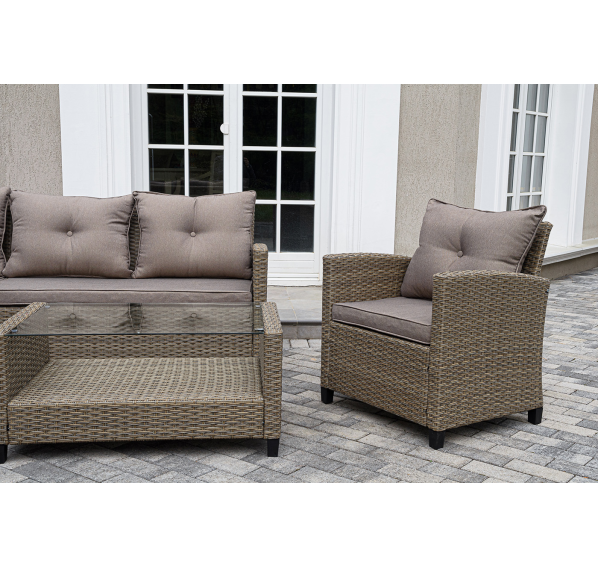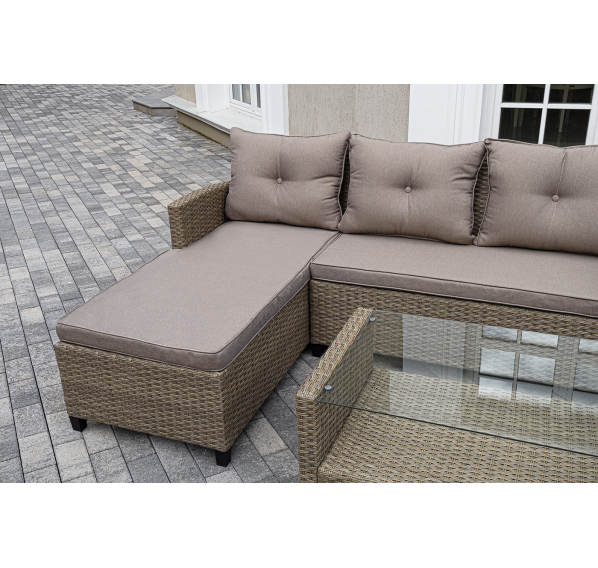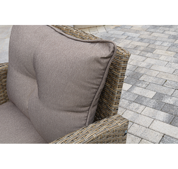 Плетеная мебель дополнена удобными подушками в бежевых чехлах. При их изготовлении используют полиэстер, плотность – 230гр/м2.