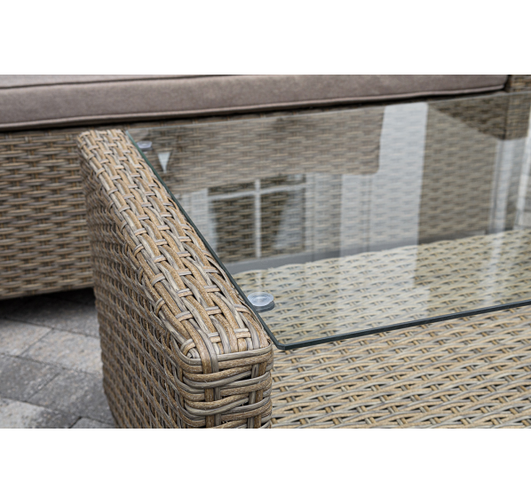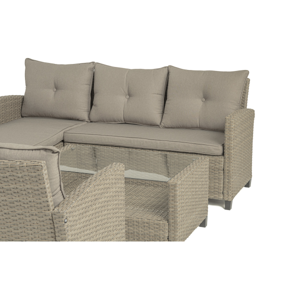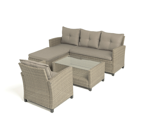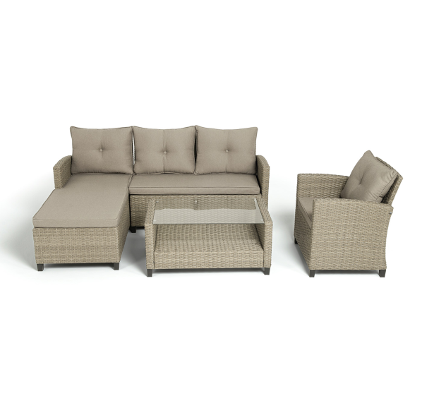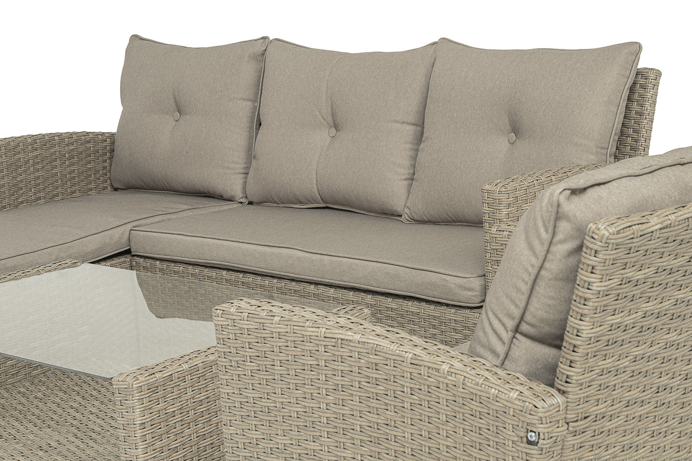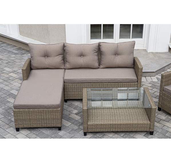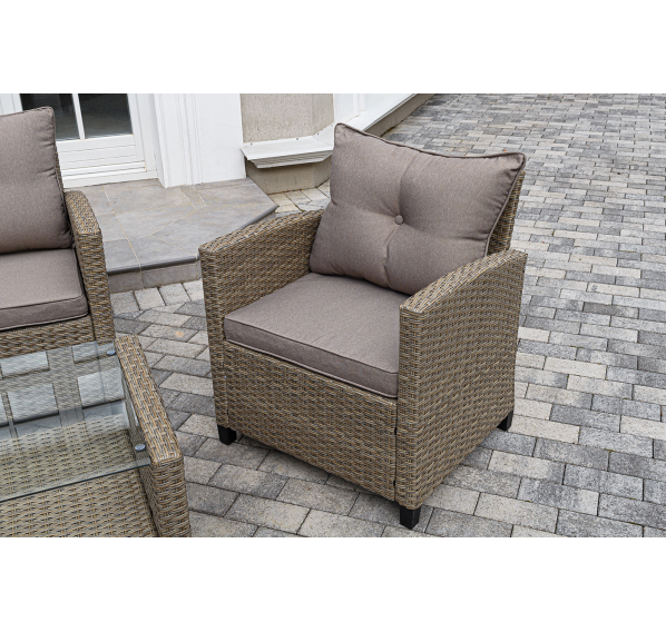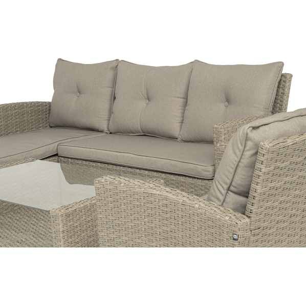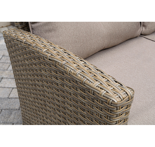 Плетеная мебель дополнена удобными подушками в бежевых чехлах. При их изготовлении используют полиэстер, плотность – 230гр/м2.