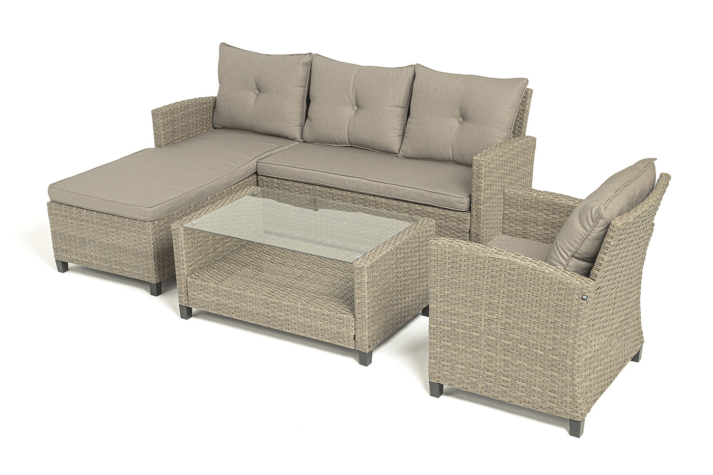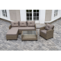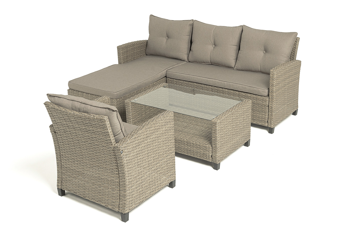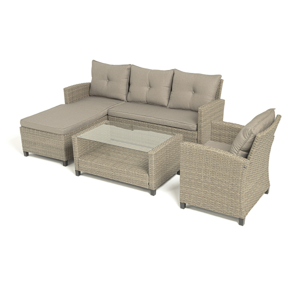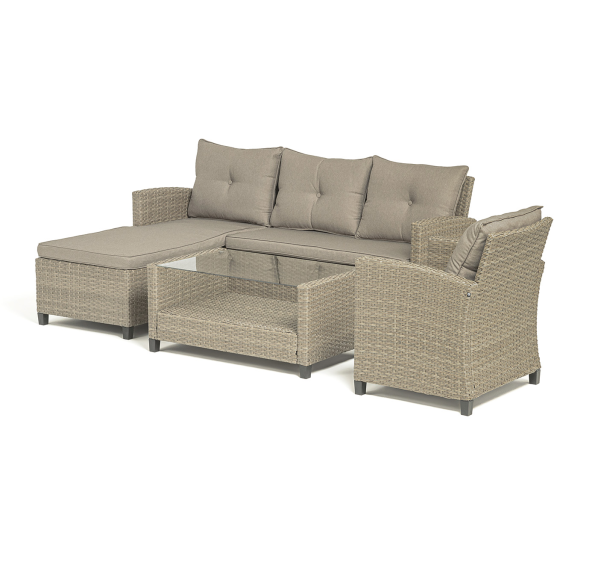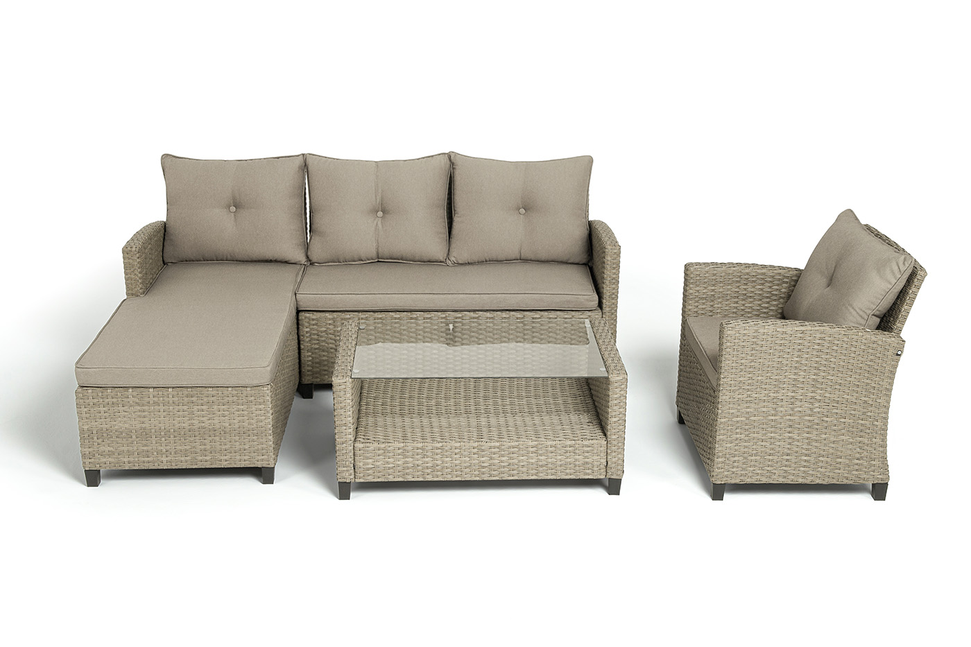 Плетеная мебель дополнена удобными подушками в бежевых чехлах. При их изготовлении используют полиэстер, плотность – 230гр/м2.
